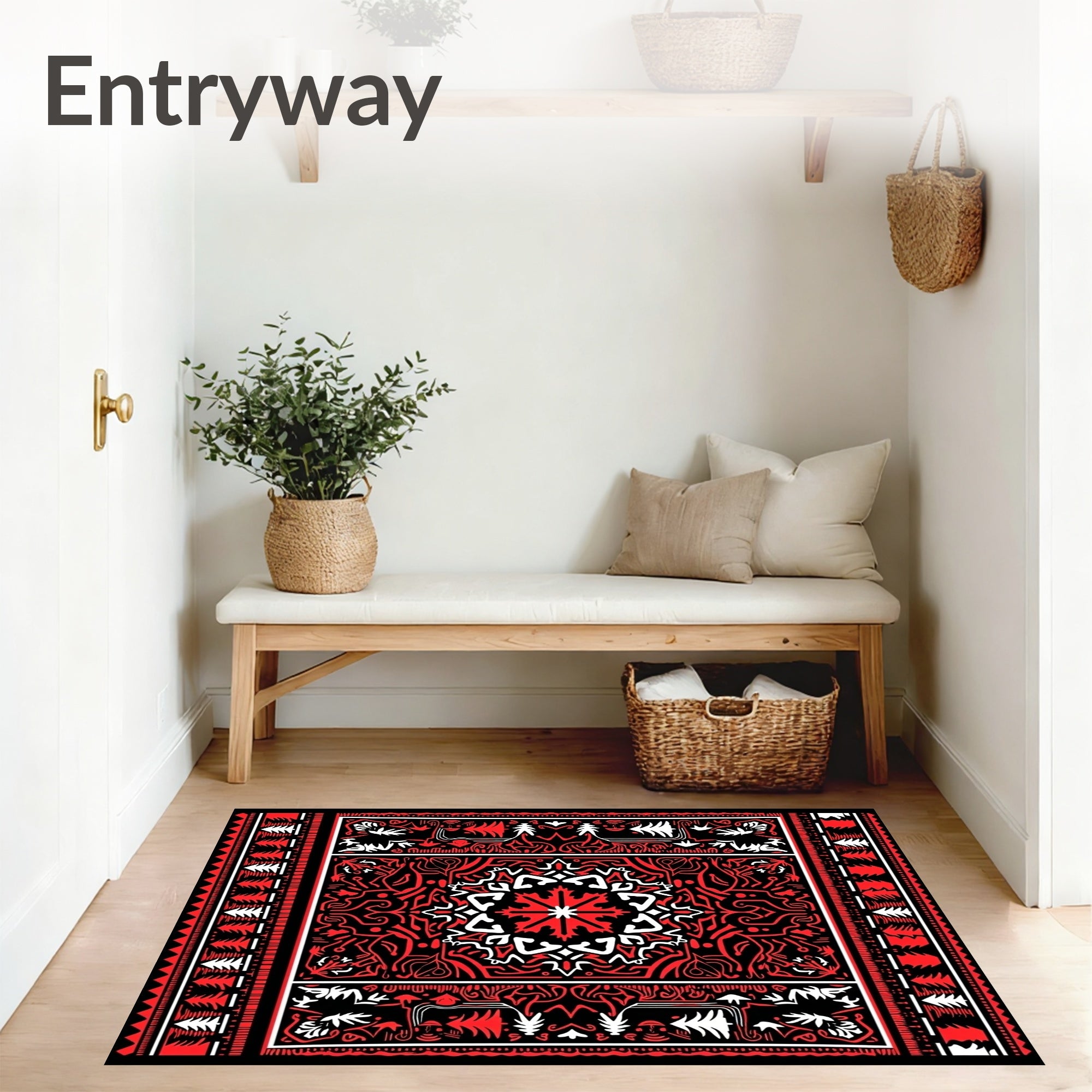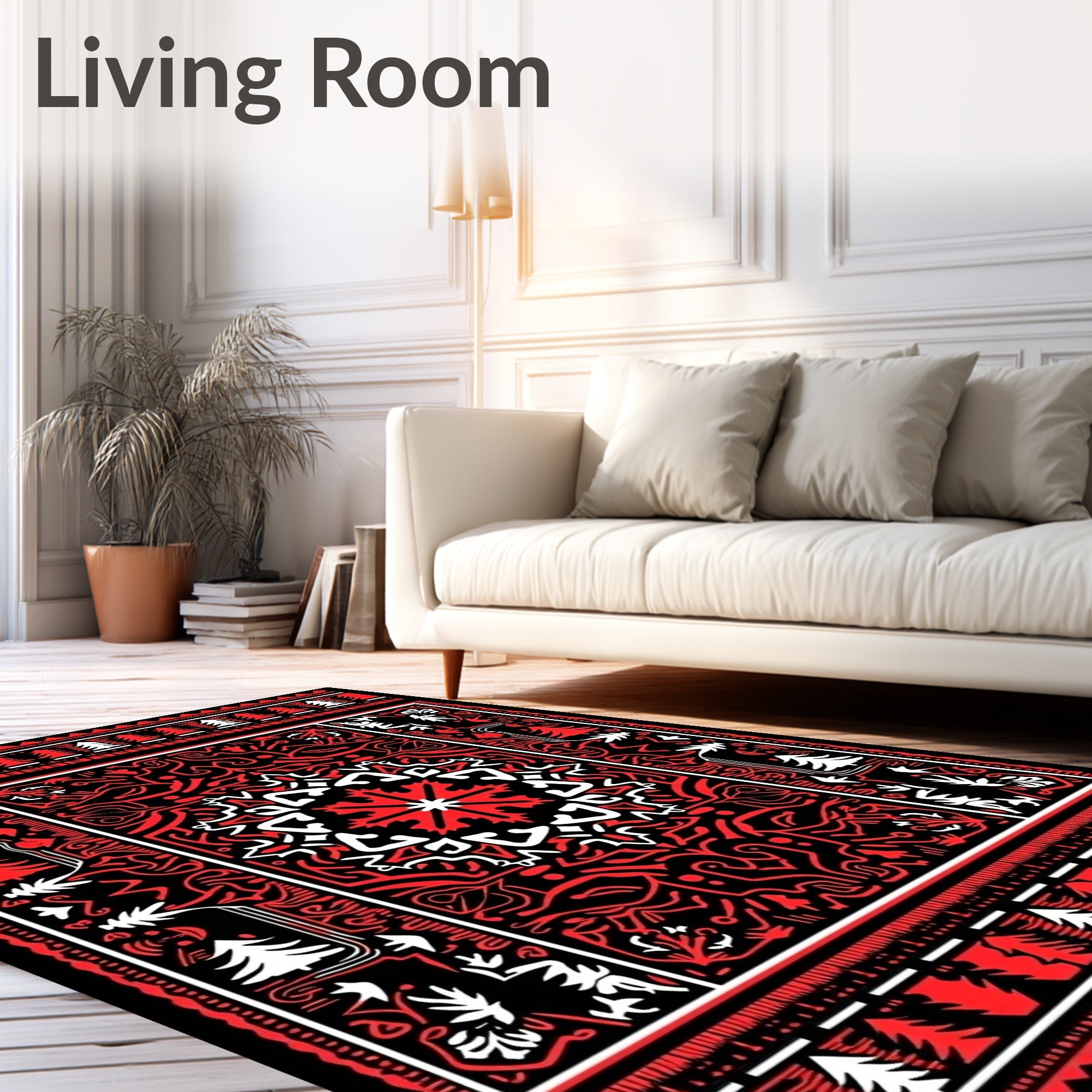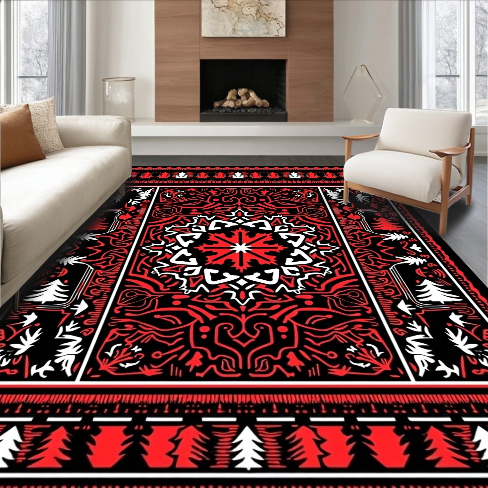 Flatwoven High Traffic Area Rug, Festive Snowflake Medallion with Elegant Pine Tree Motifs, Non Slip, Stain Resistant, Washable Area Rugs for Living Room, Bedroom (Black) Overview: