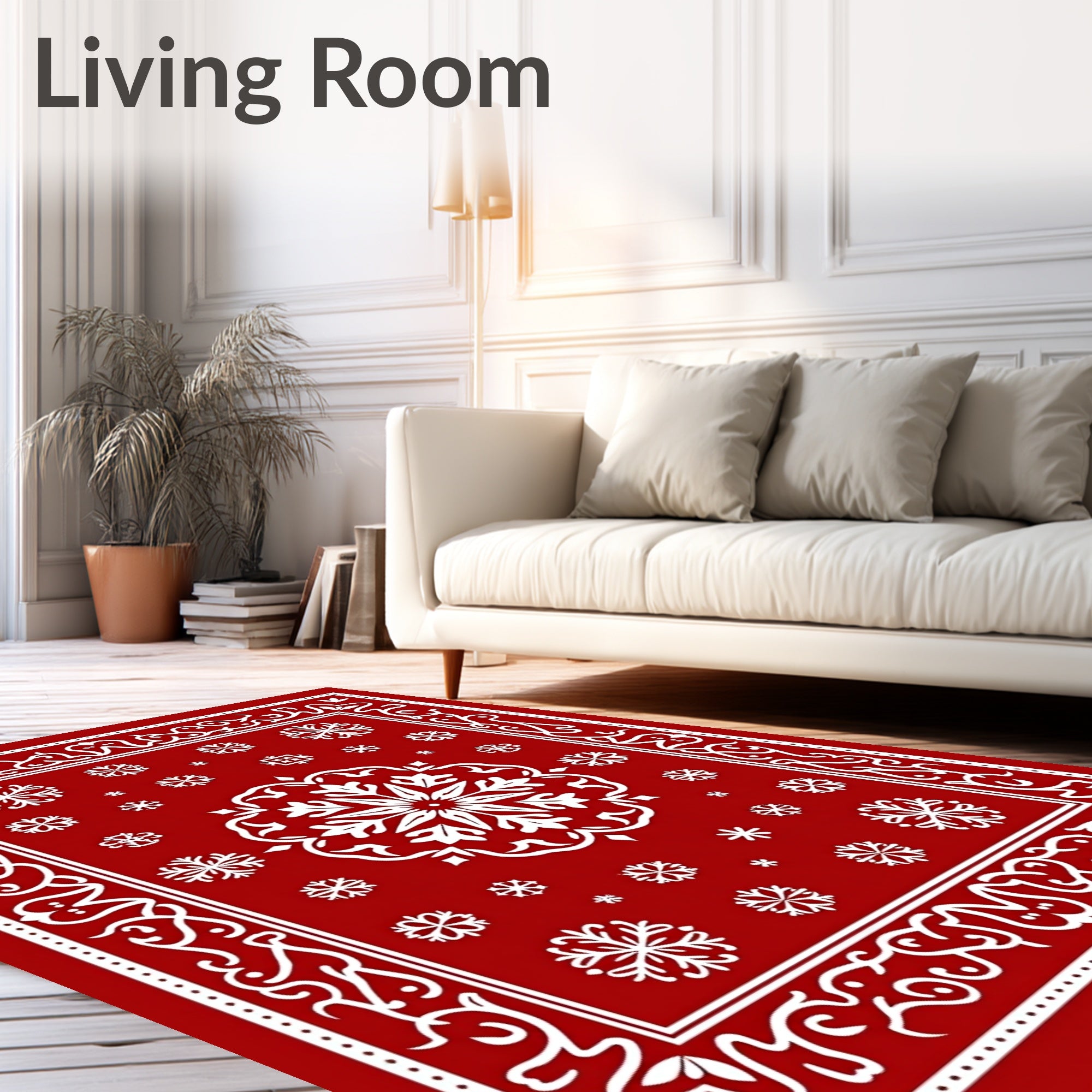 Ultra Soft Area Rug, Non Slip, Stain Resistant, Washable Area Rugs for Living Room, Bedroom, Festive Snowflake Medallion with Gold Accents and Elegant Swirls(Red) Overview: