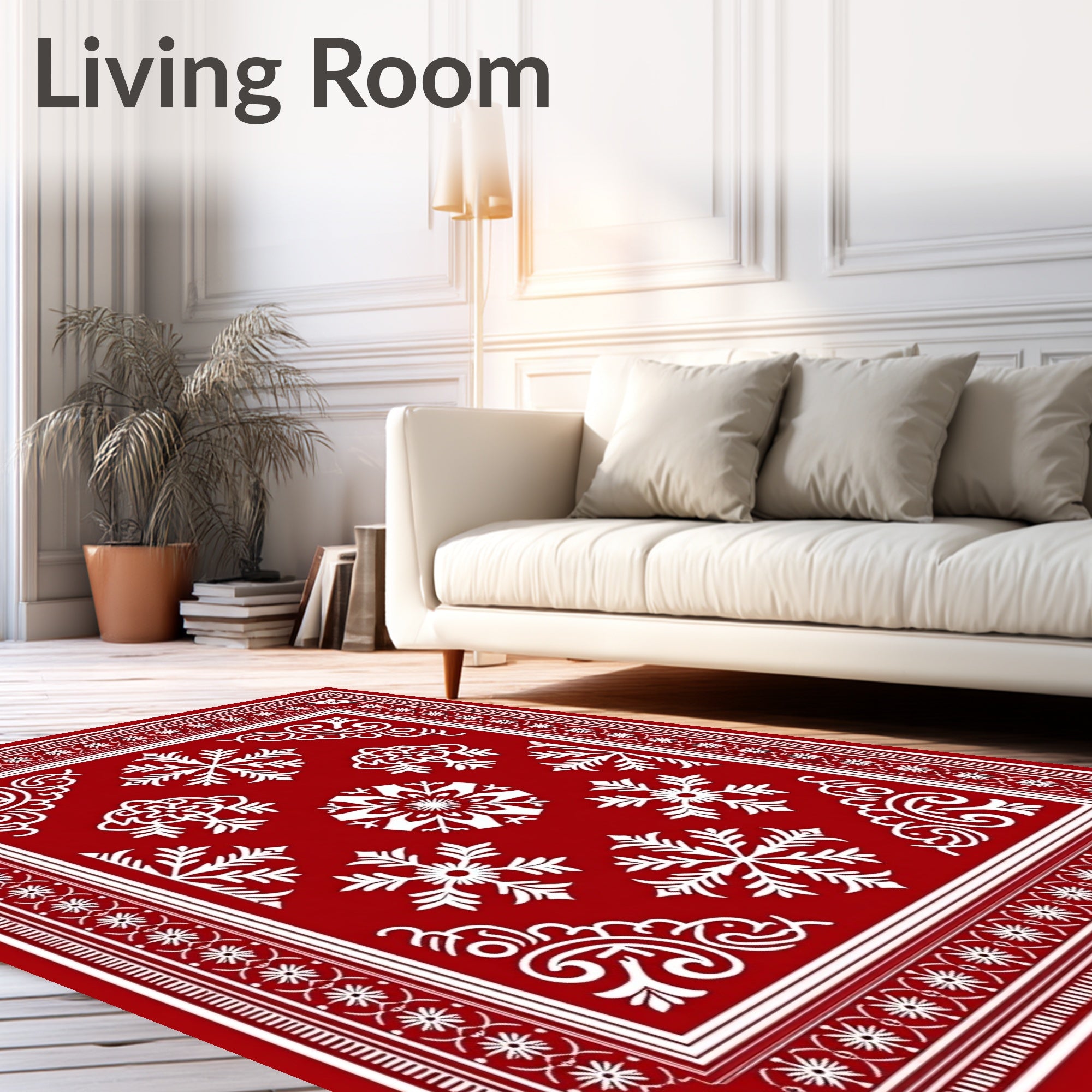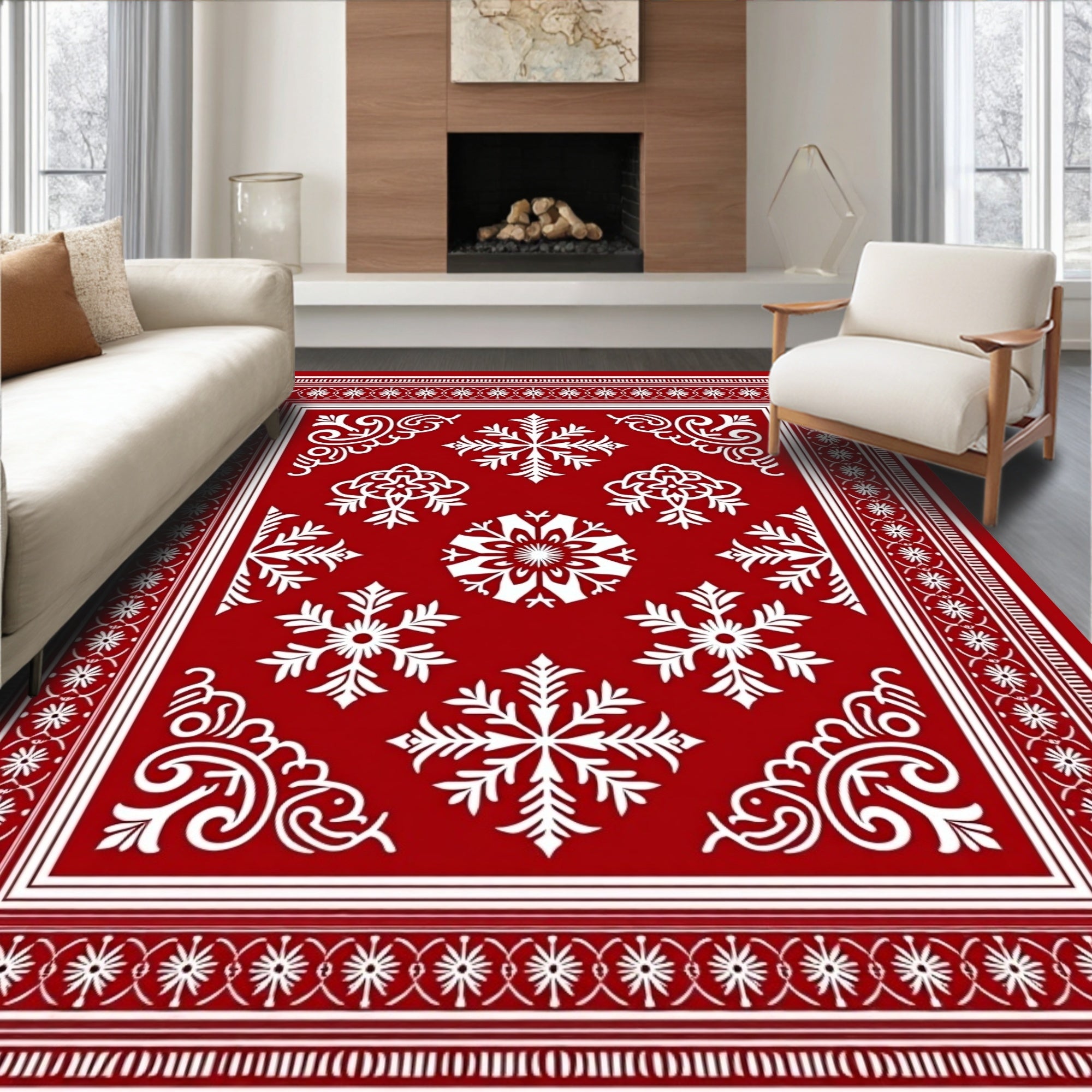 Ultra Soft Area Rug, Non Slip, Stain Resistant, Washable Area Rugs for Living Room, Bedroom, Festive Snowflake Medallion with Nordic Motifs(Red) Overview:
