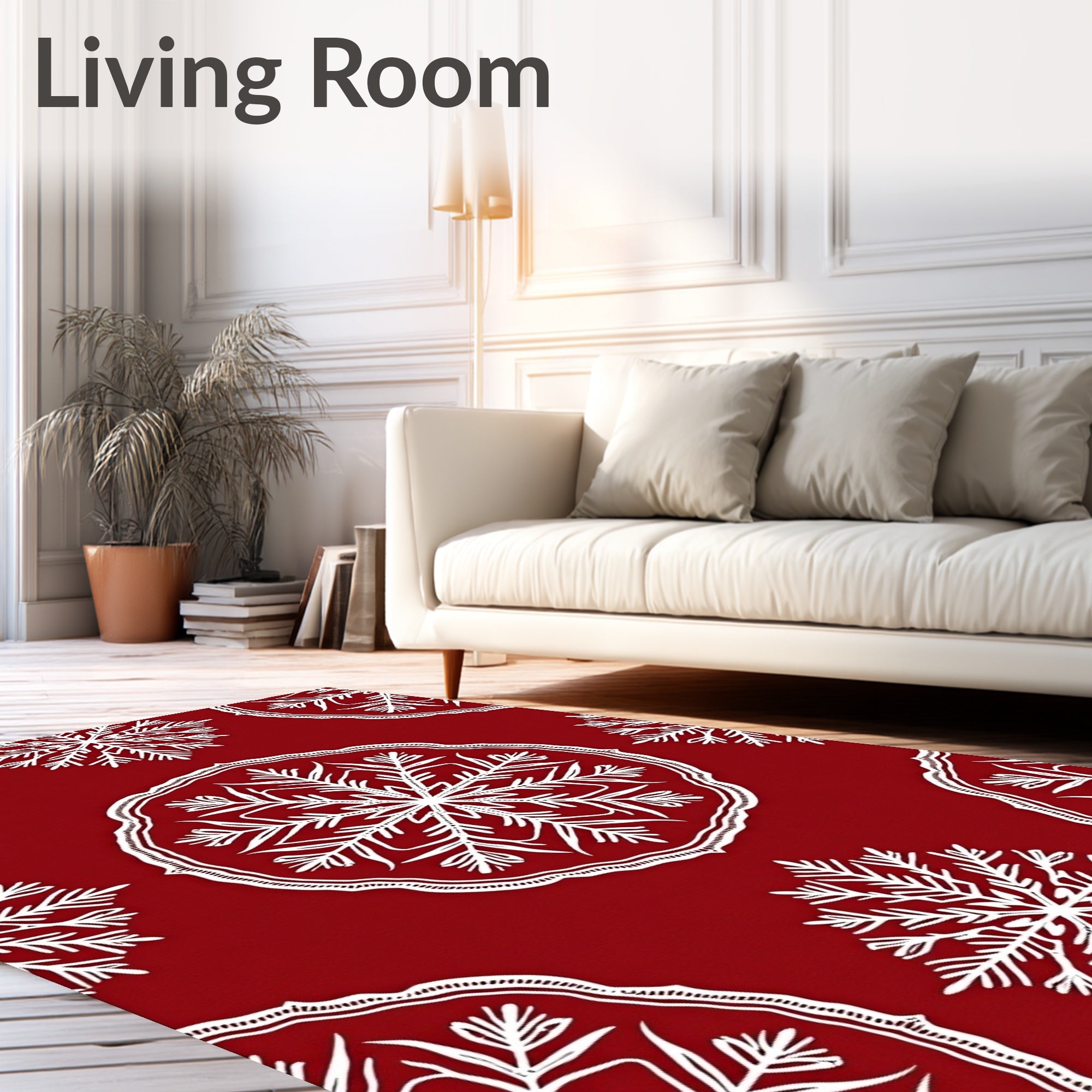 Ultra Soft Area Rug, Non Slip, Stain Resistant, Washable Area Rugs for Living Room, Bedroom, Festive Snowflake Swirl Winter Holiday Accent Circular Decoration(Red) Overview: