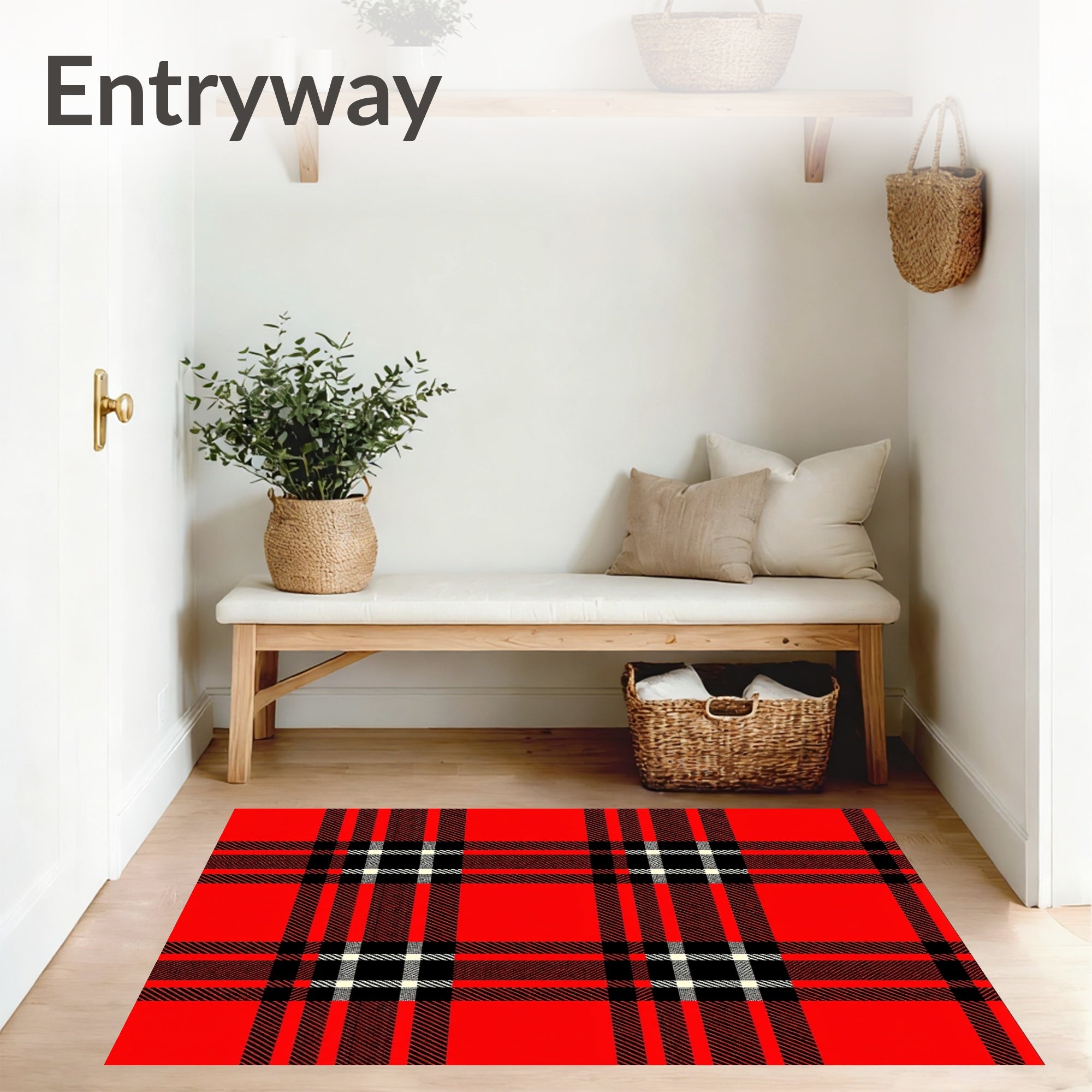 Ultra Soft Area Rug, Non Slip, Stain Resistant, Washable Area Rugs for Living Room, Bedroom, Festive Tartan With Strong Intersecting Stripes Design(Red) Overview: