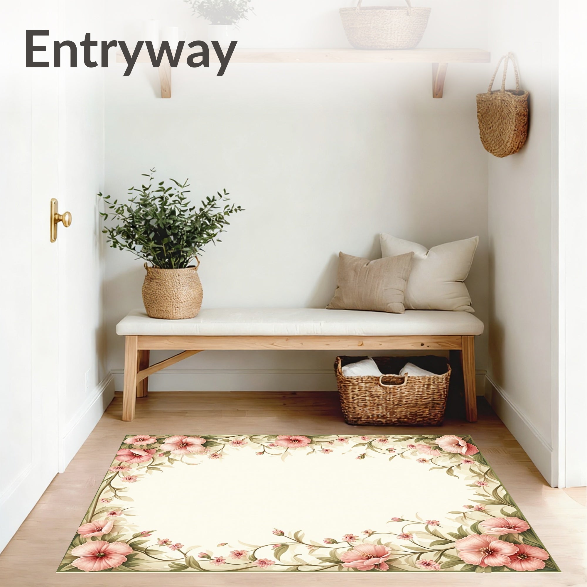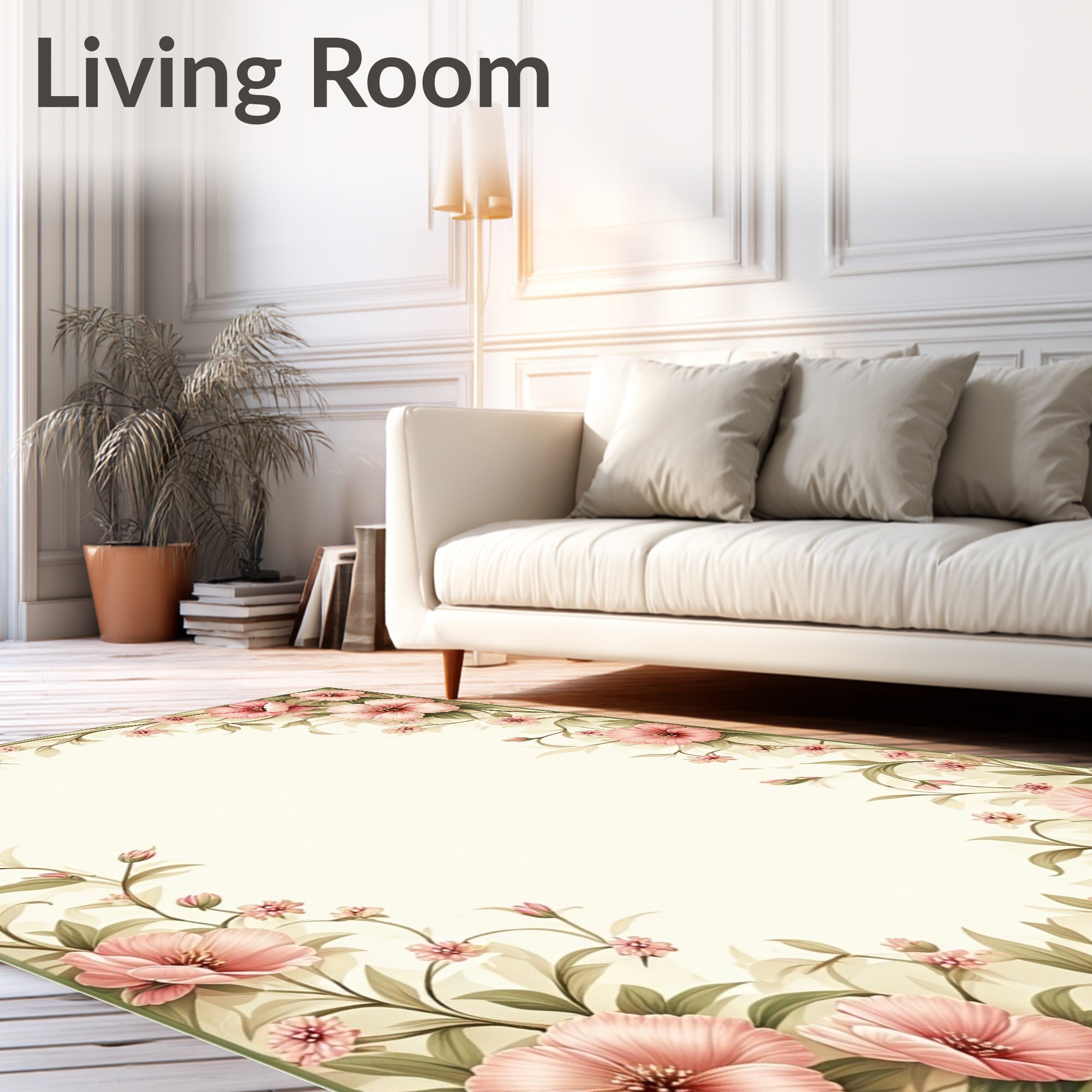 Flatwoven High Traffic Area Rug, Floral Rustic Country Style Pink and Sage, Non Slip, Stain Resistant, Washable Area Rugs for Living Room, Bedroom (Ivory) Overview: