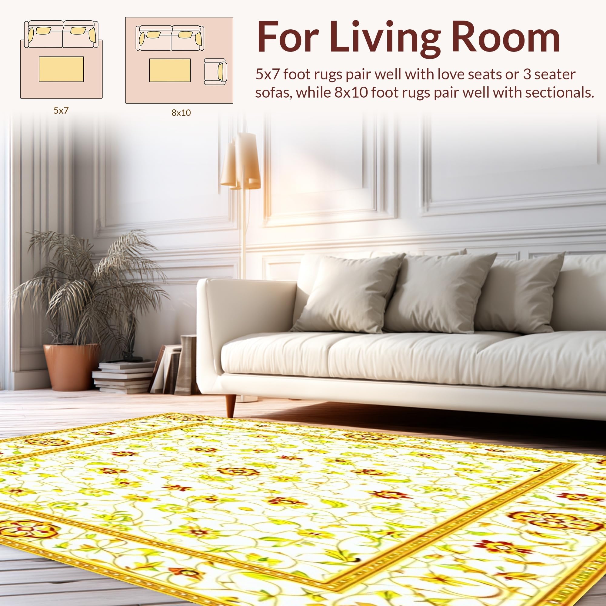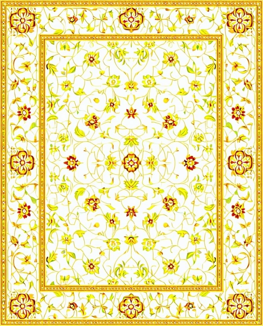 Ultra Soft Area Rug, Non Slip, Stain Resistant, Washable Area Rugs for Living Room, Bedroom, Floral Geometric Area with Cream and Mustard Accents(White) Overview: