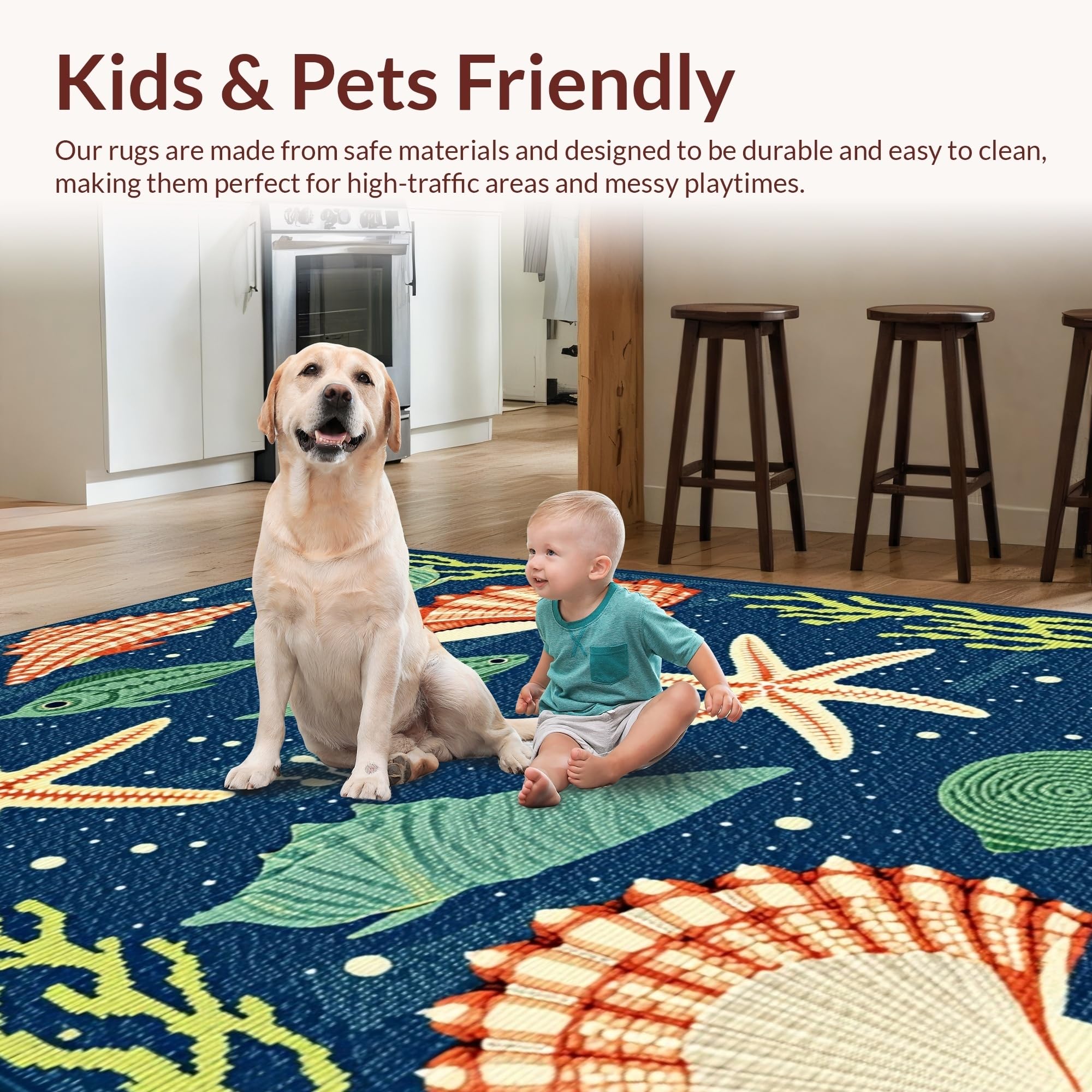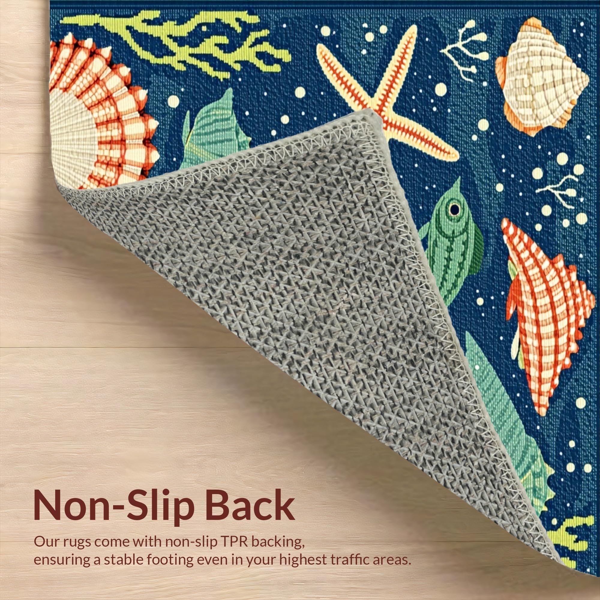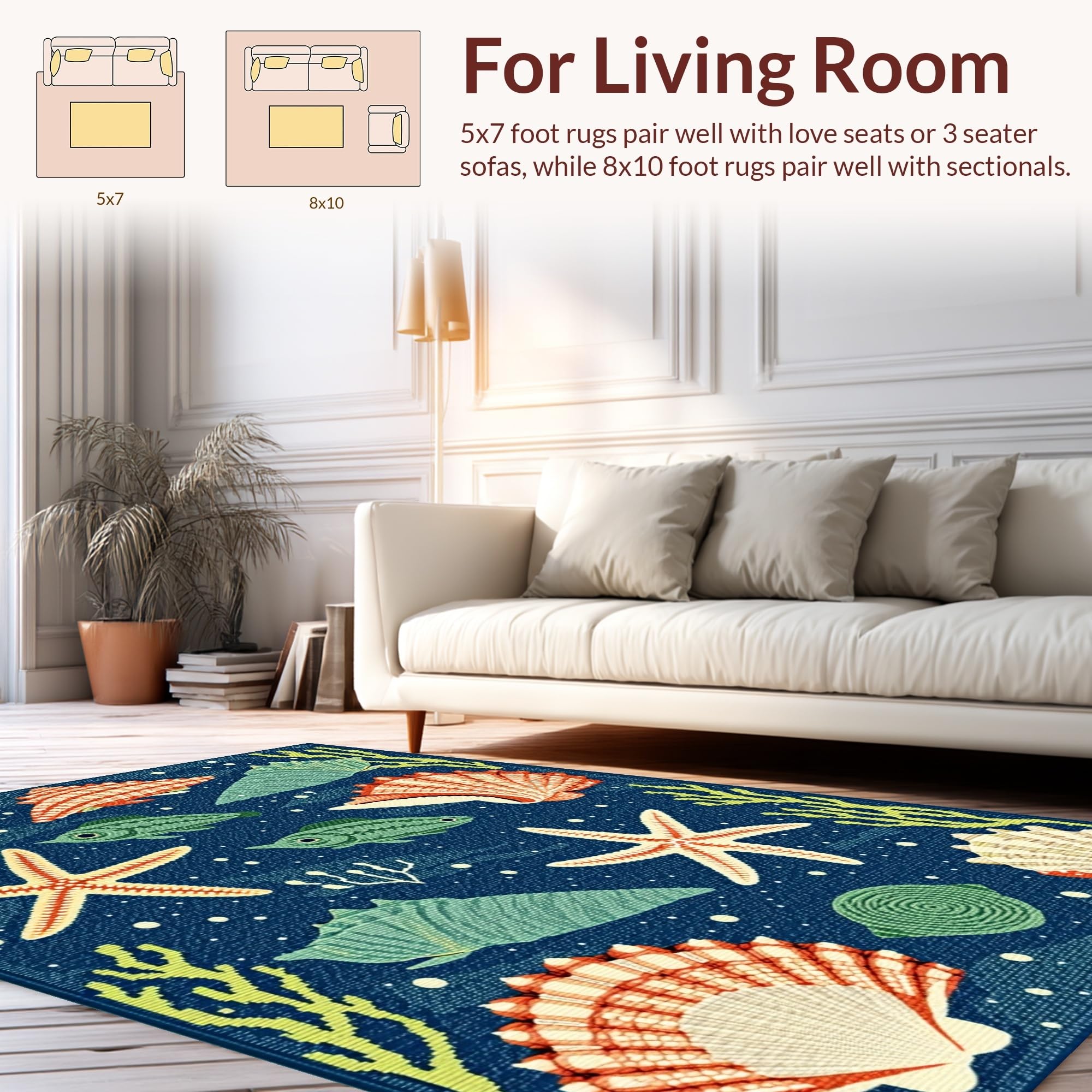 Ultra Soft Area Rug, Non Slip, Stain Resistant, Washable Area Rugs for Living Room, Bedroom, Fresh Marine Life Graphic Style(Blue) Overview: