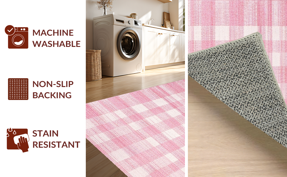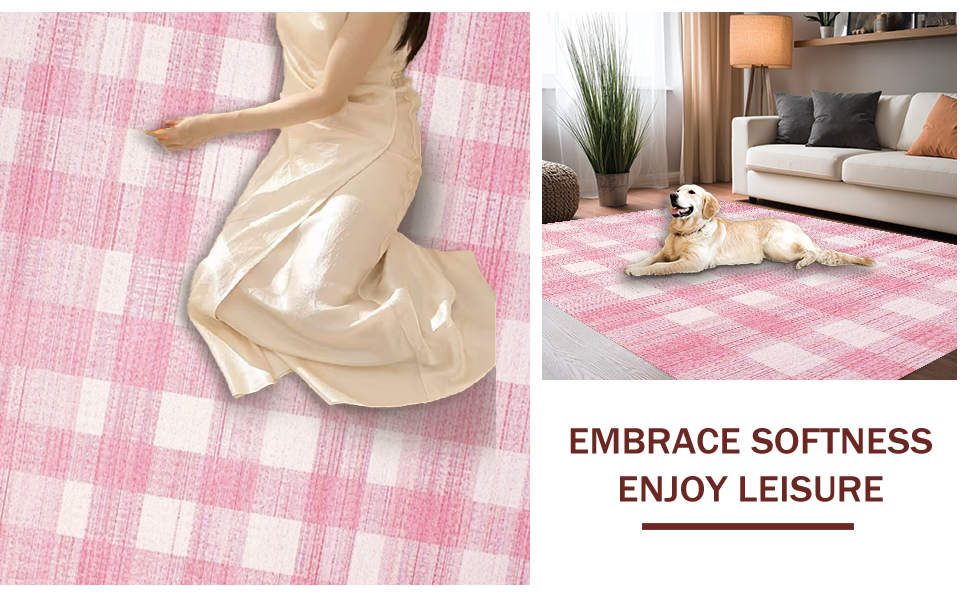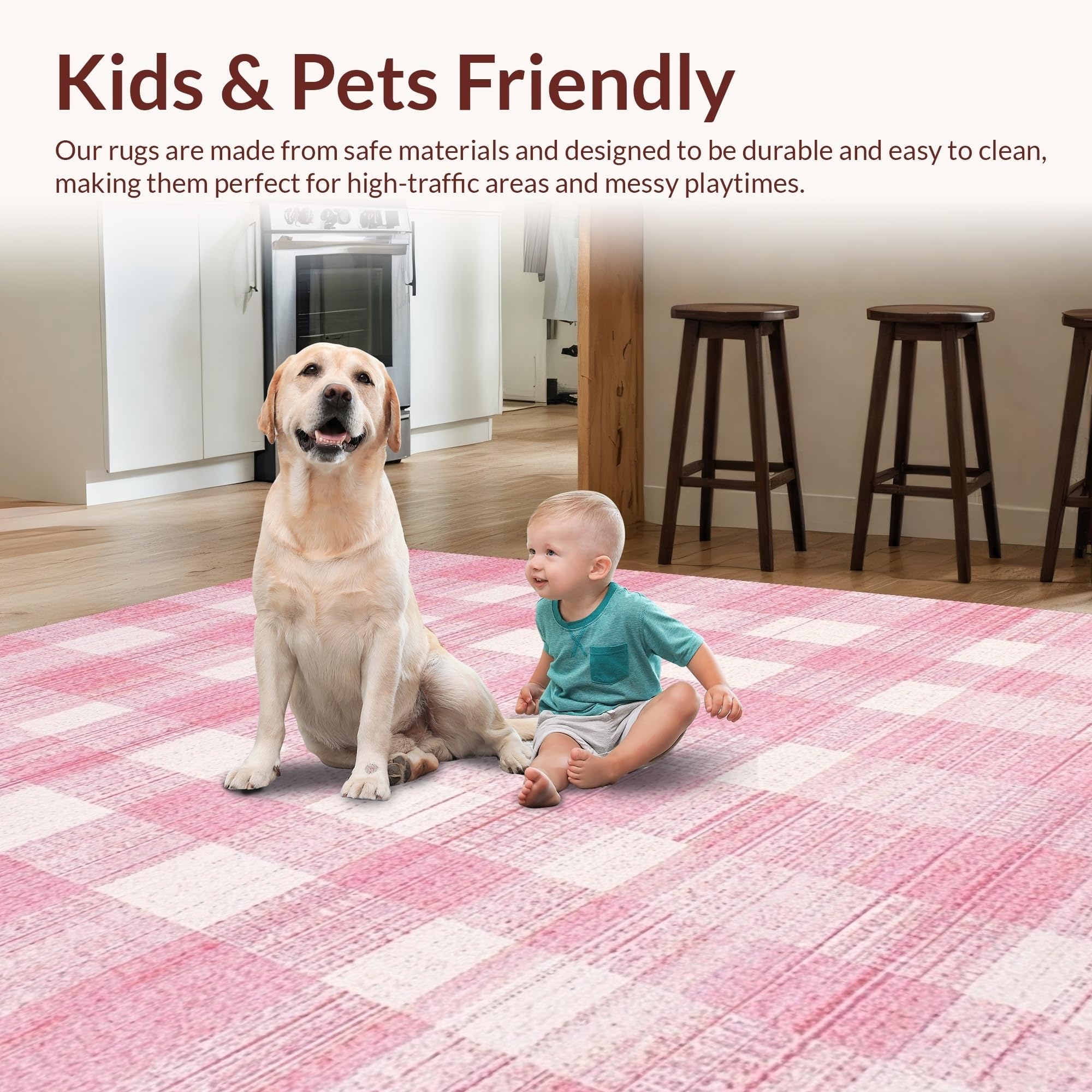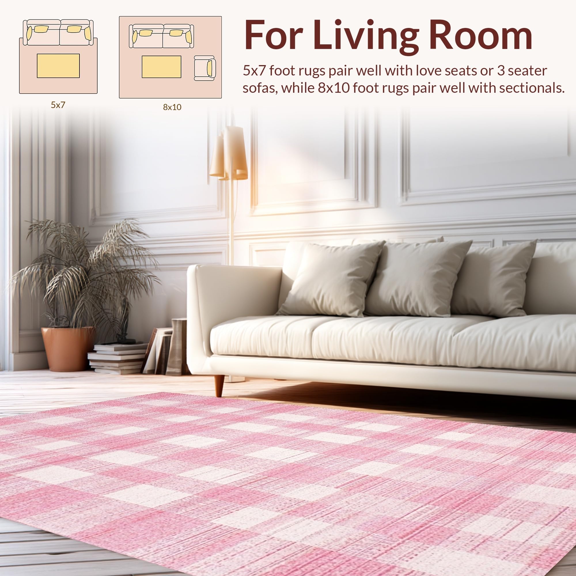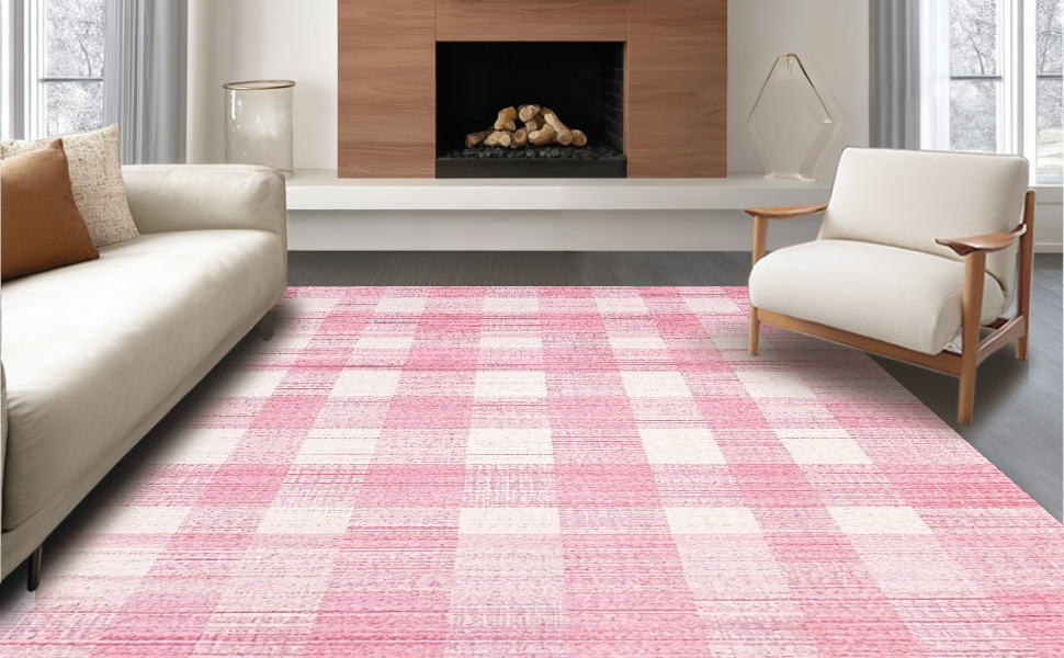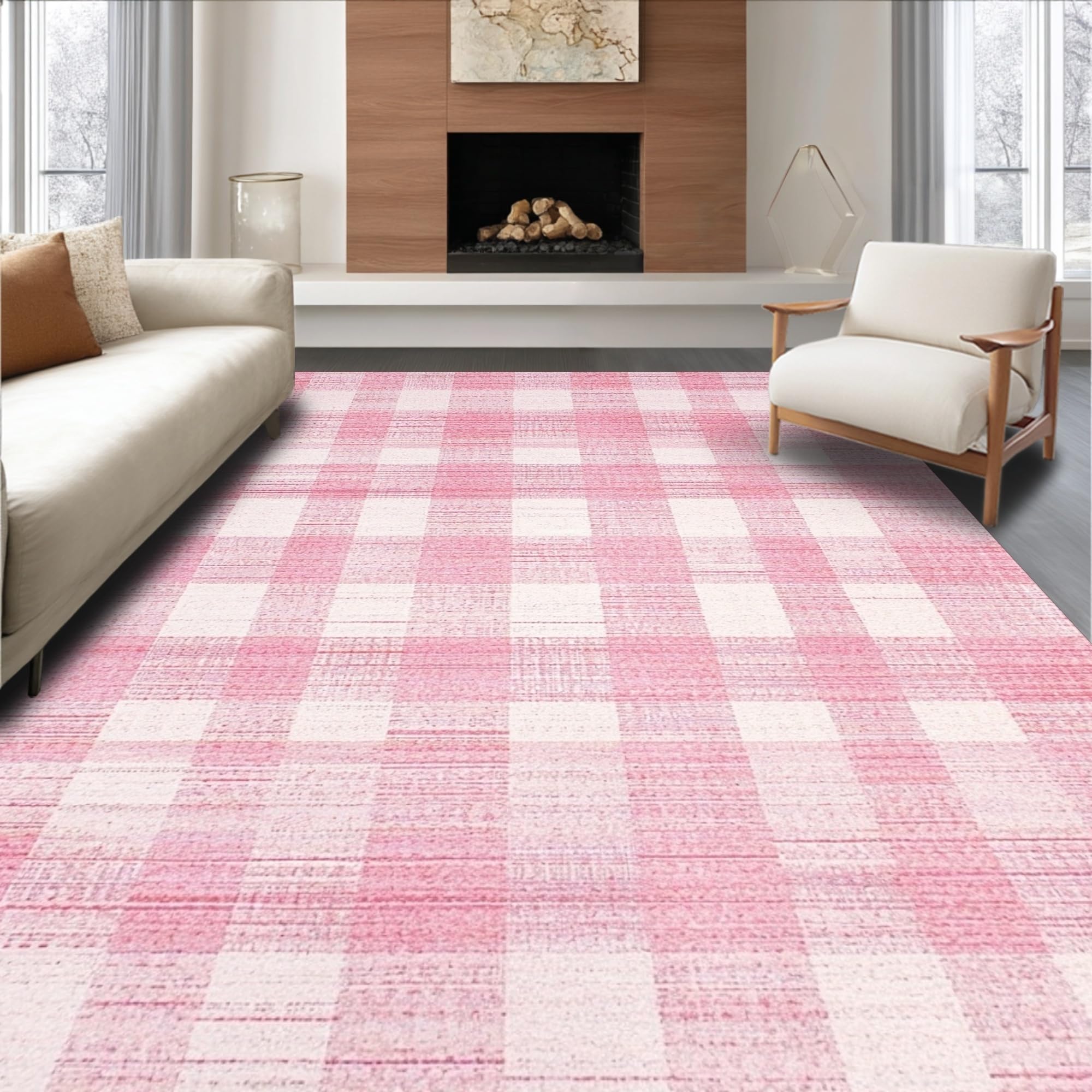 Ultra Soft Area Rug, Non Slip, Stain Resistant, Washable Area Rugs for Living Room, Bedroom, Fresh Minimalist Checkerboard Motif(Pink) Overview: