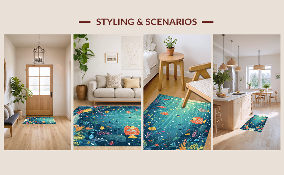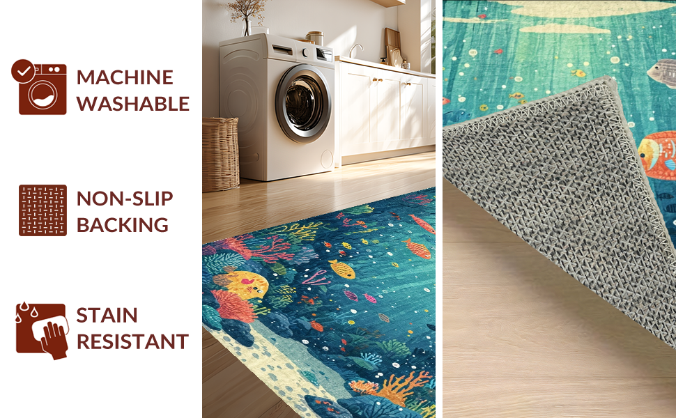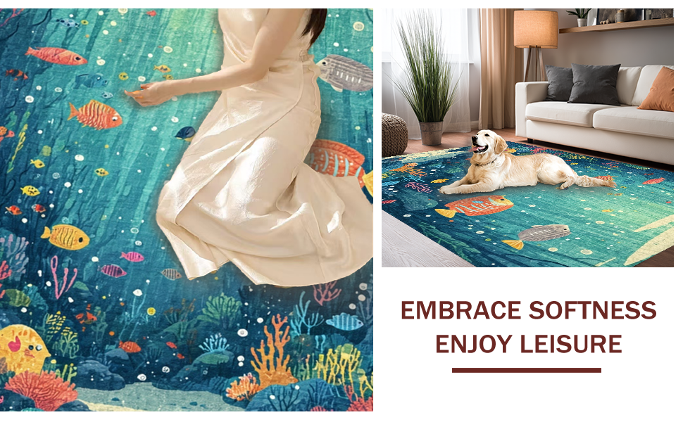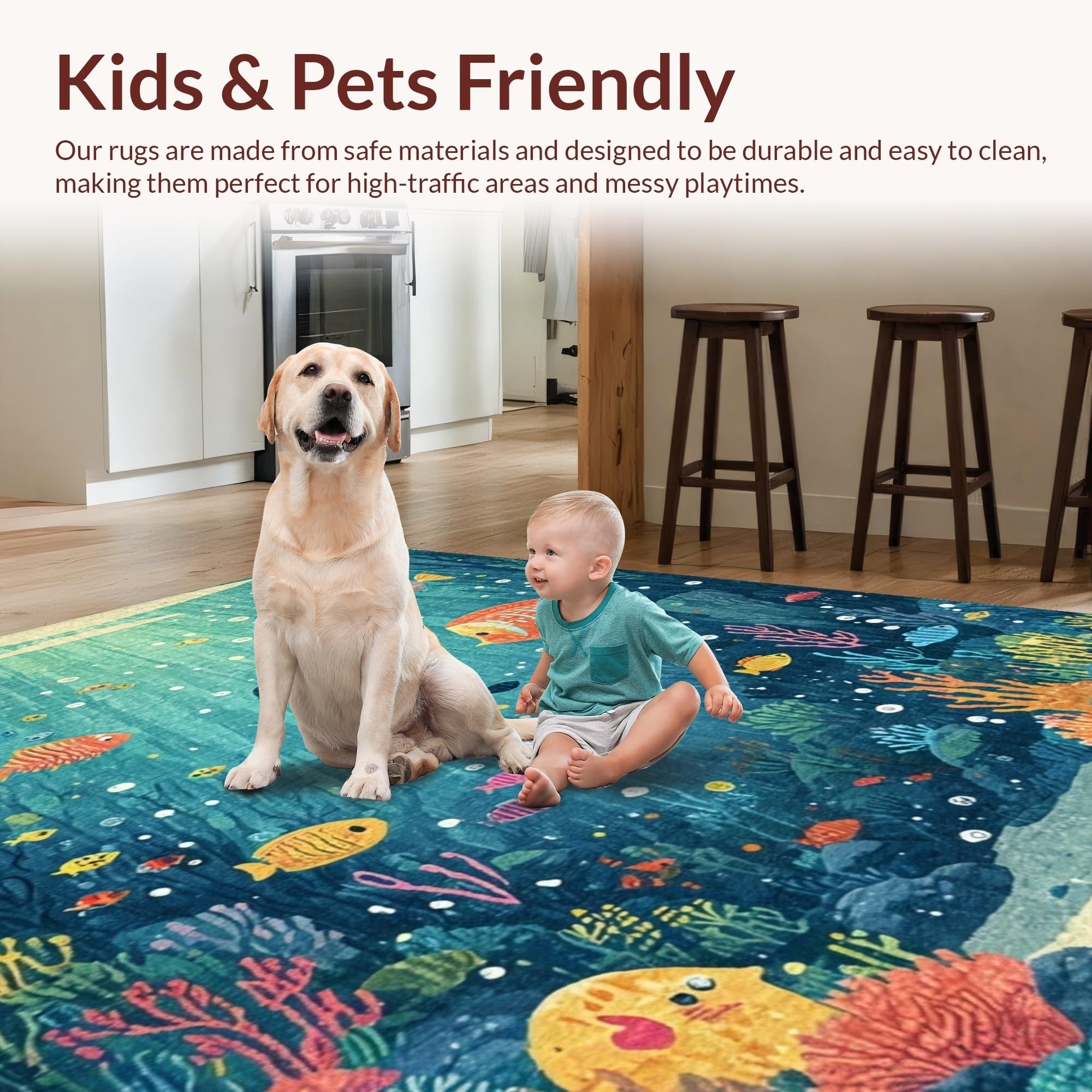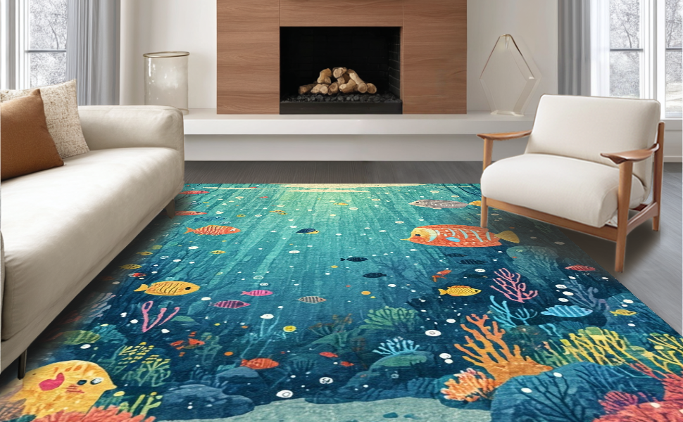 Ultra Soft Area Rug, Non Slip, Stain Resistant, Washable Area Rugs for Living Room, Bedroom, Fun Ocean World Rug for Kids with Marine Life and Learning Shapes(Blue) Overview: