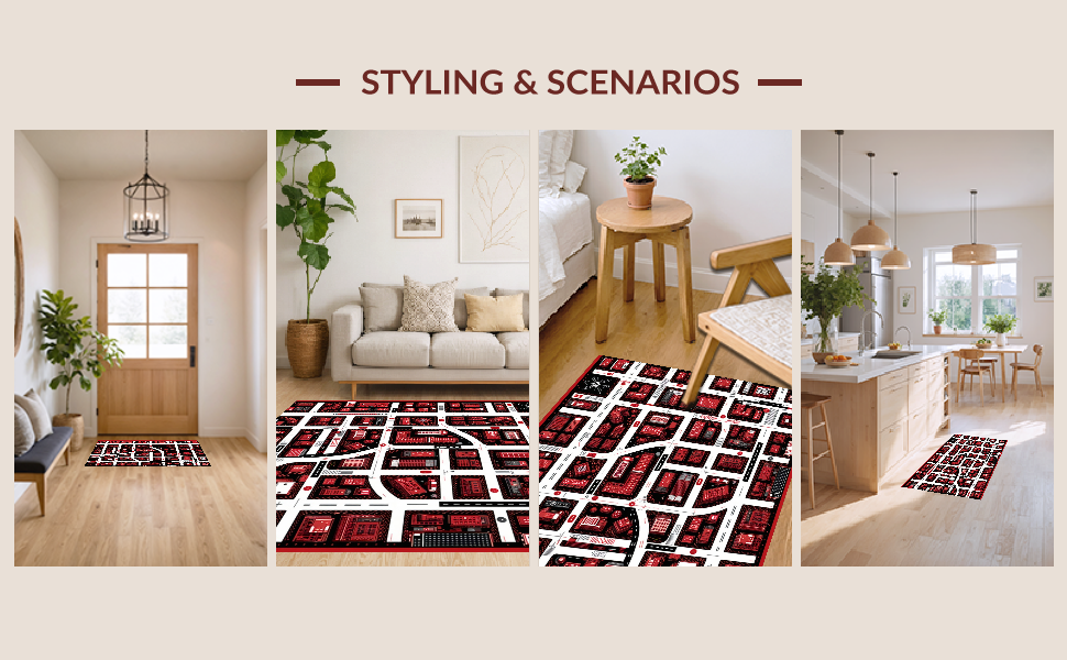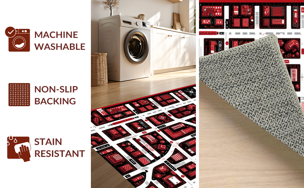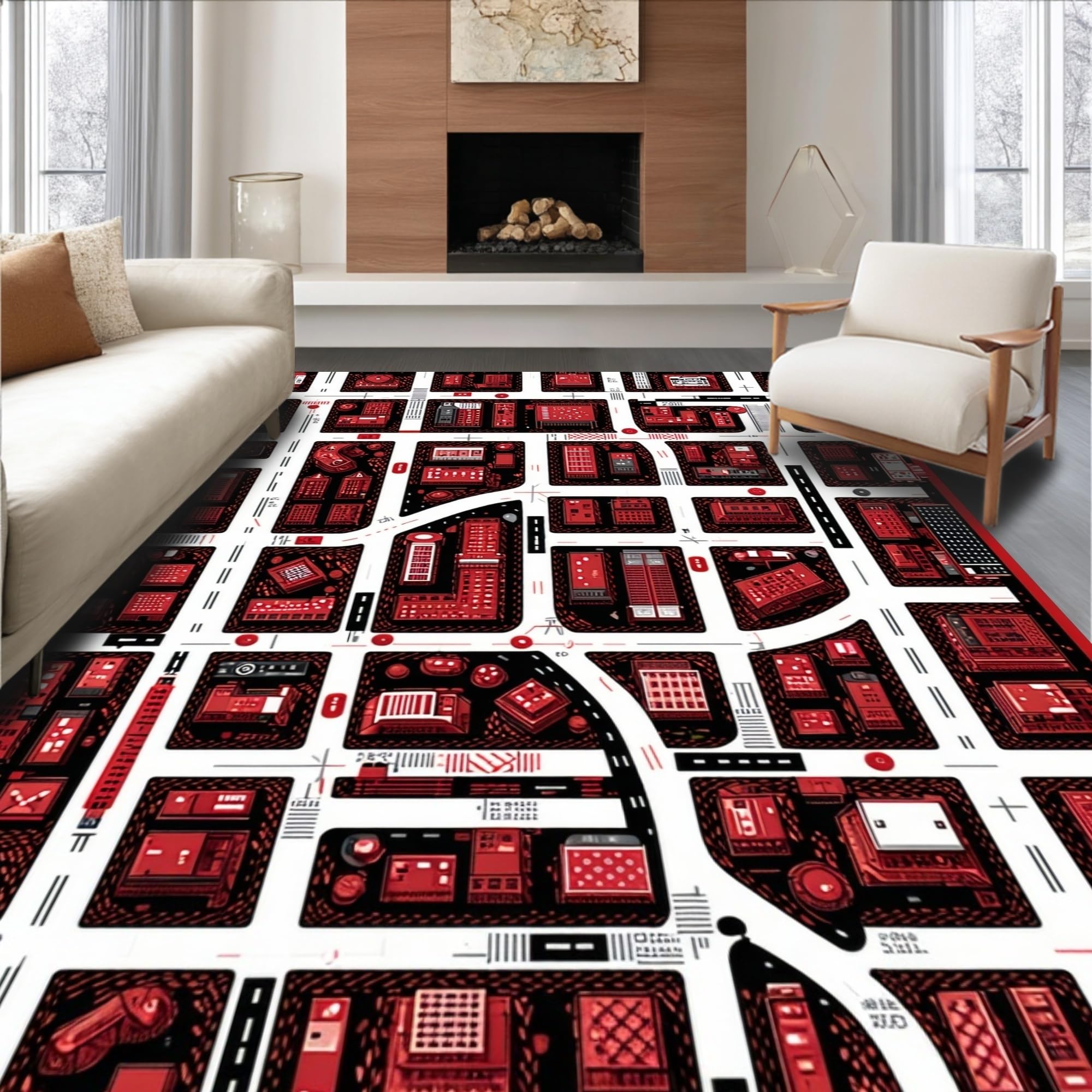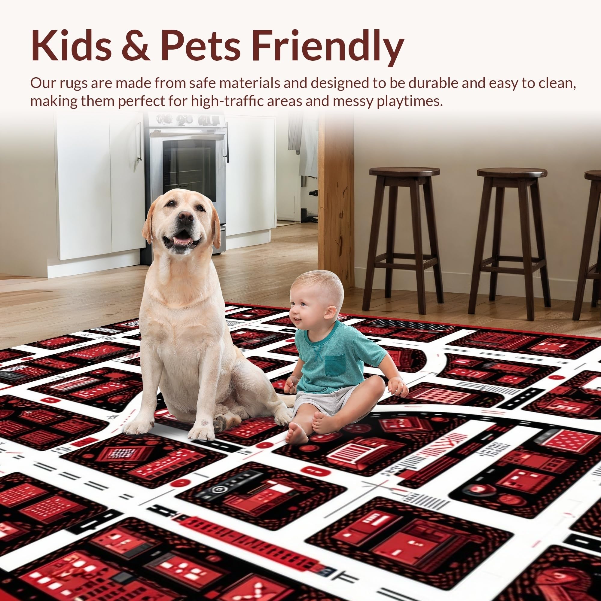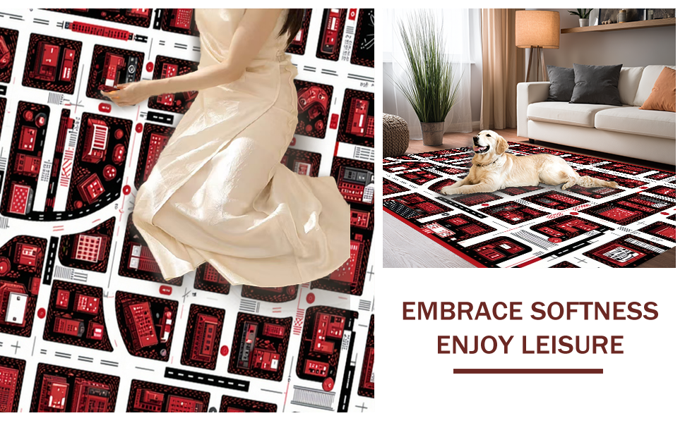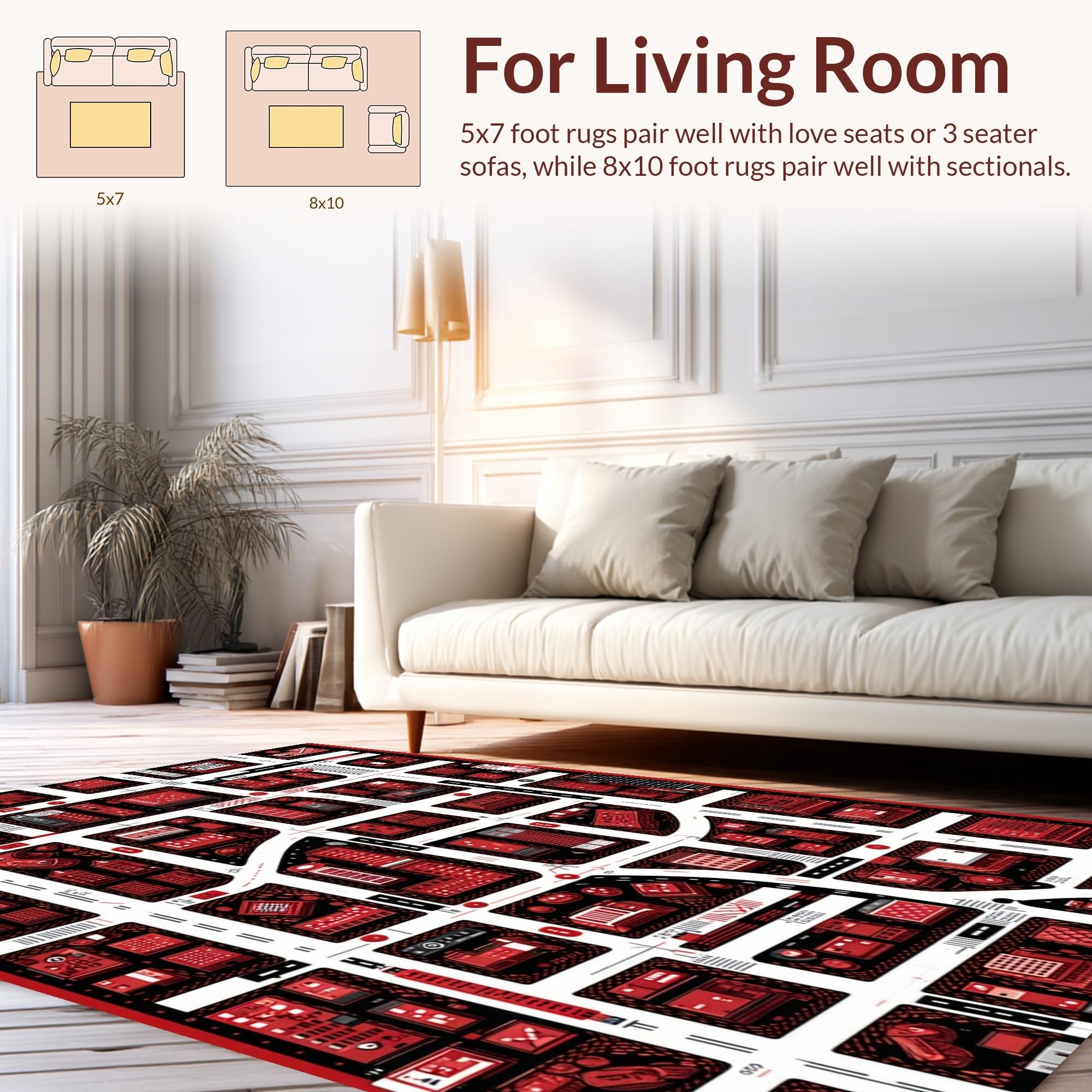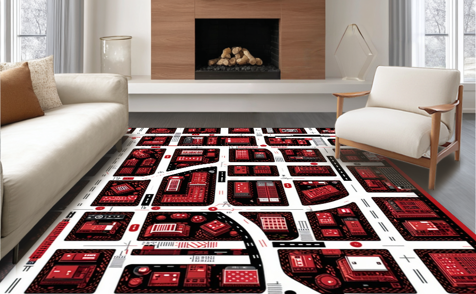 Ultra Soft Area Rug, Non Slip, Stain Resistant, Washable Area Rugs for Living Room, Bedroom, Fun Urban Journey Play Surface(Red) Overview: