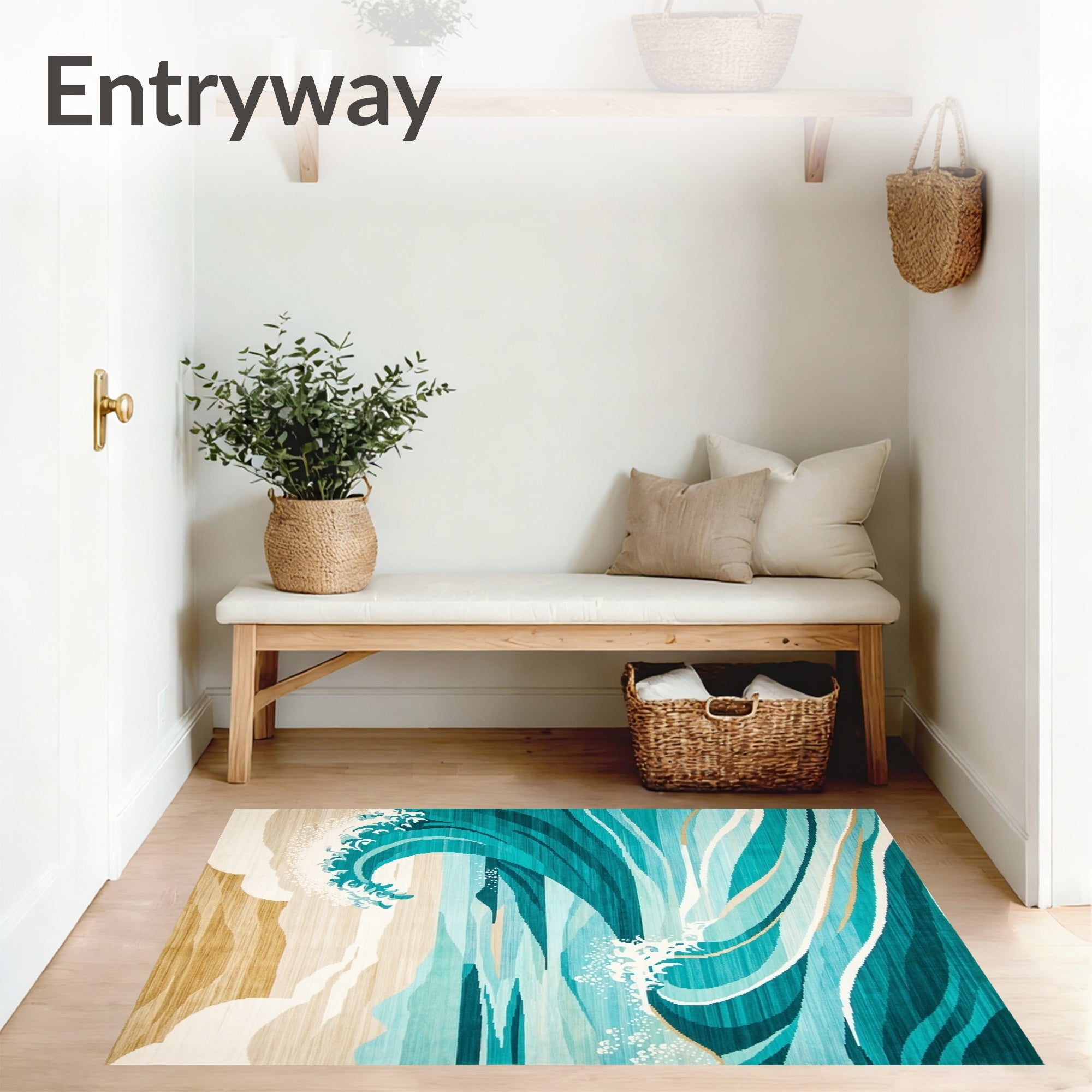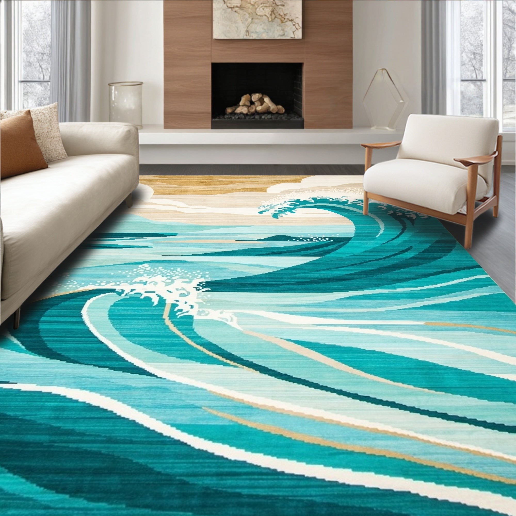 Ultra Soft Area Rug, Non Slip, Stain Resistant, Washable Area Rugs for Living Room, Bedroom, Funky Wave Coastal Area Rug with Aqua and Beige Tones(Blue) Overview: