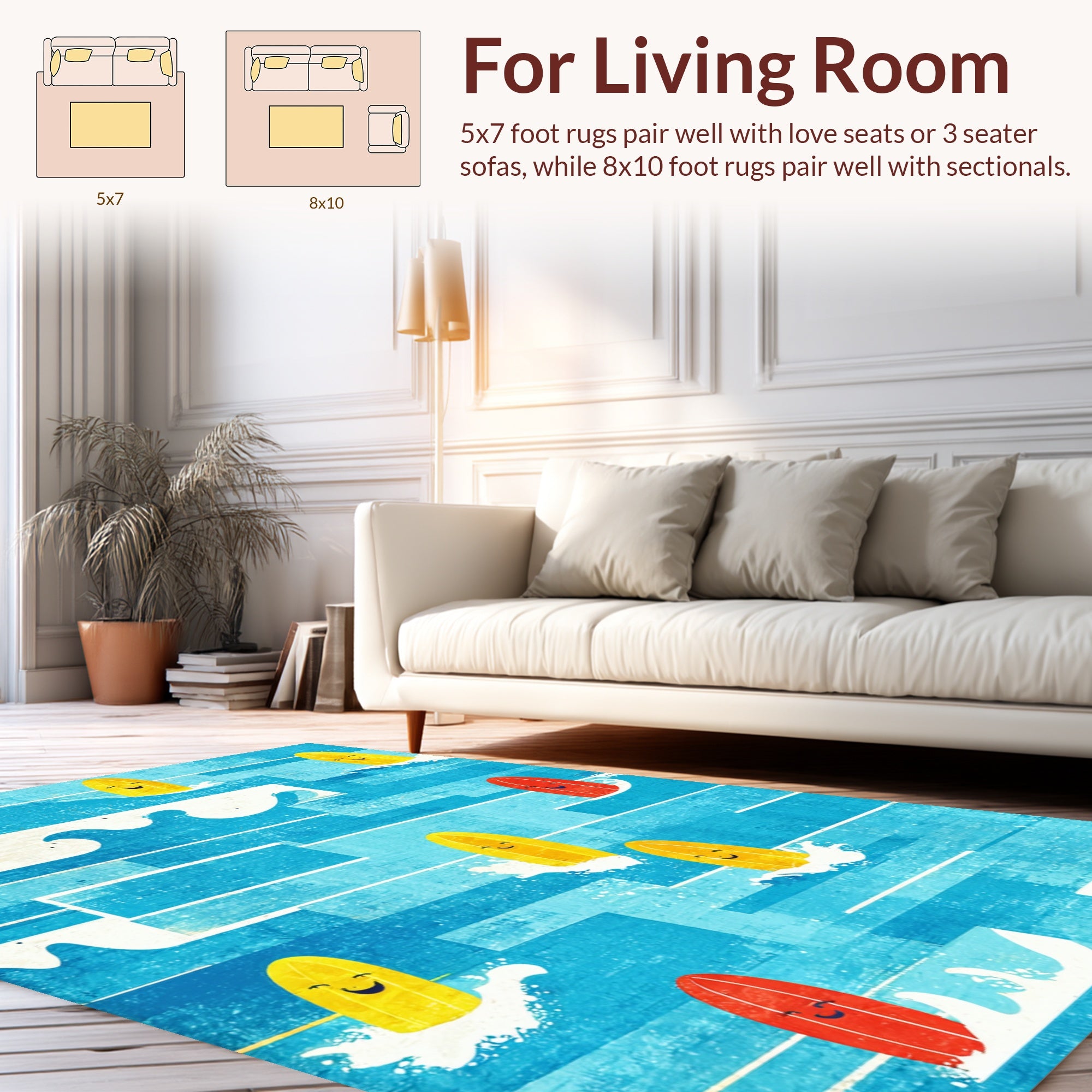 Ultra Soft Area Rug, Non Slip, Stain Resistant, Washable Area Rugs for Living Room, Bedroom, Funny Tropical Surf Rug Absorbent Bath Mat Coastal Ocean Wave Art Design(Blue) Overview: