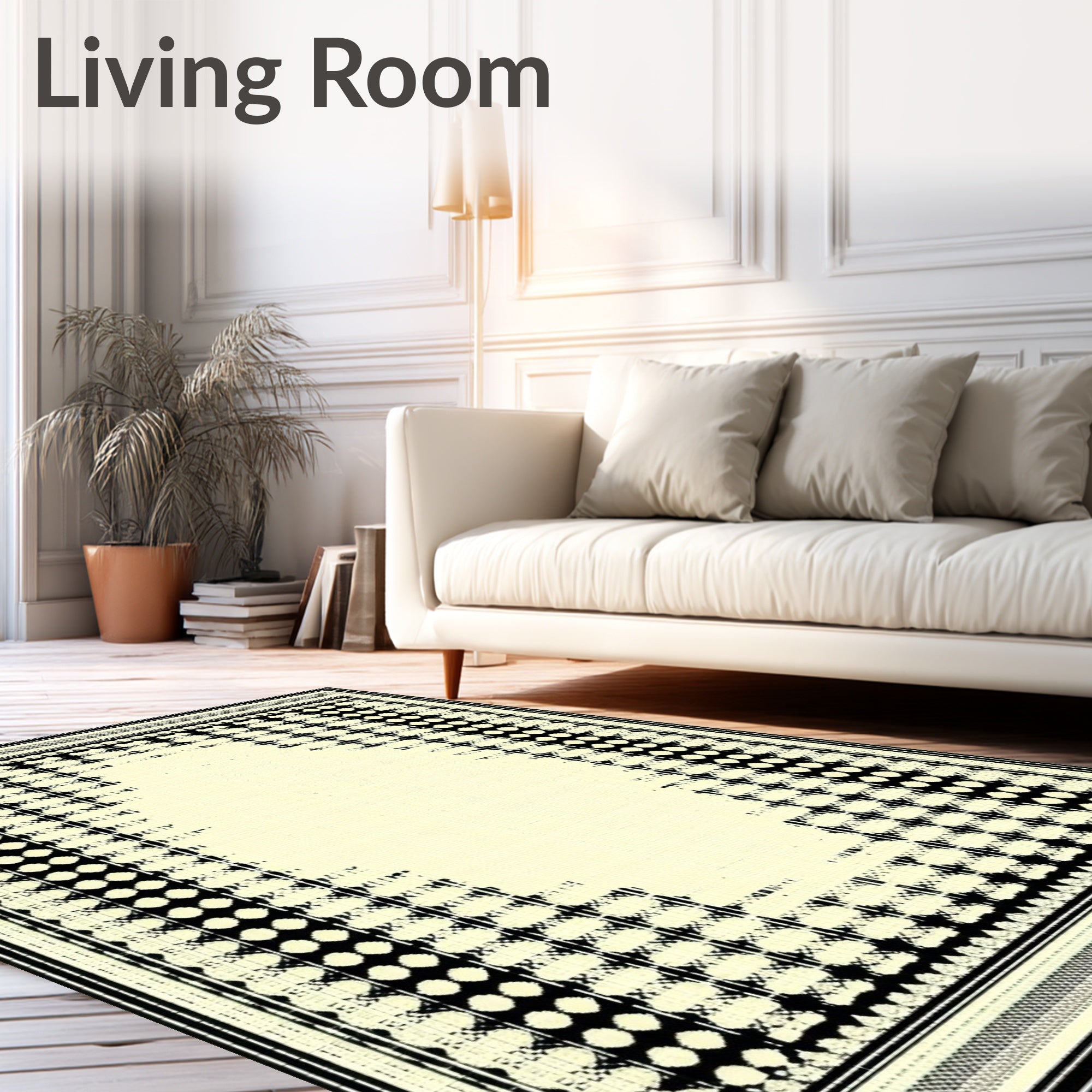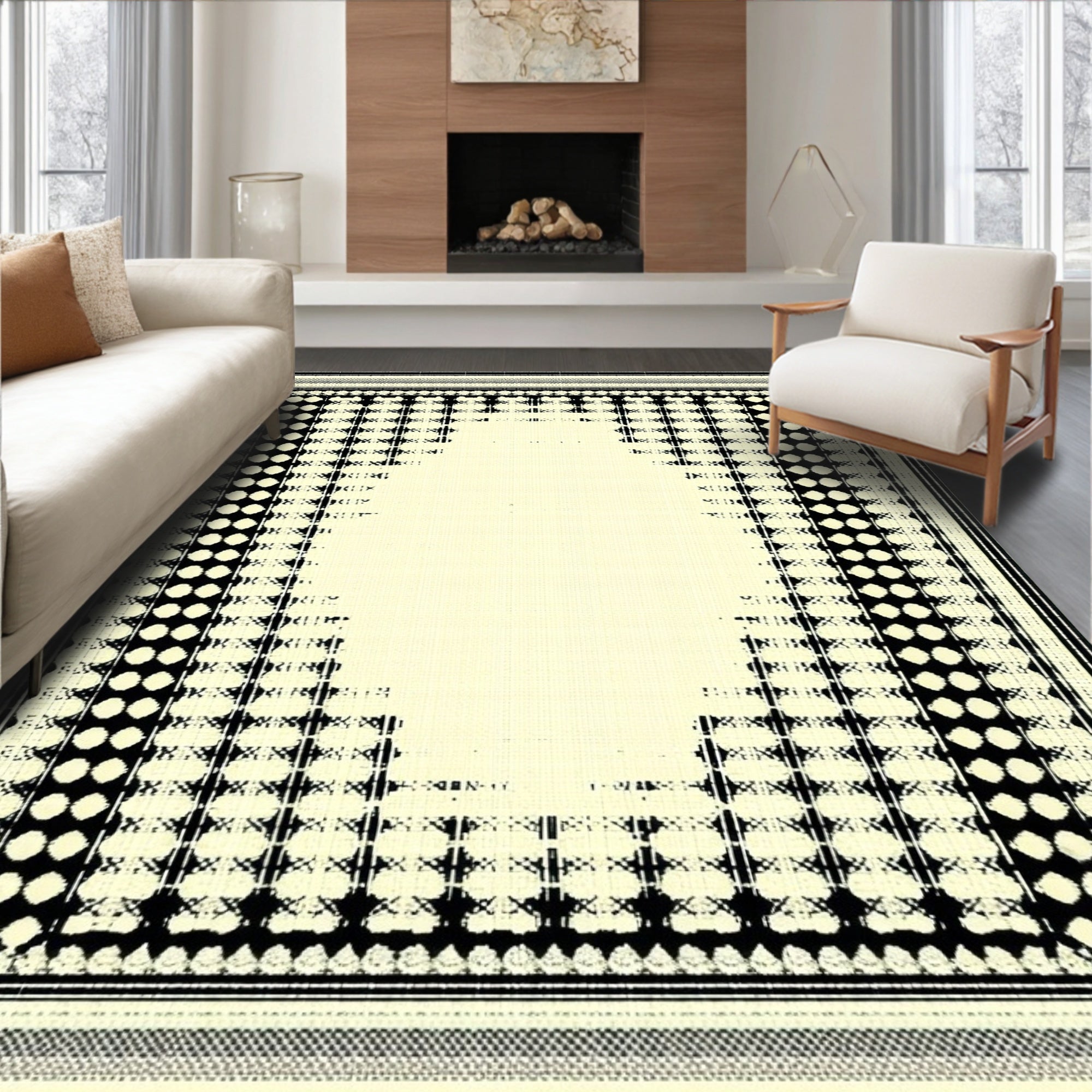 Ultra Soft Area Rug, Non Slip, Stain Resistant, Washable Area Rugs for Living Room, Bedroom, Geometric Border Area Cream and Black Modern Design Neutral Accent(Beige) Overview: