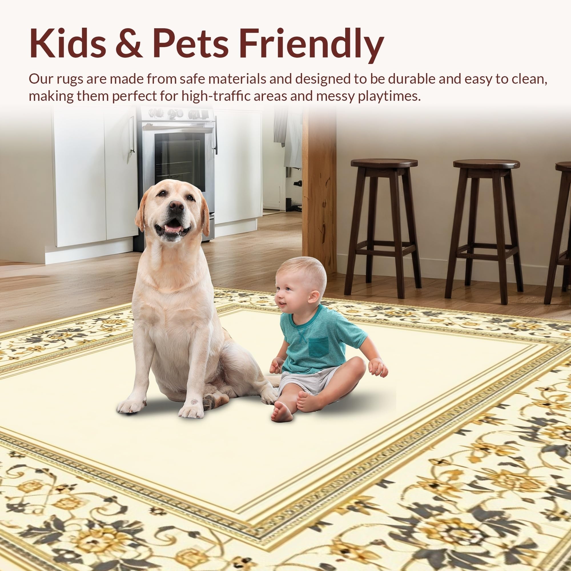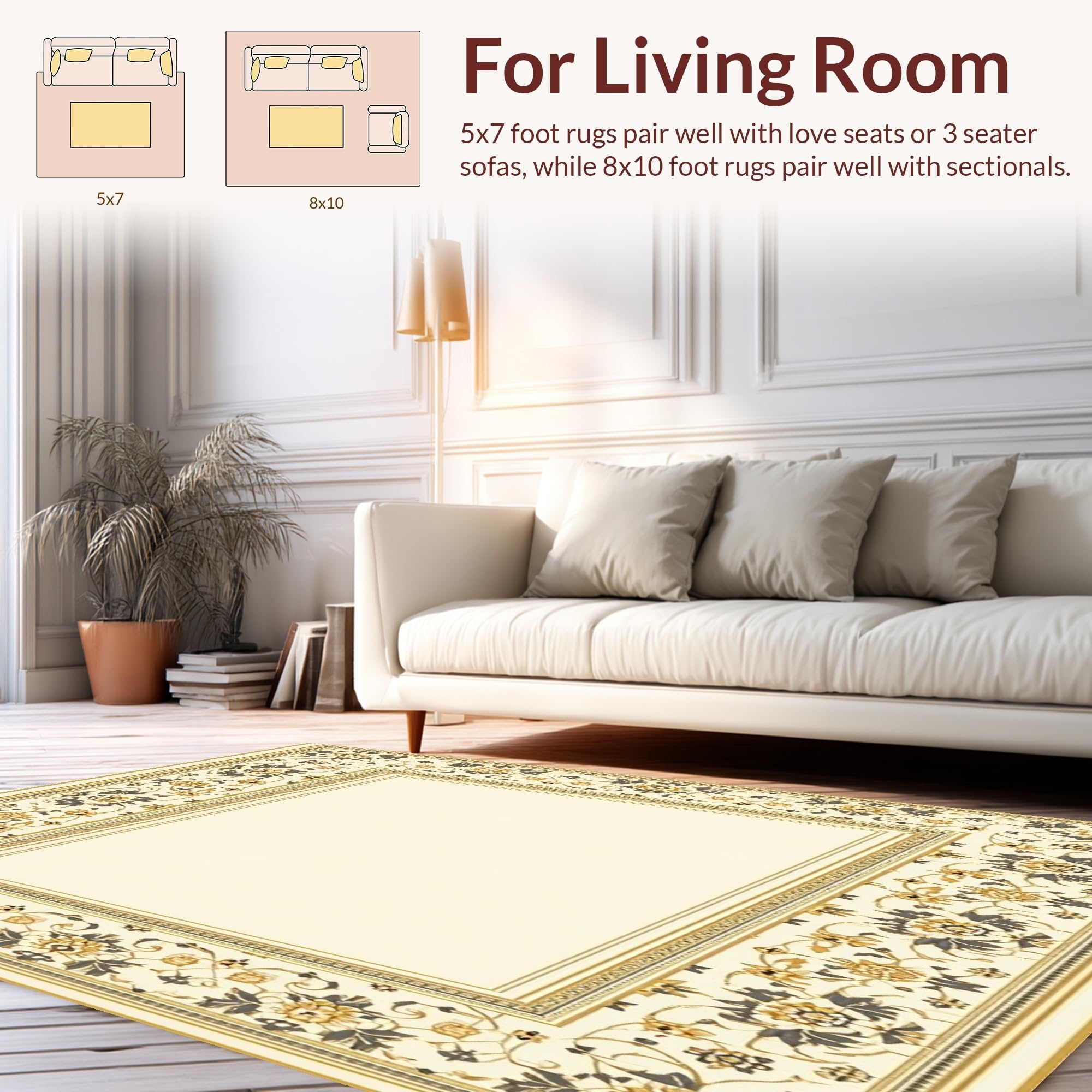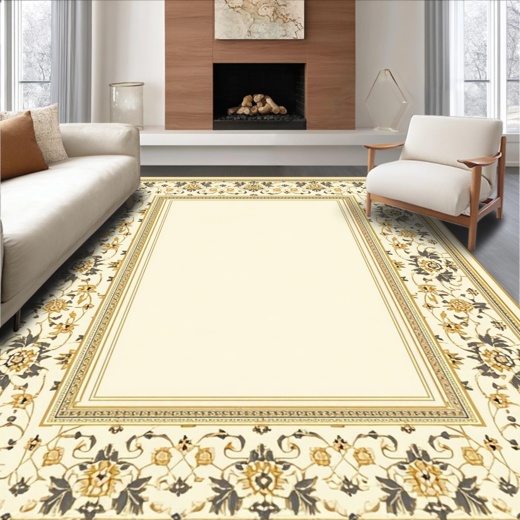 Ultra Soft Area Rug, Non Slip, Stain Resistant, Washable Area Rugs for Living Room, Bedroom, Geometric Borders and Subtle Floral Insets(Beige) Overview: