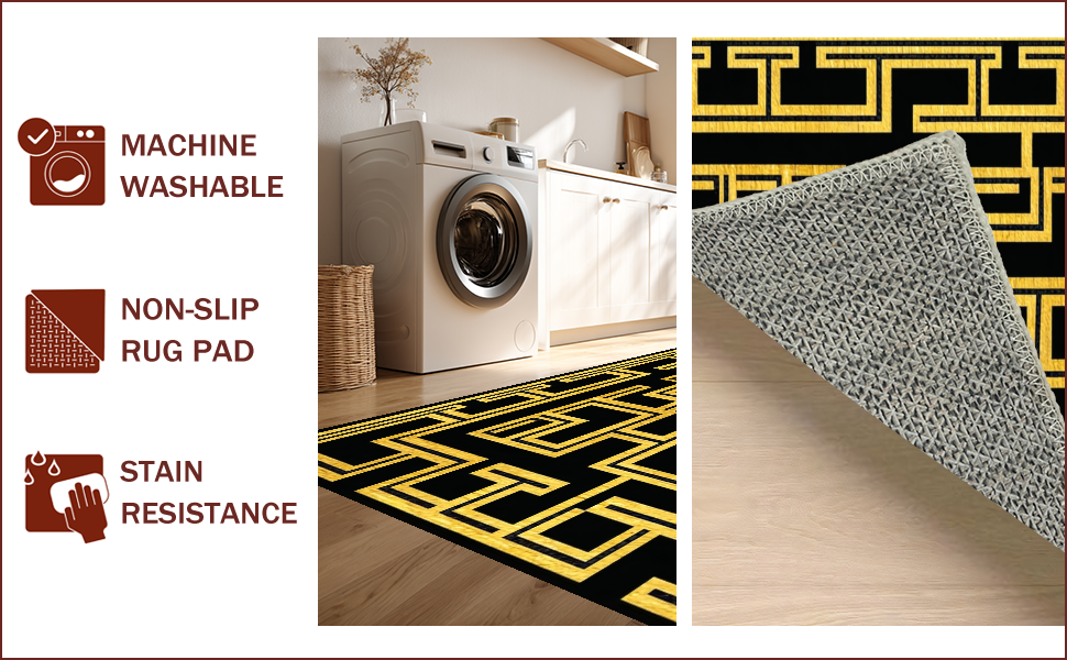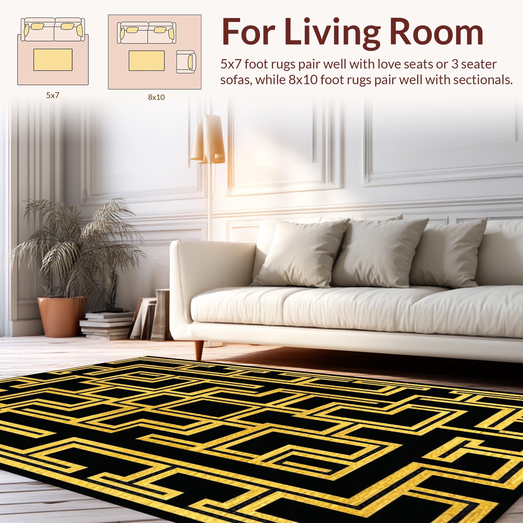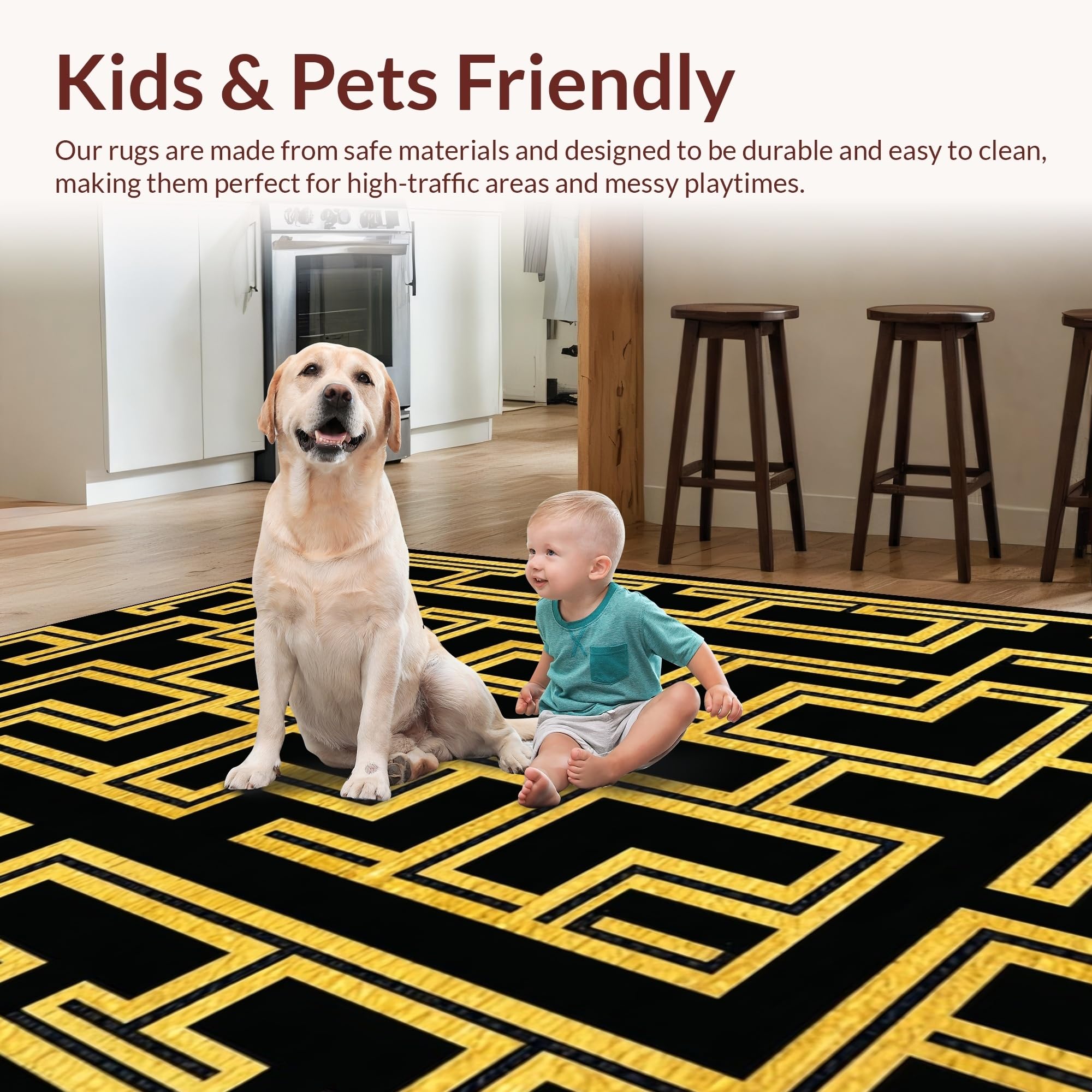 Ultra Soft Area Rug, Non Slip, Stain Resistant, Washable Area Rugs for Living Room, Bedroom, Geometric Retro Black Gold Motif(Black) Overview: