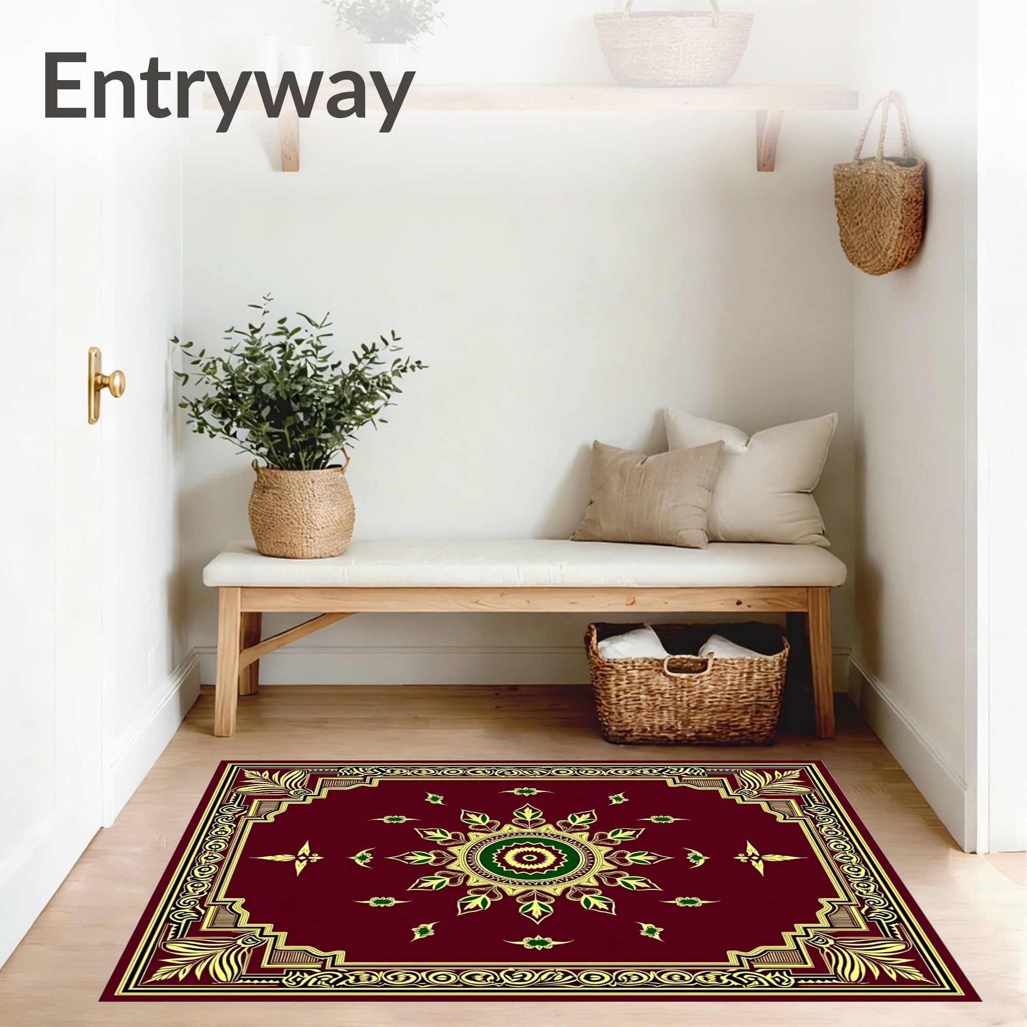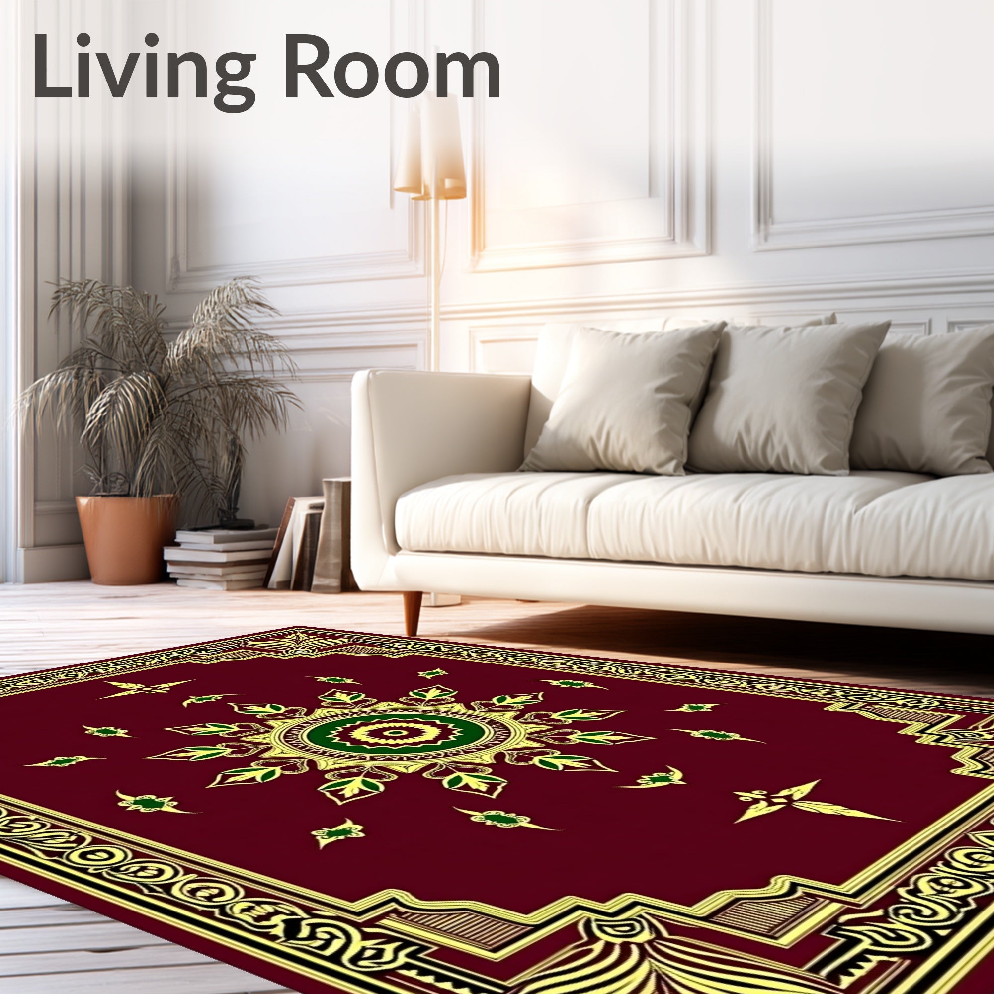Ultra Soft Area Rug, Non Slip, Stain Resistant, Washable Area Rugs for Living Room, Bedroom, Gilded Goblin Interlocking Medallions with Flourish(Red) Overview: