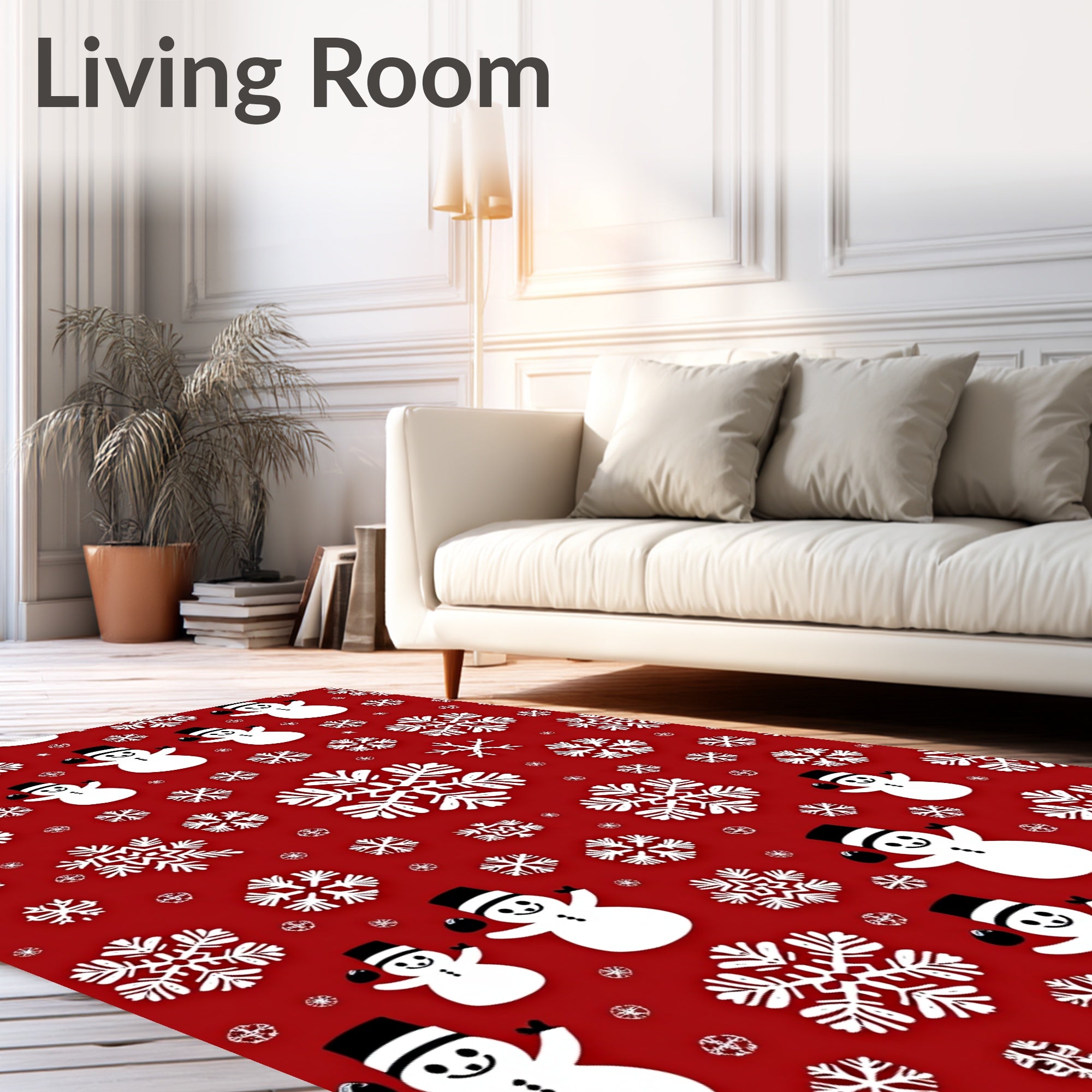 Ultra Soft Area Rug, Non Slip, Stain Resistant, Washable Area Rugs for Living Room, Bedroom, Glittering Snowflake Floor with Jolly Winter Character Motifs(Red) Overview: