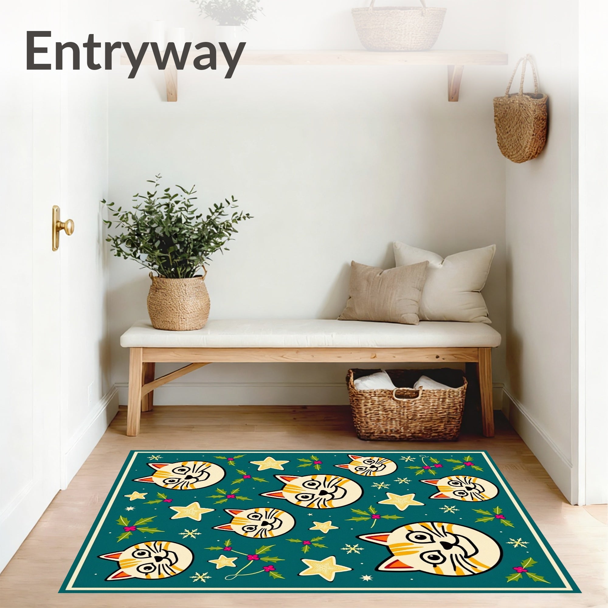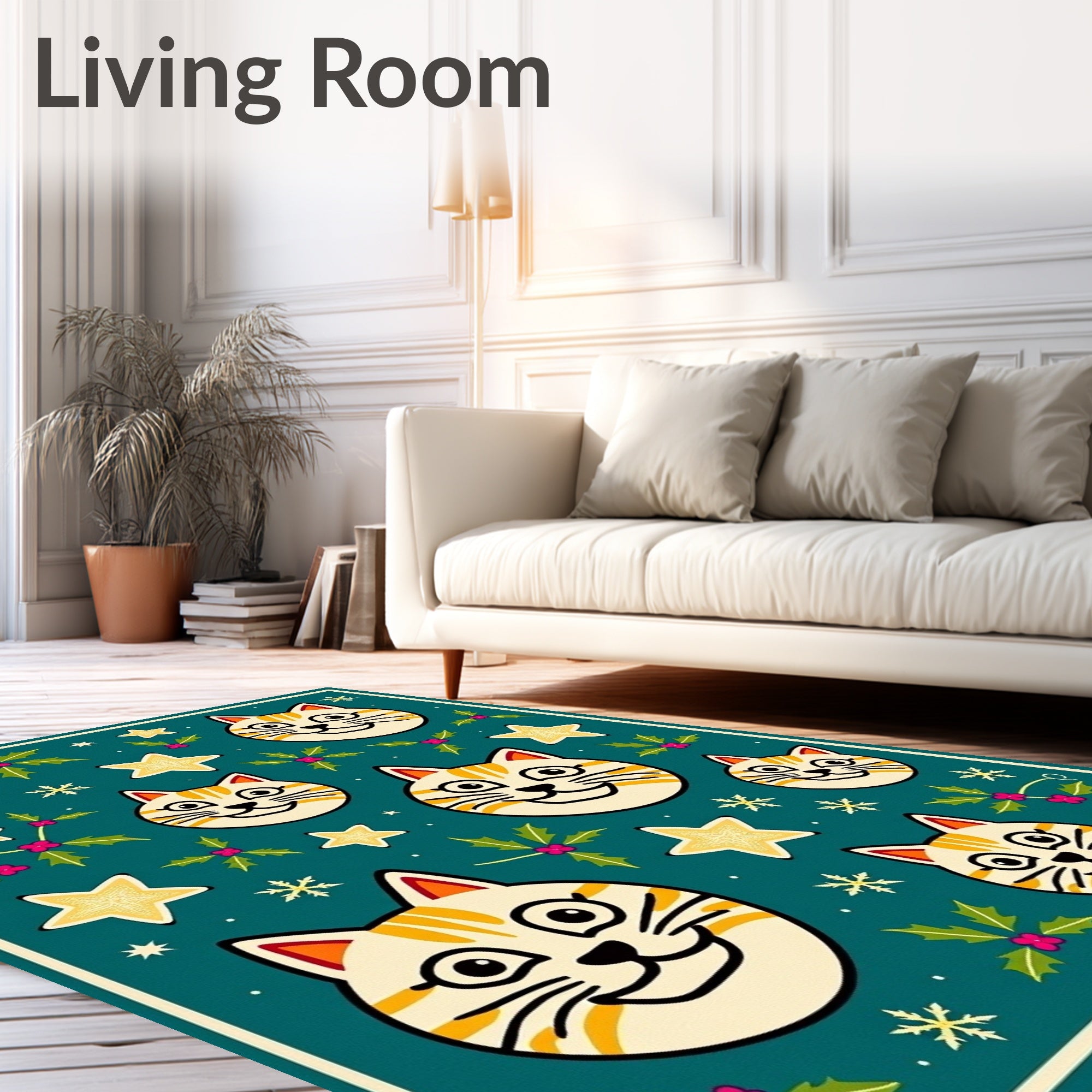 Ultra Soft Area Rug, Non Slip, Stain Resistant, Washable Area Rugs for Living Room, Bedroom, Glowing Tabby Cat Portrait Design Floor with Sparkling Holiday Motifs(Turquoise) Overview: