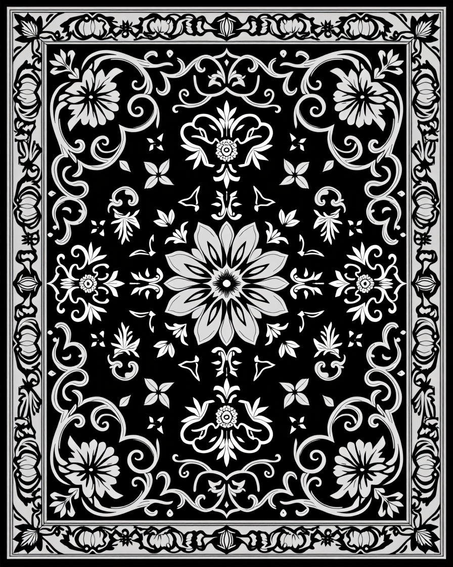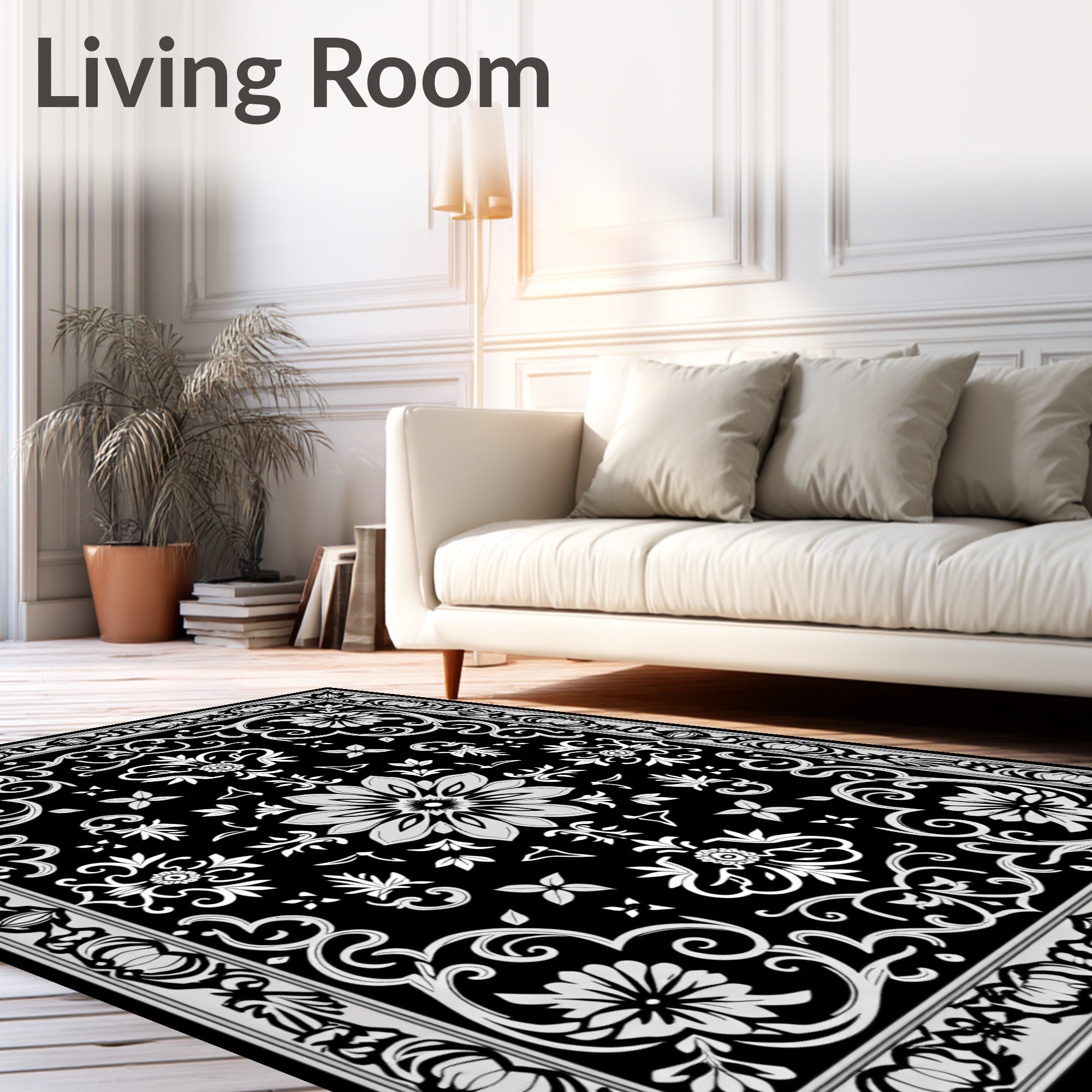 Ultra Soft Area Rug, Non Slip, Stain Resistant, Washable Area Rugs for Living Room, Bedroom, Heritage Damask Blooming Elaborate Luxurious Distinctive(Black) Overview: