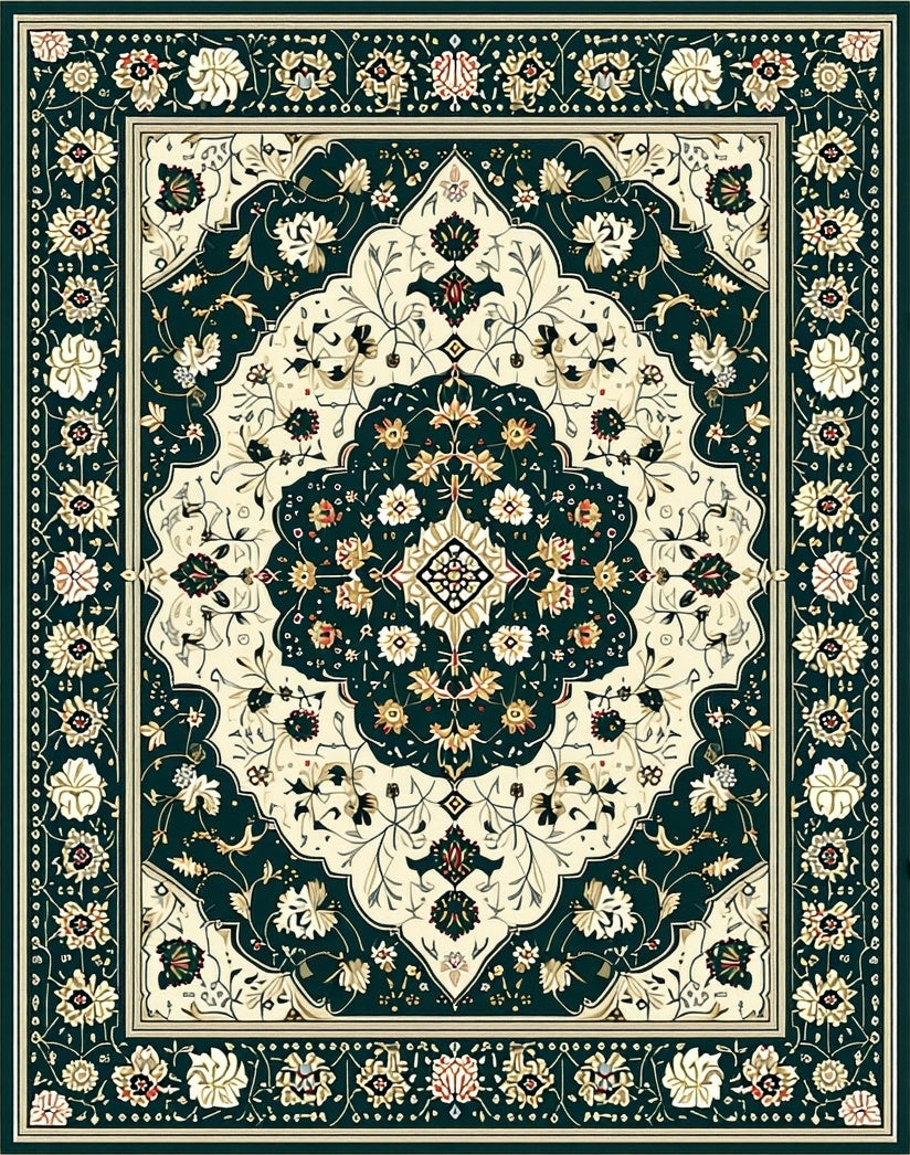 Heritage Medallion with Symmetrical Floral Motifs and Geometric Edges(Dark Green)