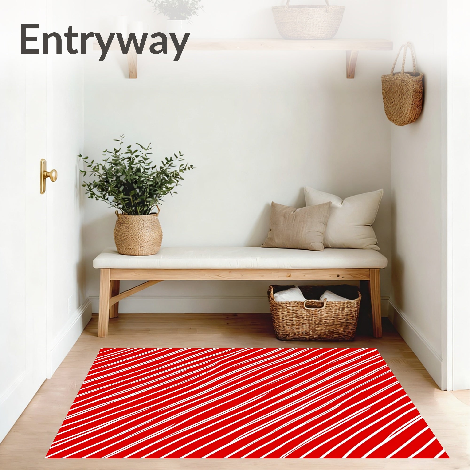 Ultra Soft Area Rug, Non Slip, Stain Resistant, Washable Area Rugs for Living Room, Bedroom, Holiday Ribbon Interlocking Pinstripe Decorative Accent(Red) Overview: