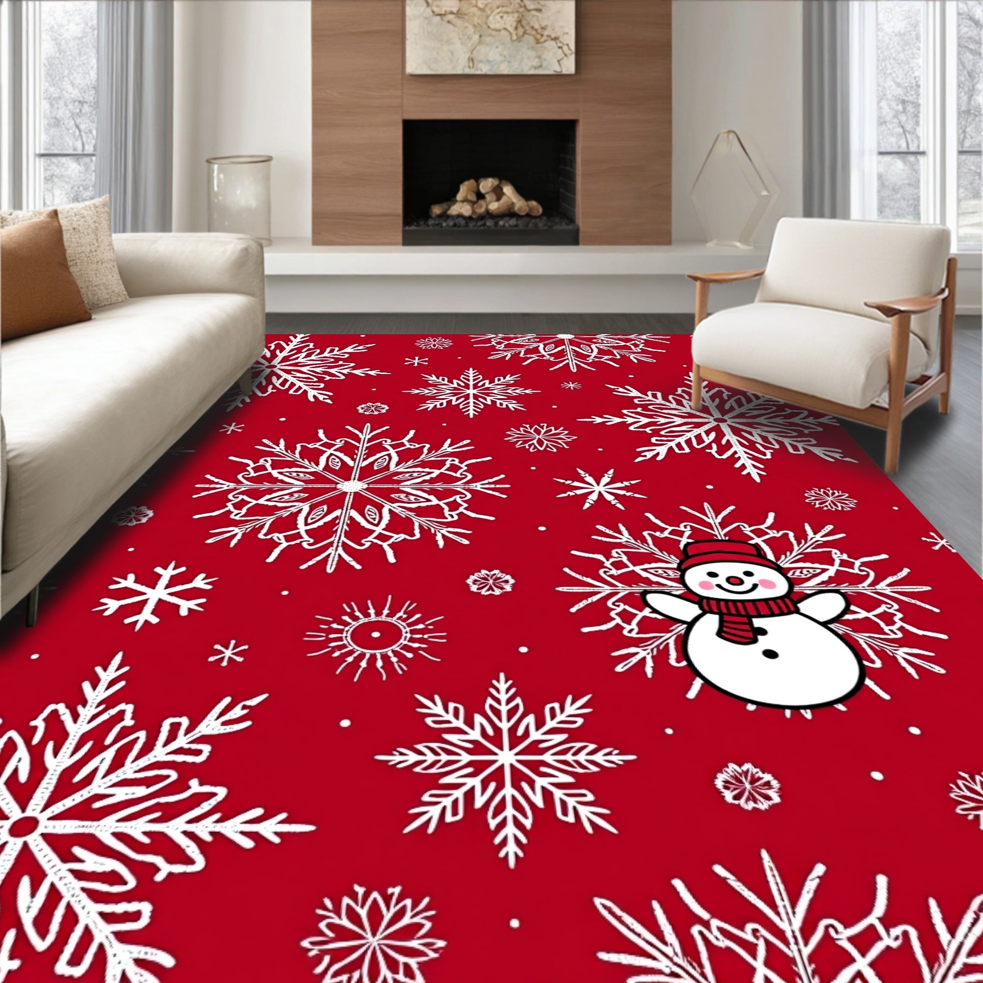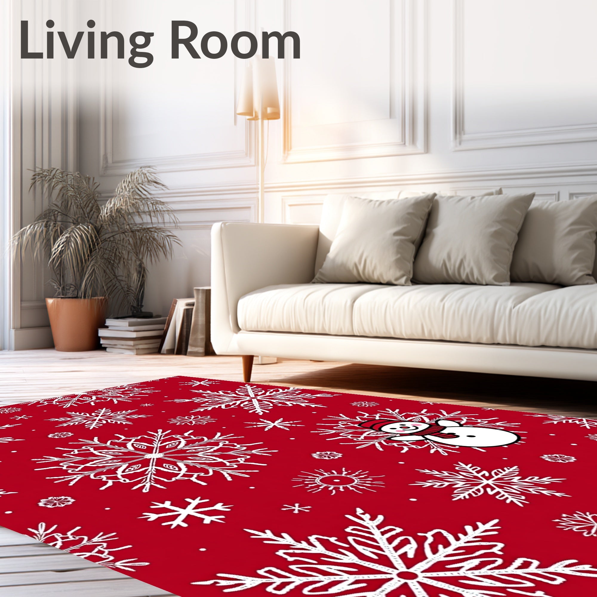 Ultra Soft Area Rug, Non Slip, Stain Resistant, Washable Area Rugs for Living Room, Bedroom, Holiday Snowflake Mosaic Featuring Jolly Snowman Illustration(Red) Overview: