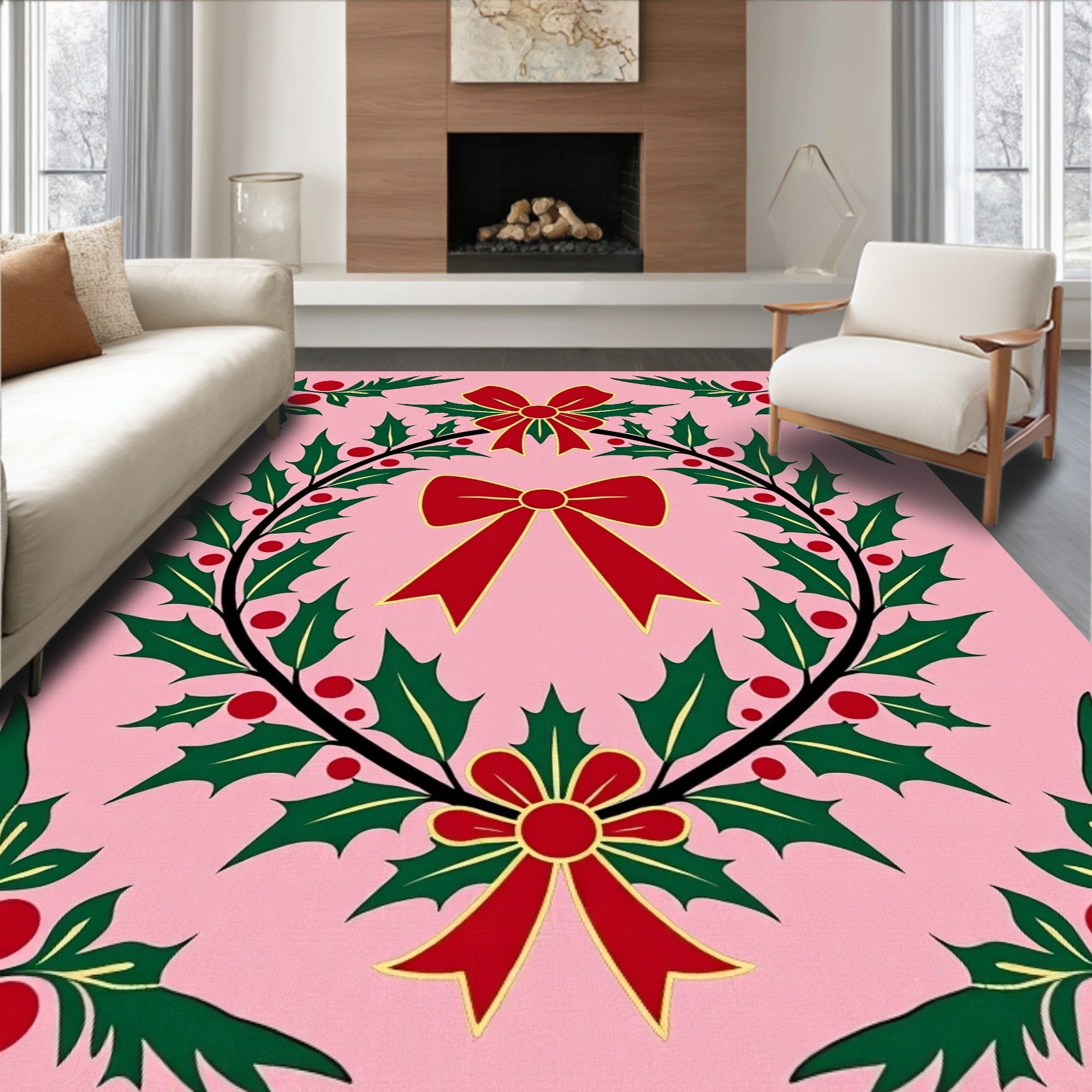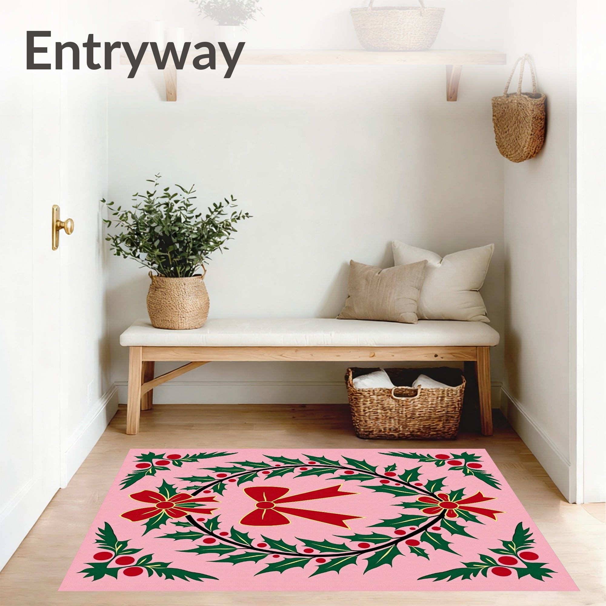 Ultra Soft Area Rug, Non Slip, Stain Resistant, Washable Area Rugs for Living Room, Bedroom, Holly Berry Wreath Design Welcome with Festive Bow Accent(Pink) Overview: