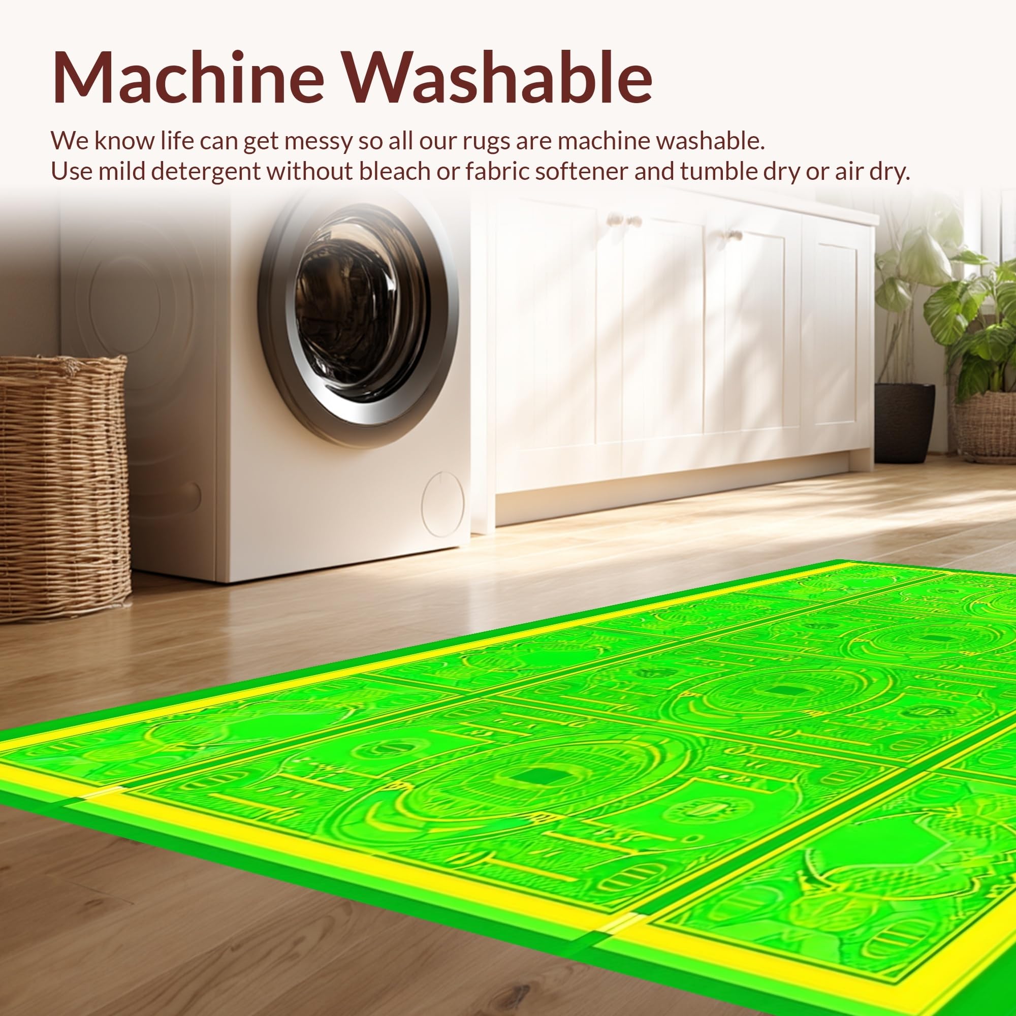 - Machine Washable: Our rugs can be easily thrown in the wash machine.