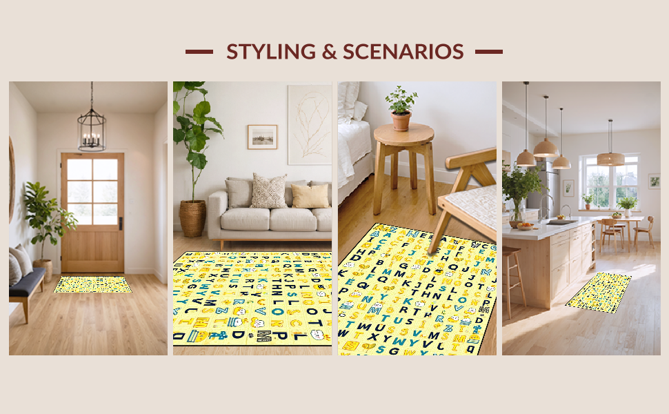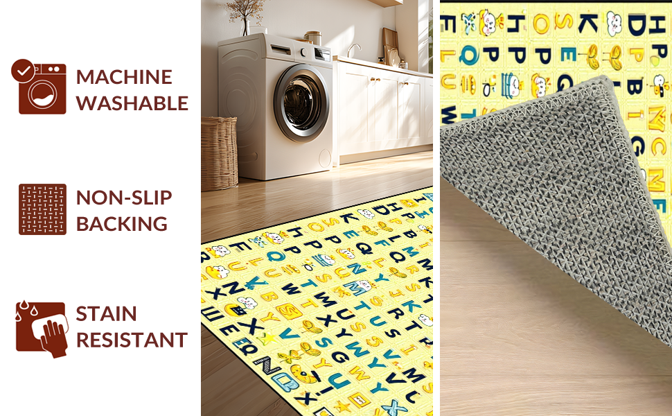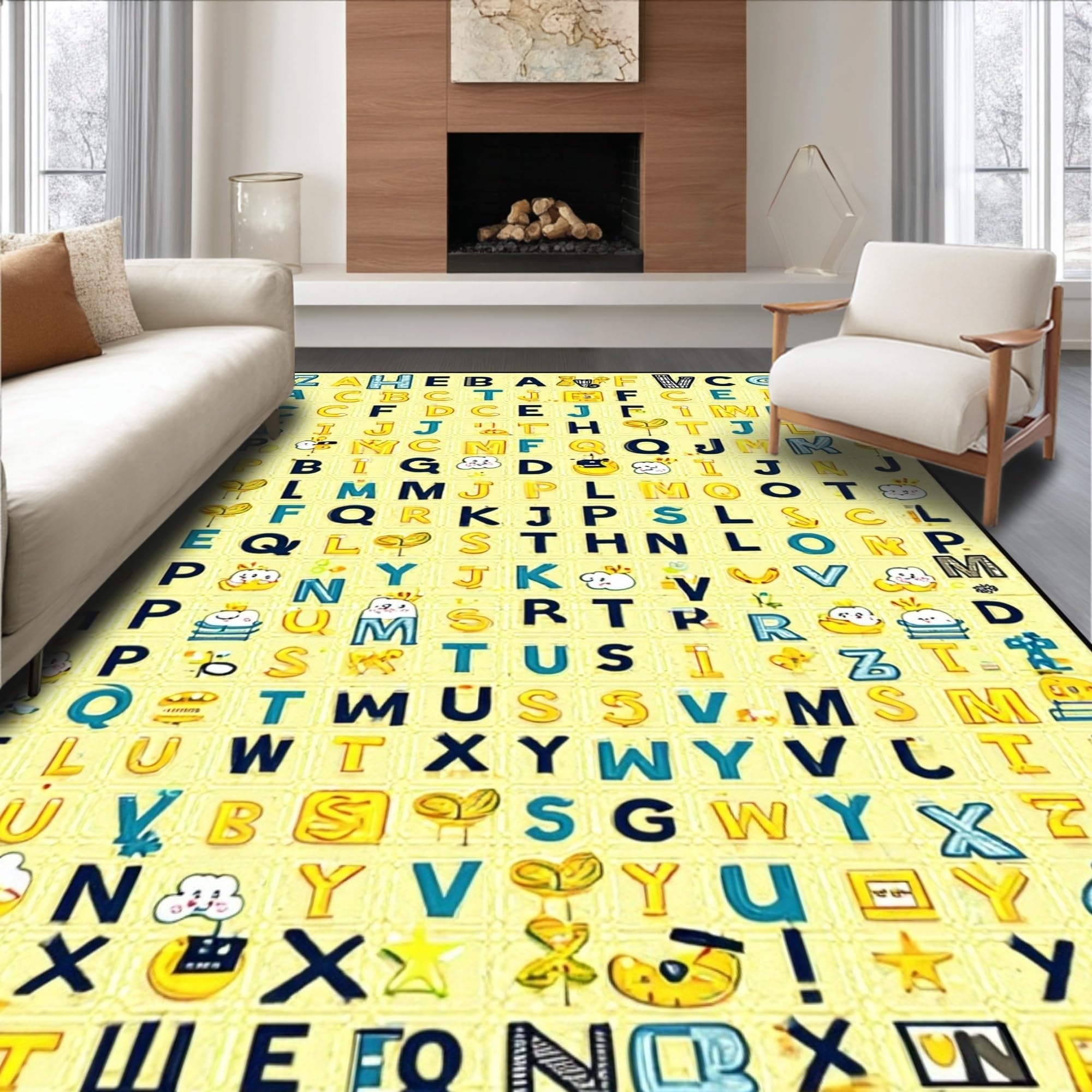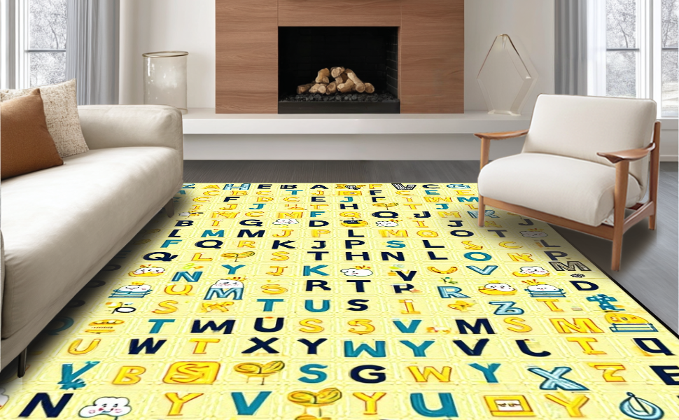 Ultra Soft Area Rug, Non Slip, Stain Resistant, Washable Area Rugs for Living Room, Bedroom, Interactive Cheerful Text Arrangement(Yellow) Overview: