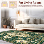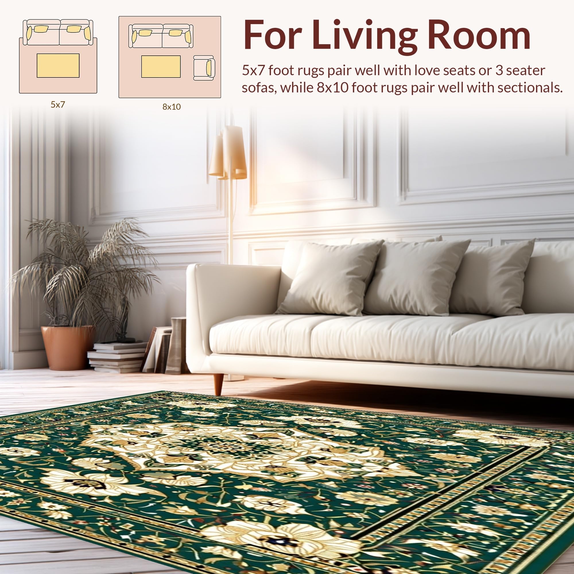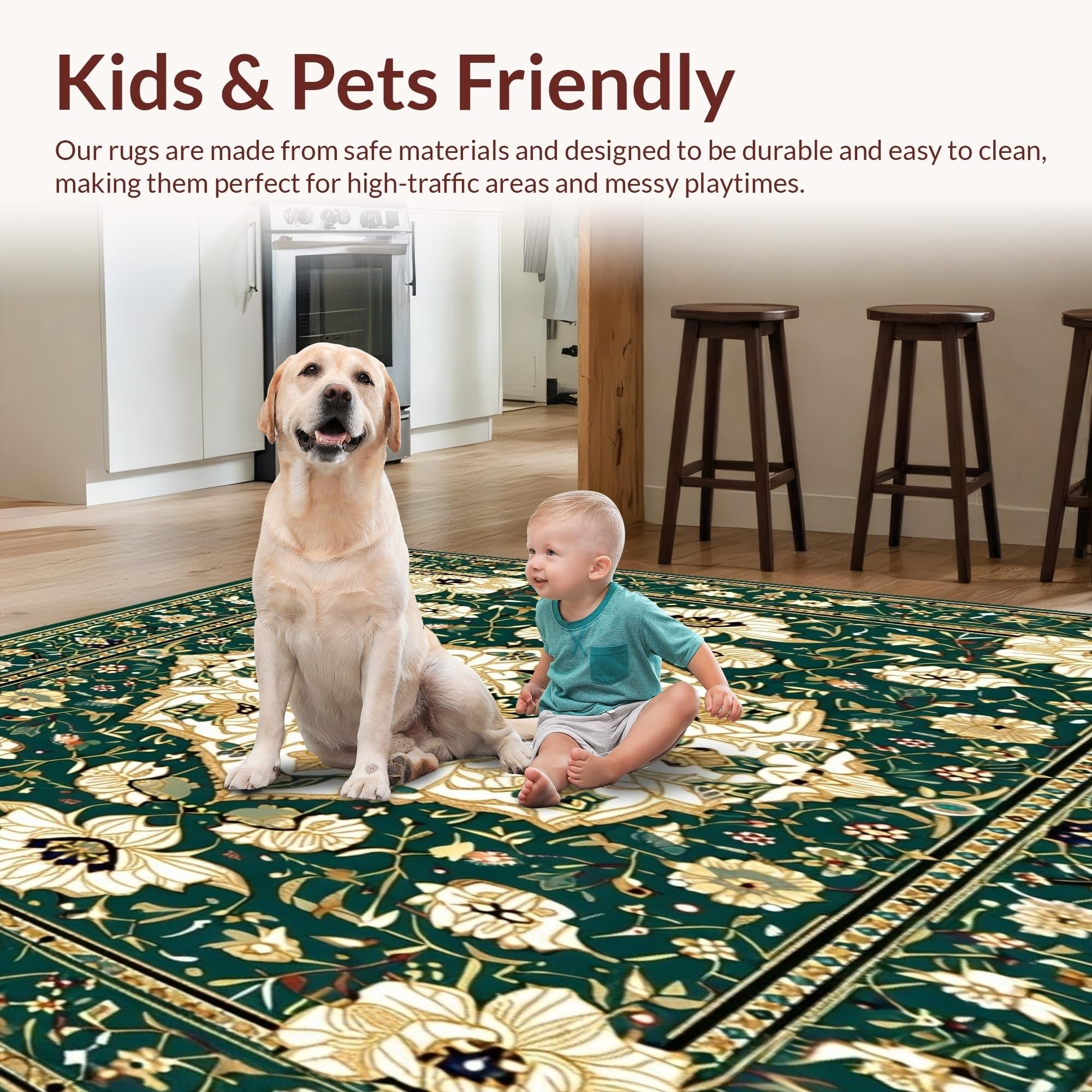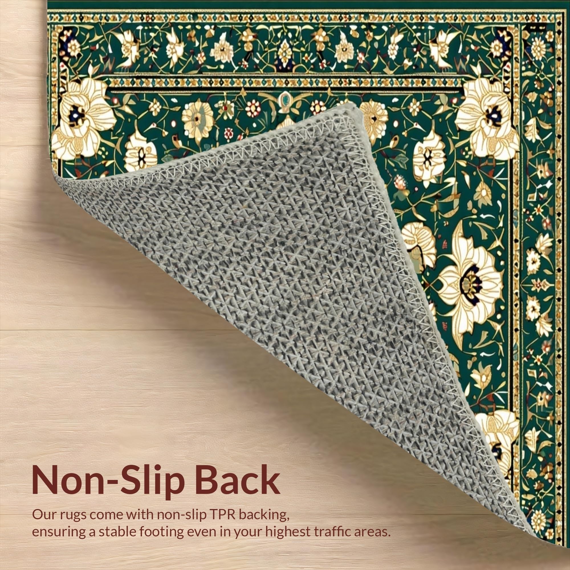 Ultra Soft Area Rug, Non Slip, Stain Resistant, Washable Area Rugs for Living Room, Bedroom, Intricate Floral Area with Geometric Design in Rich Green and Gold(Green) Overview: