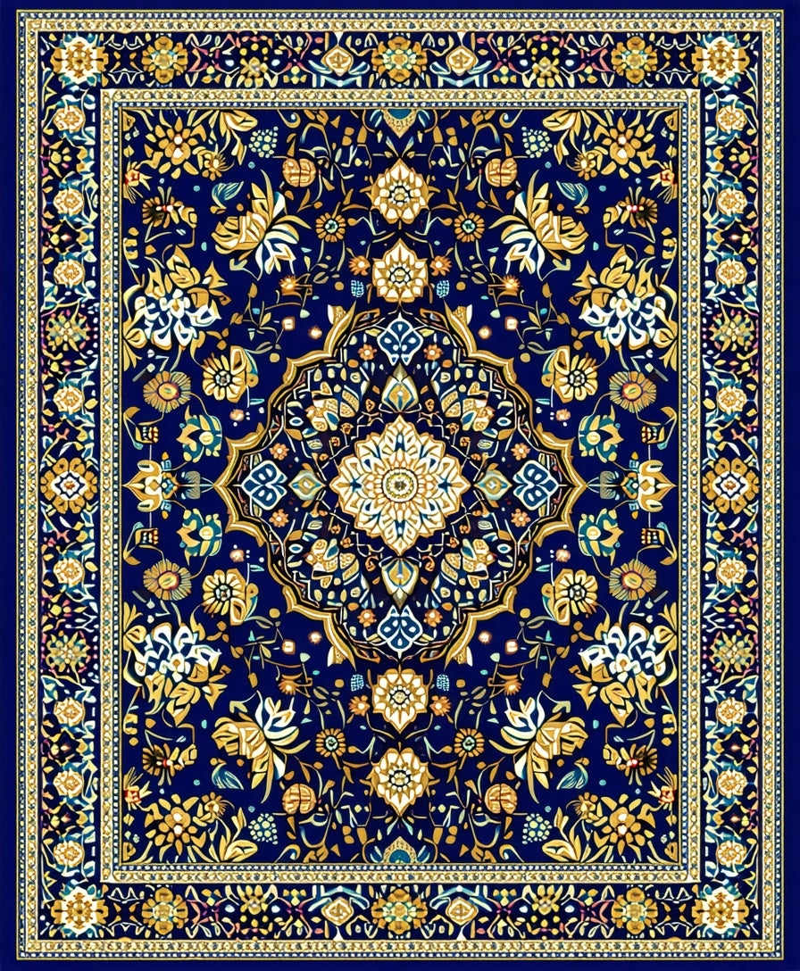Intricate Woven Area Featuring Complex Design and Gold Accents(Blue)
