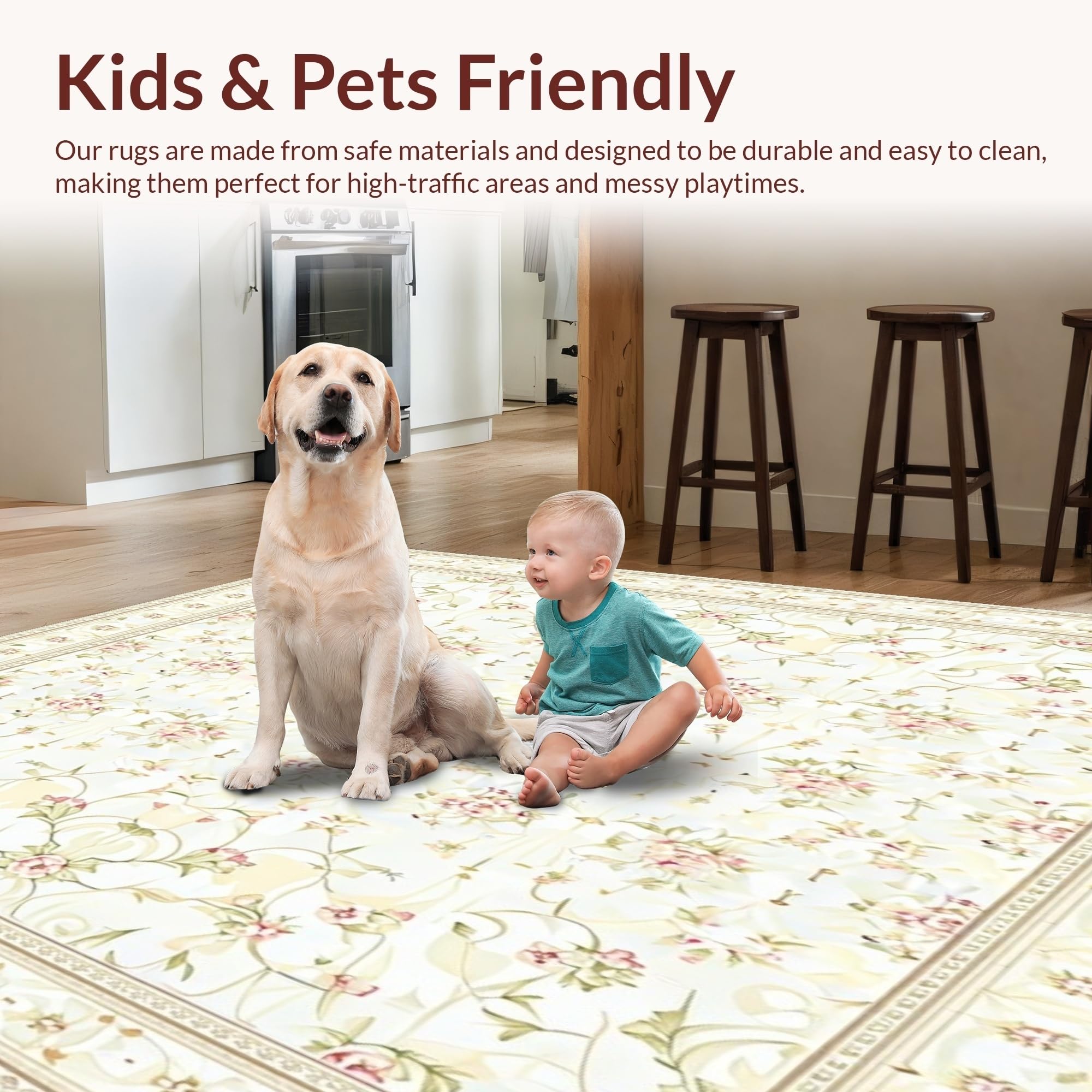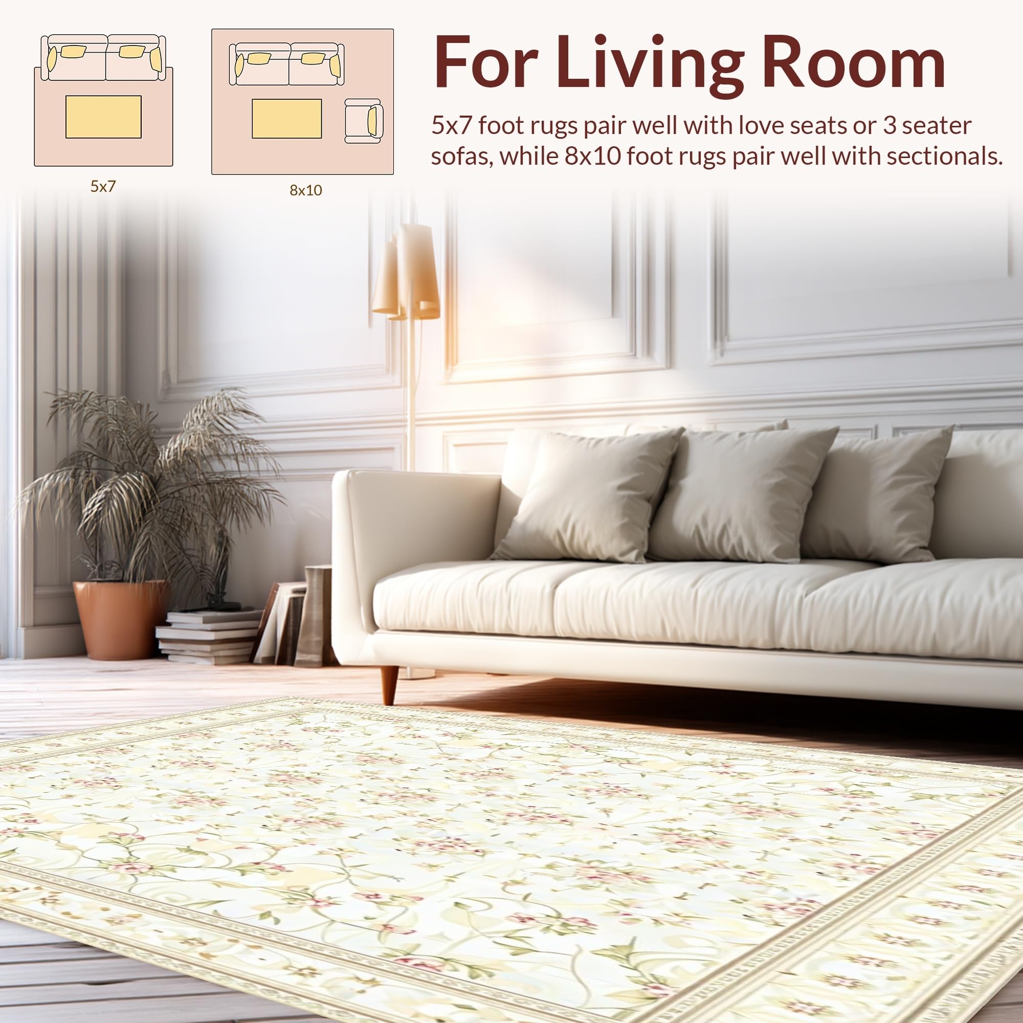 Ultra Soft Area Rug, Non Slip, Stain Resistant, Washable Area Rugs for Living Room, Bedroom, Ivory Cream Weave Elegant Neutral Tones with Floral Accents(Beige) Overview: