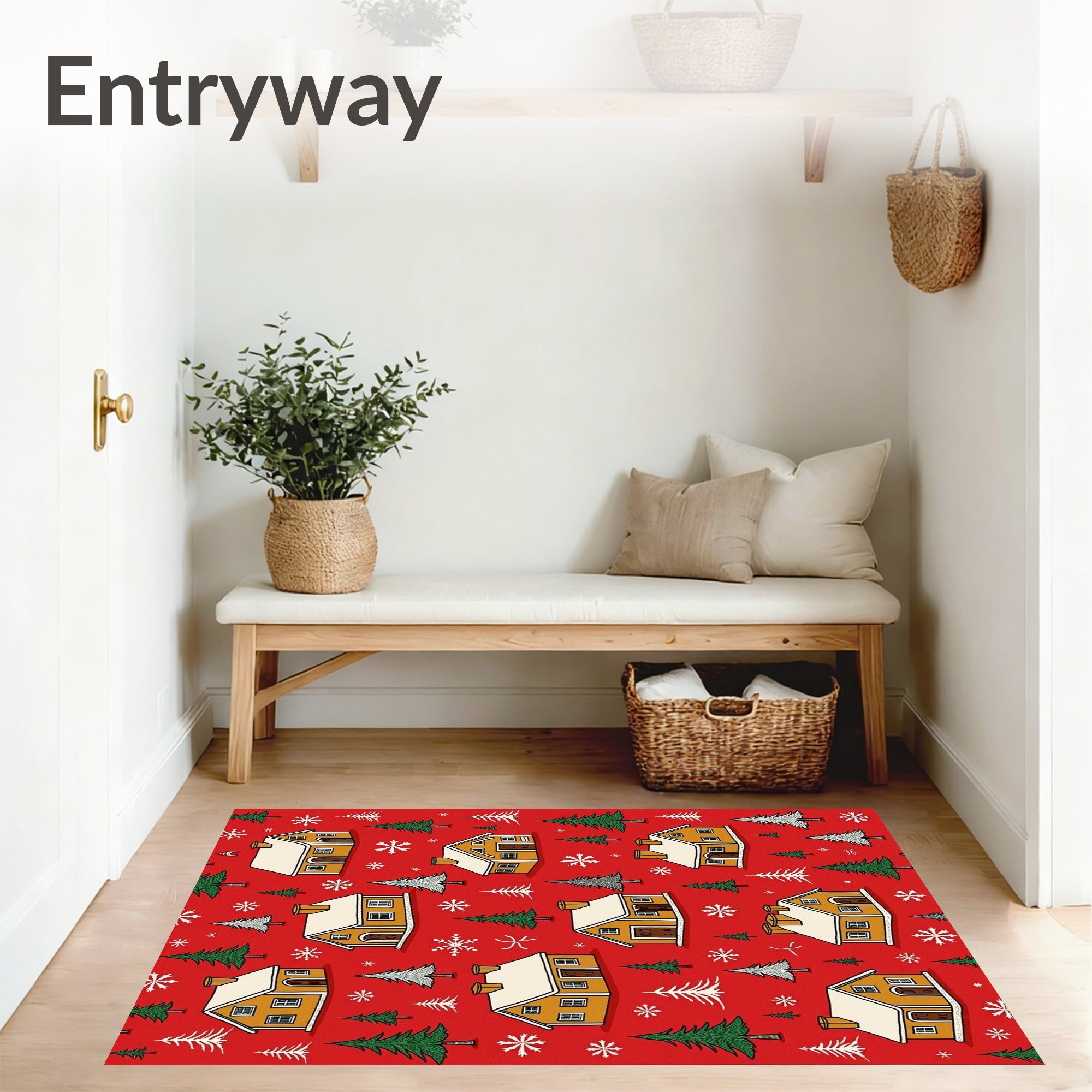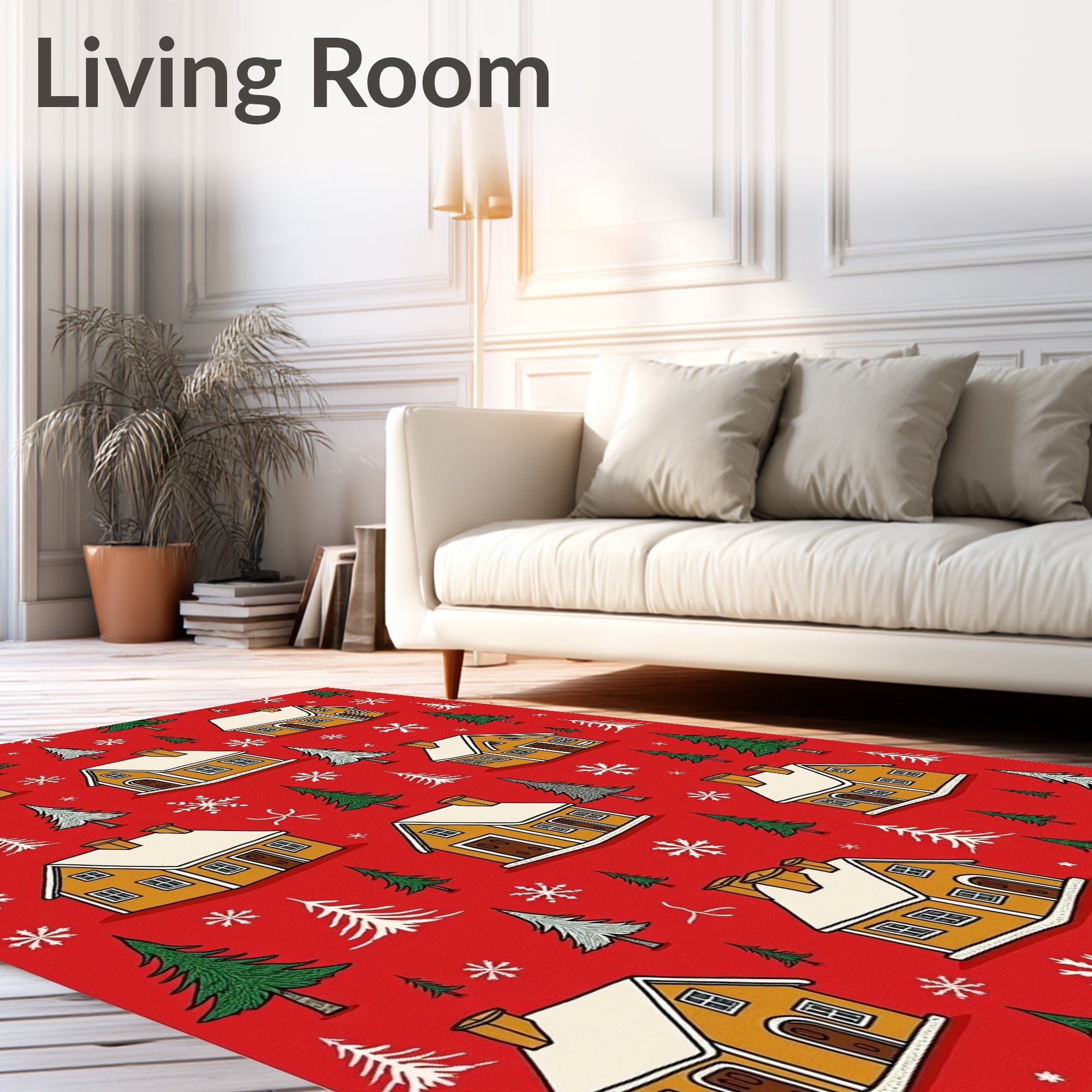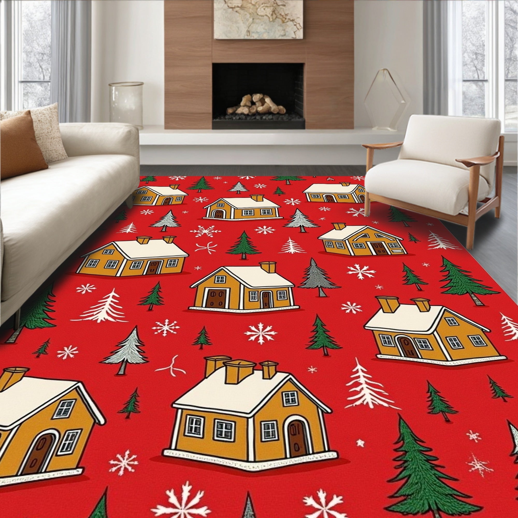Ultra Soft Area Rug, Non Slip, Stain Resistant, Washable Area Rugs for Living Room, Bedroom, Jolly Winter Cottage Evergreen Forest(Red) Overview: