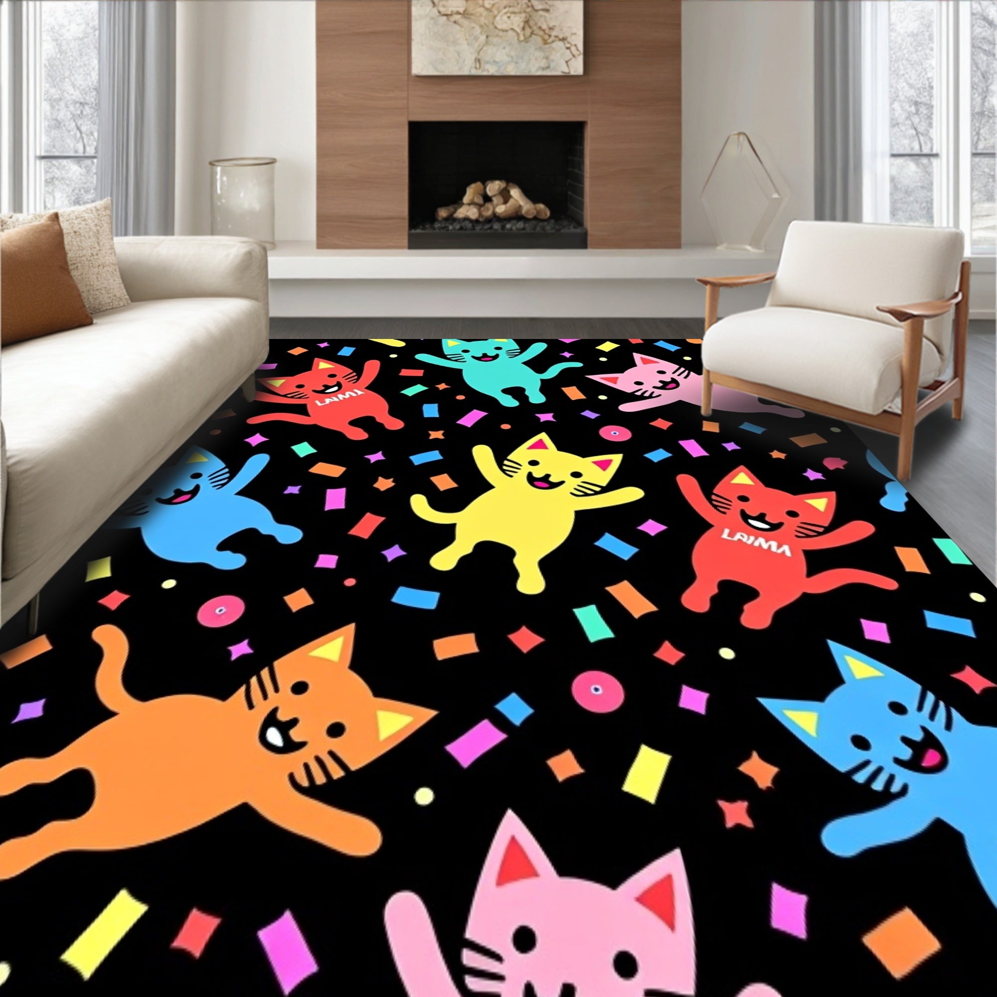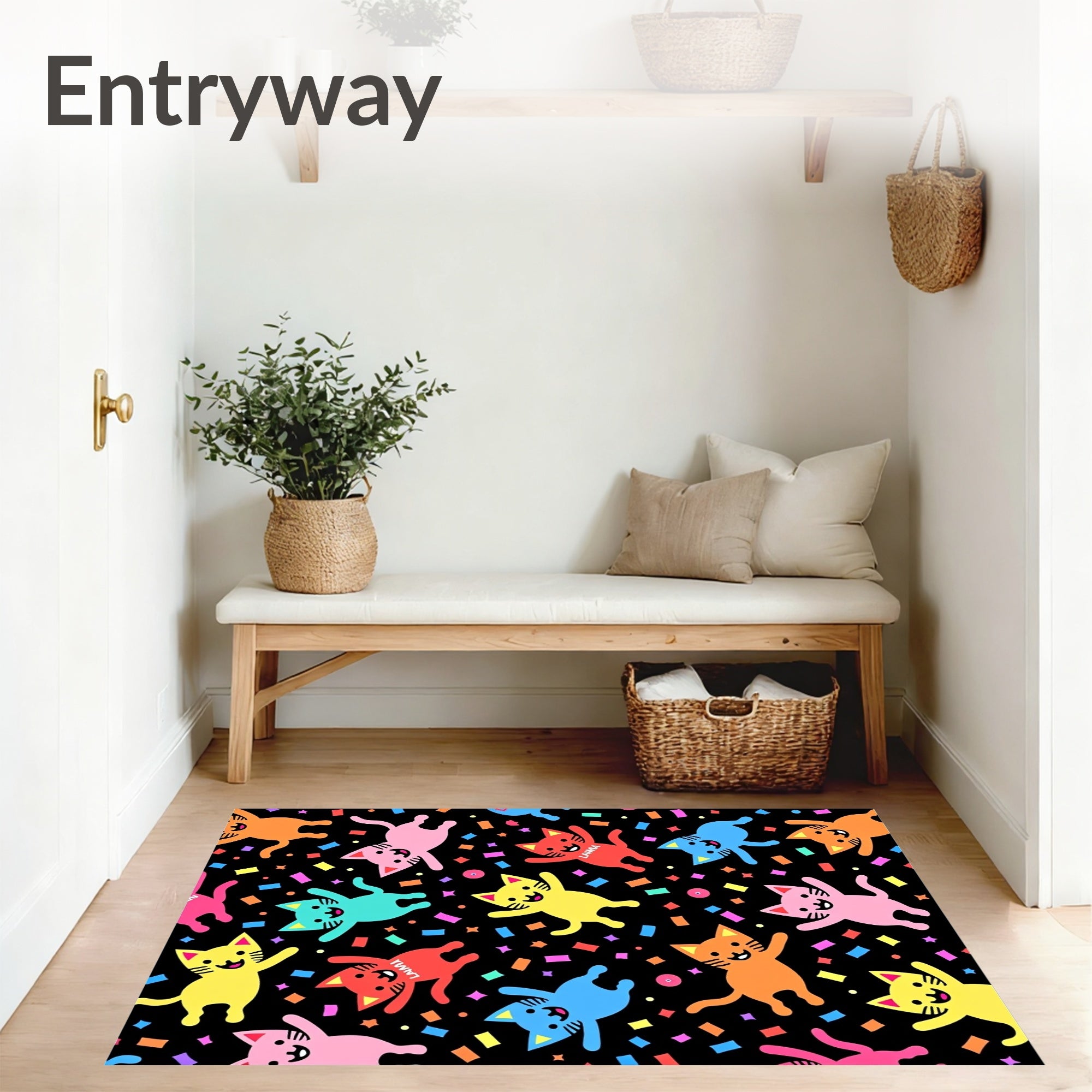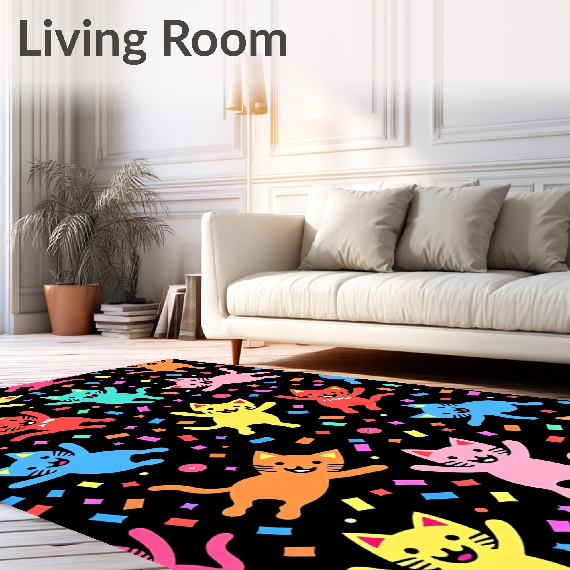 Ultra Soft Area Rug, Non Slip, Stain Resistant, Washable Area Rugs for Living Room, Bedroom, Jovial Meow Parade Festive Celebration With Dancing Kittens(Black) Overview: