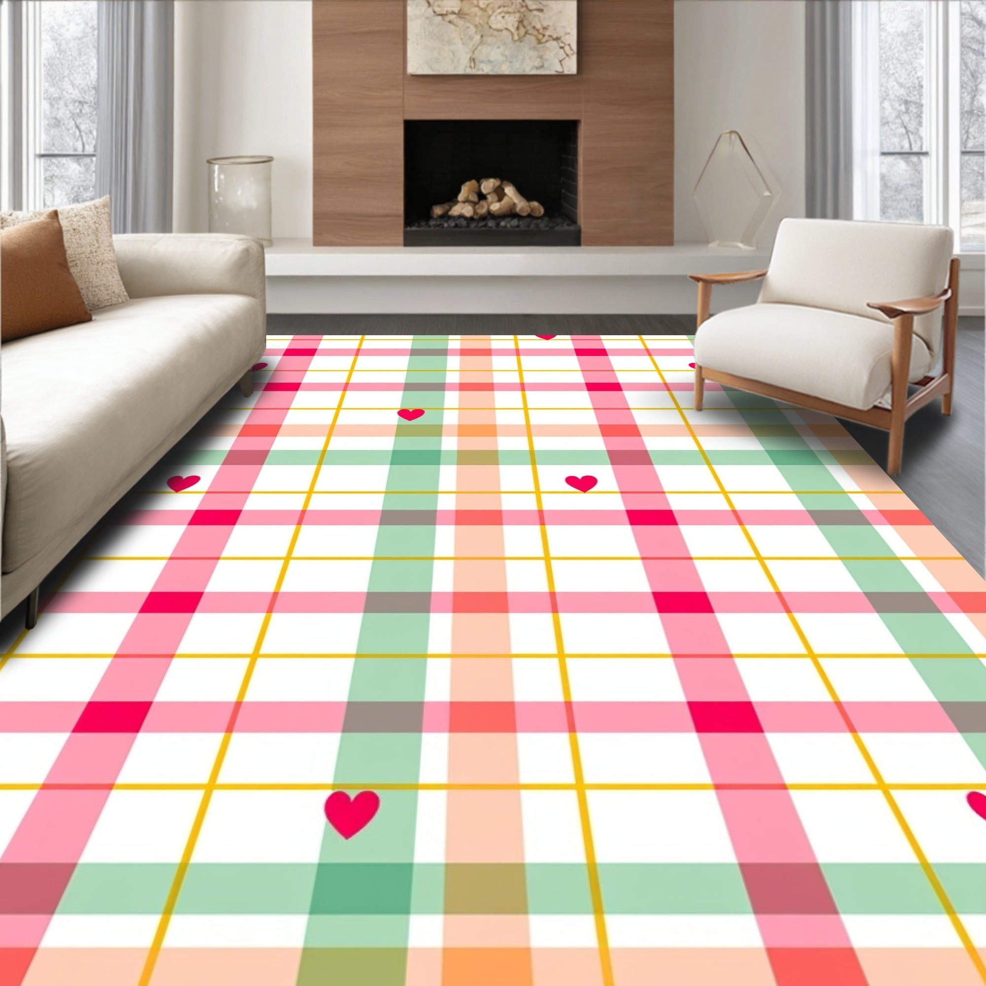 Ultra Soft Area Rug, Non Slip, Stain Resistant, Washable Area Rugs for Living Room, Bedroom, Joyful Gingham Hearts Festive Stripe Configuration(Pink) Overview: