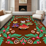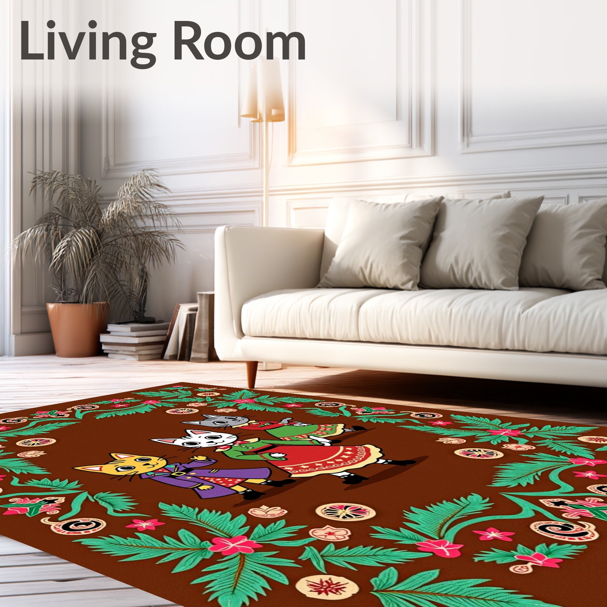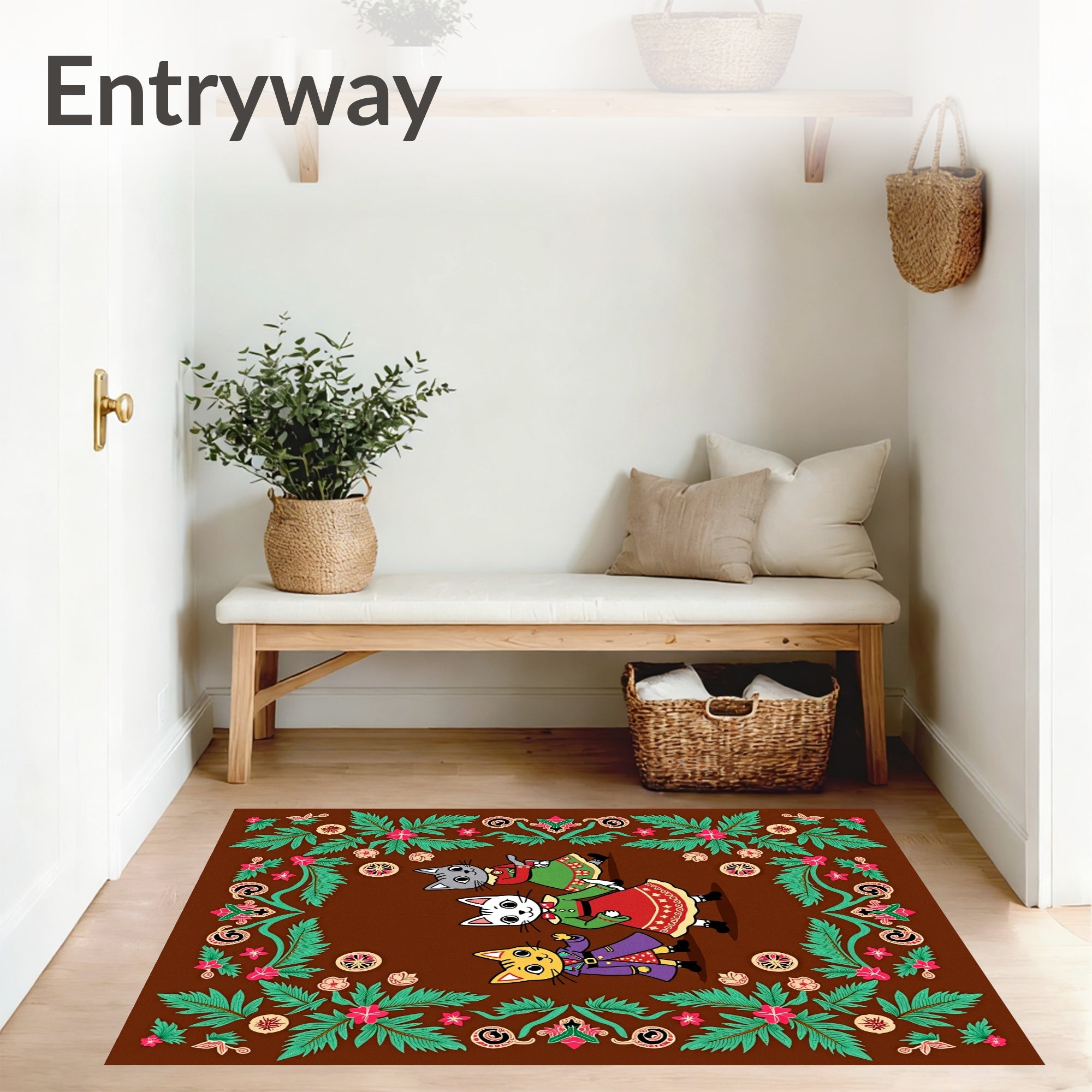 Ultra Soft Area Rug, Non Slip, Stain Resistant, Washable Area Rugs for Living Room, Bedroom, Joyful Lighted Cat Parade with Sparkling Ornament Accents and Fir Branches(Brown) Overview: