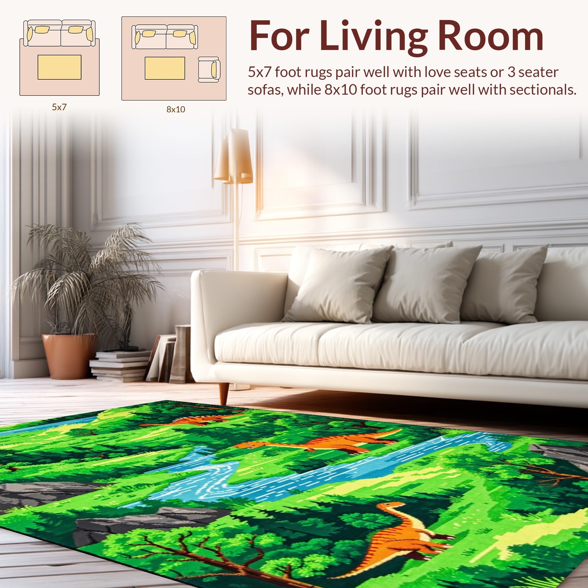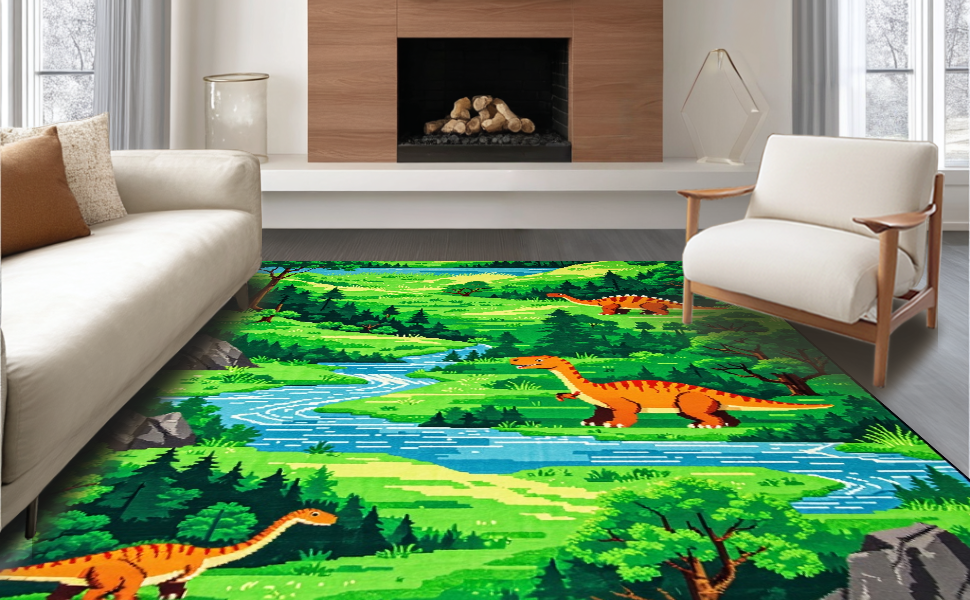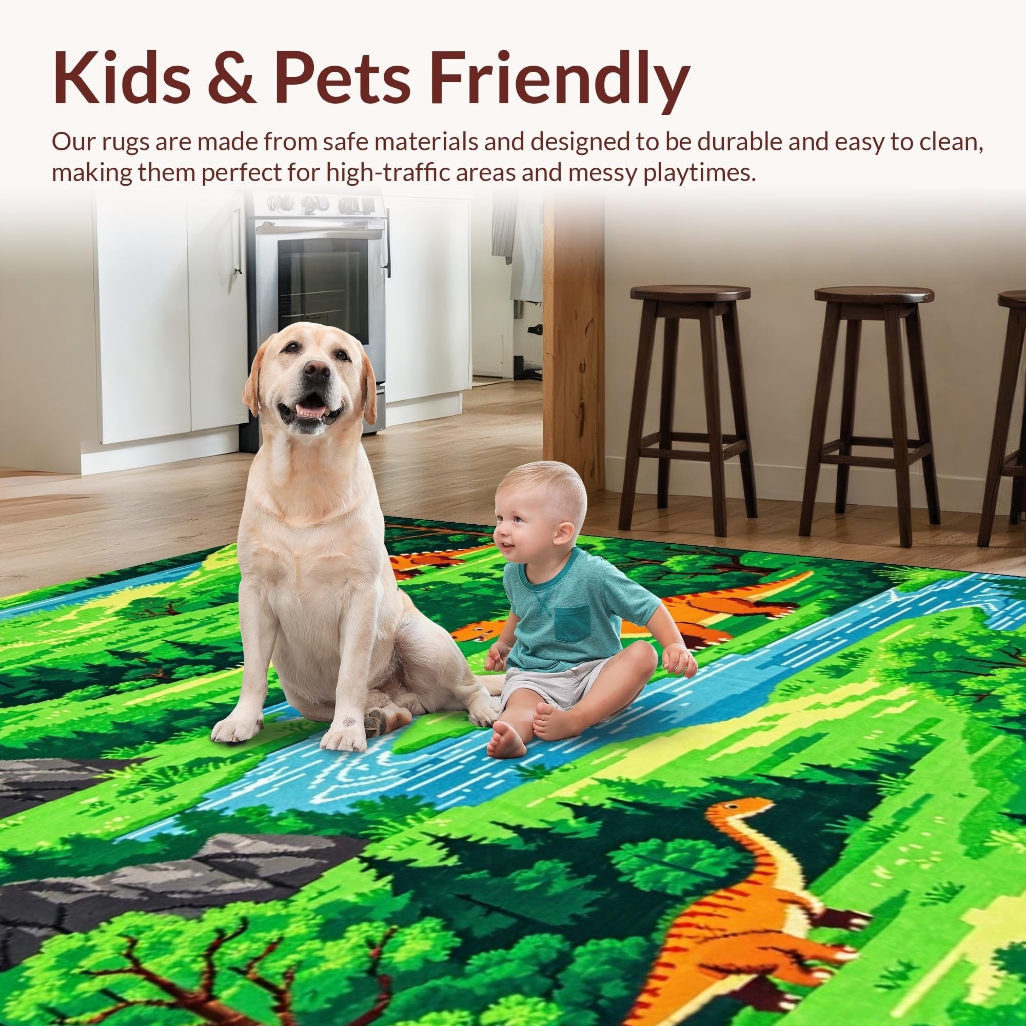 Ultra Soft Area Rug, Non Slip, Stain Resistant, Washable Area Rugs for Living Room, Bedroom, Joyful Multi-Colored Dino World(Green) Overview: