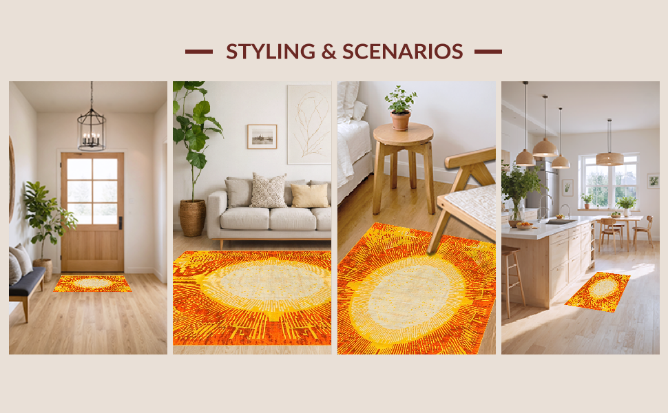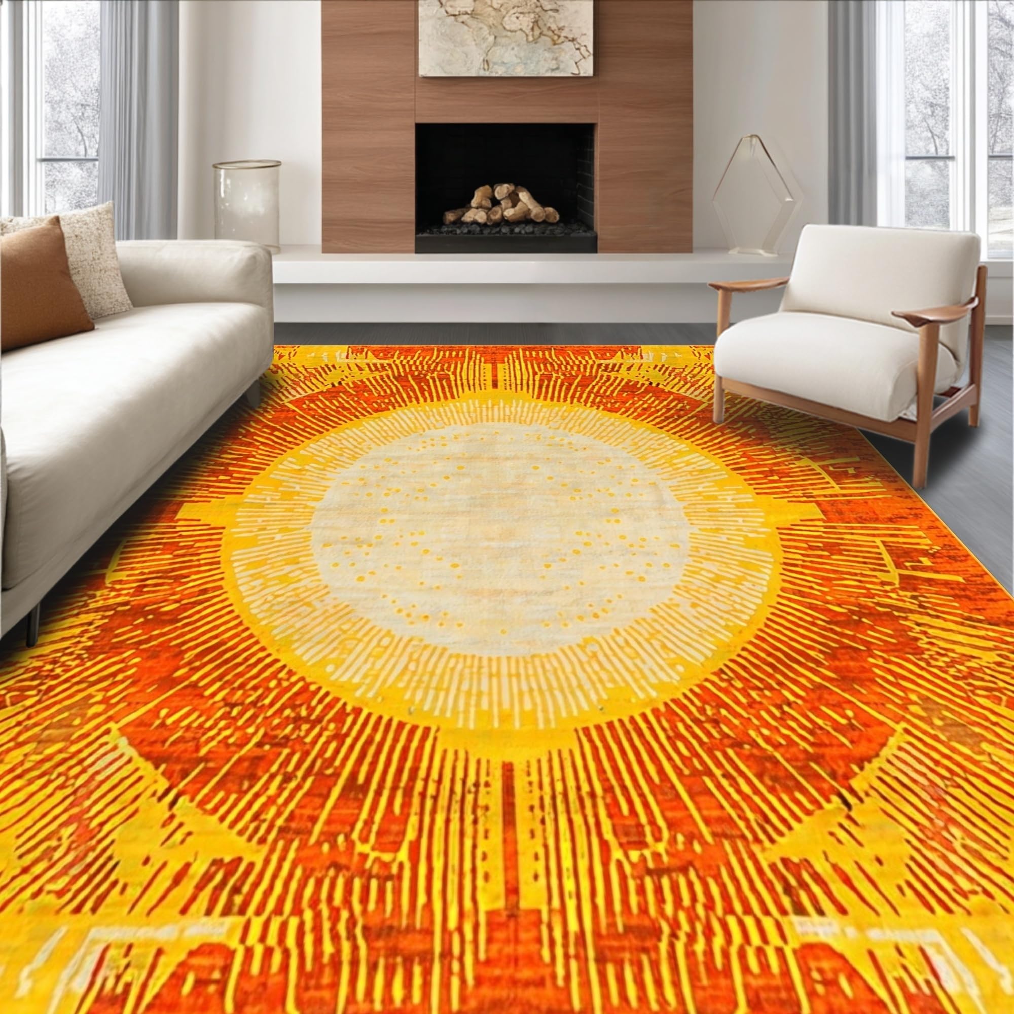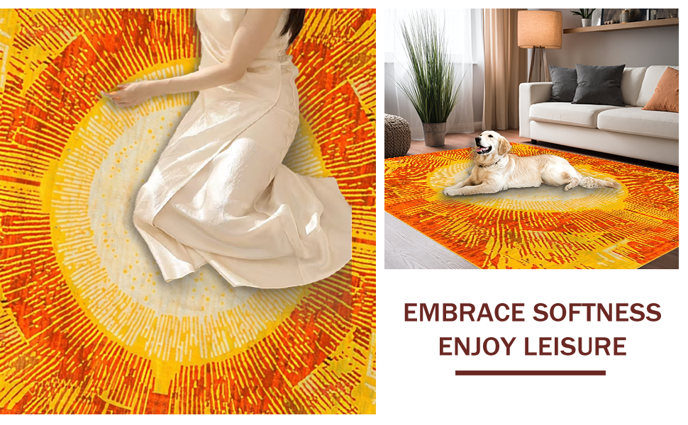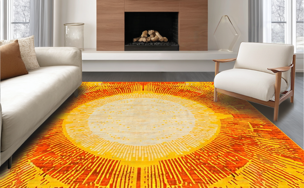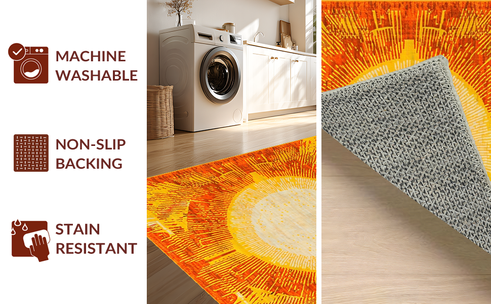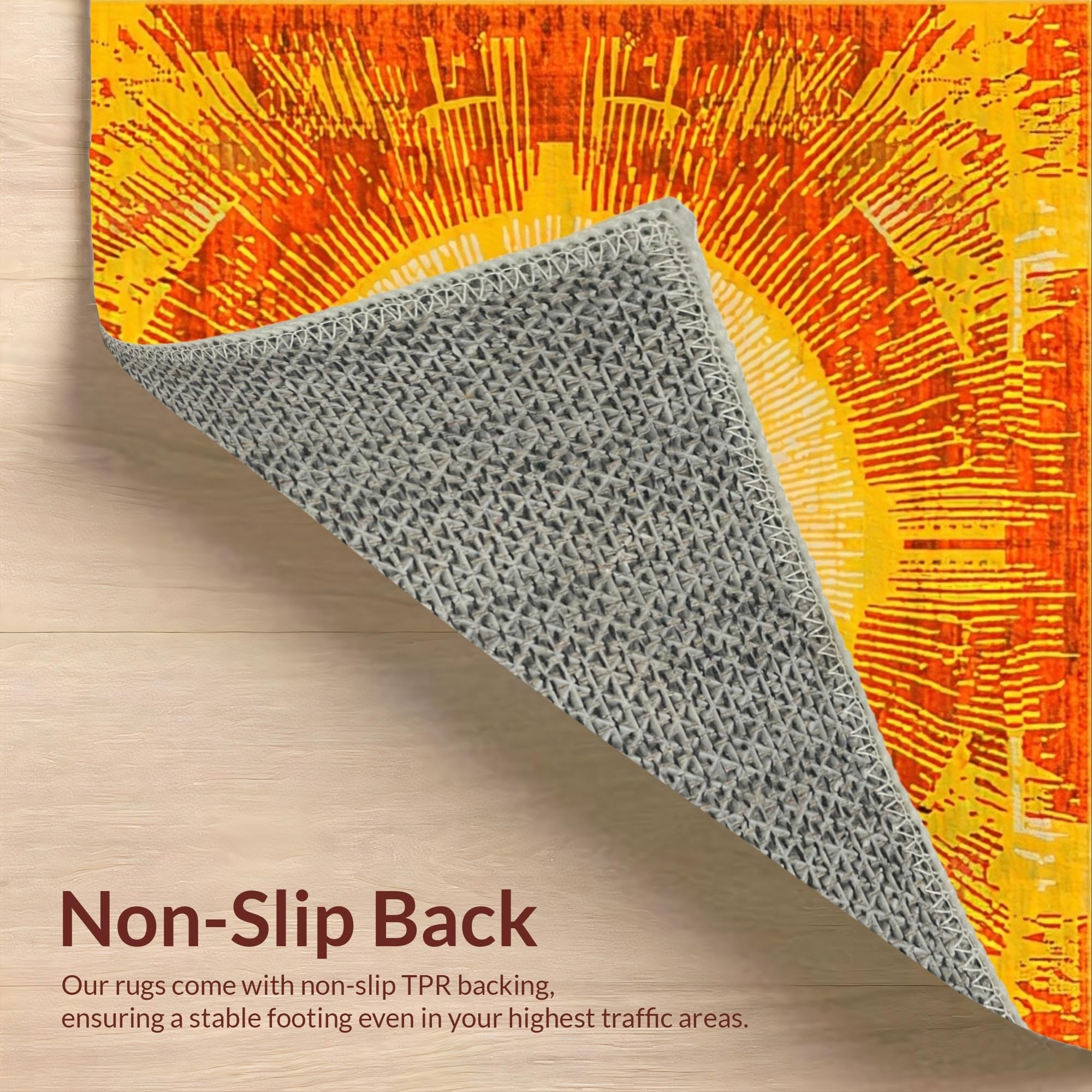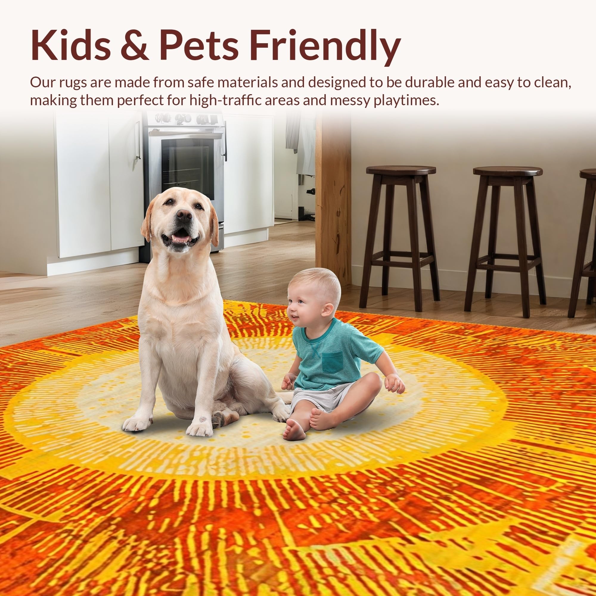 Ultra Soft Area Rug, Non Slip, Stain Resistant, Washable Area Rugs for Living Room, Bedroom, Joyful Multicolored Sun Design(Orange) Overview: