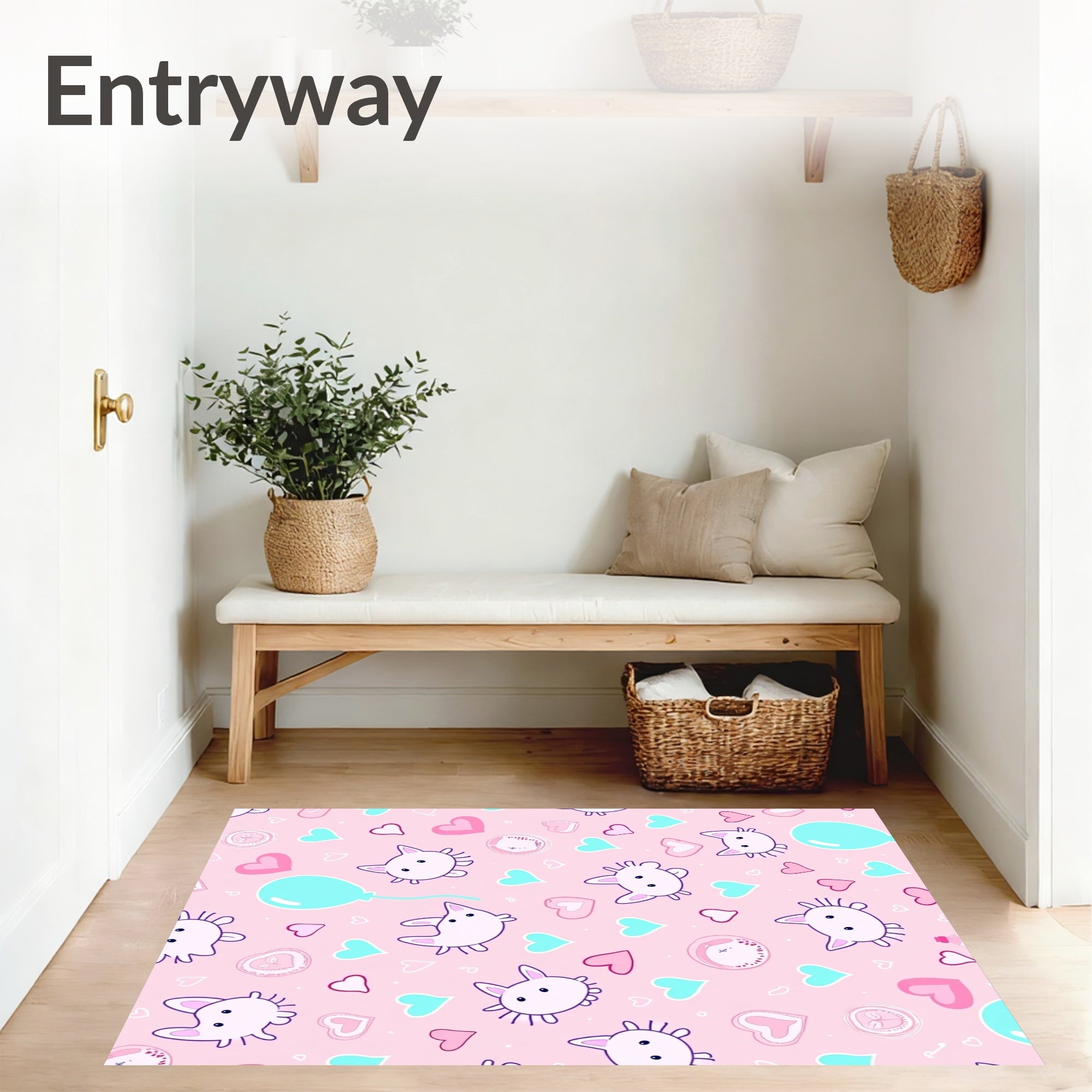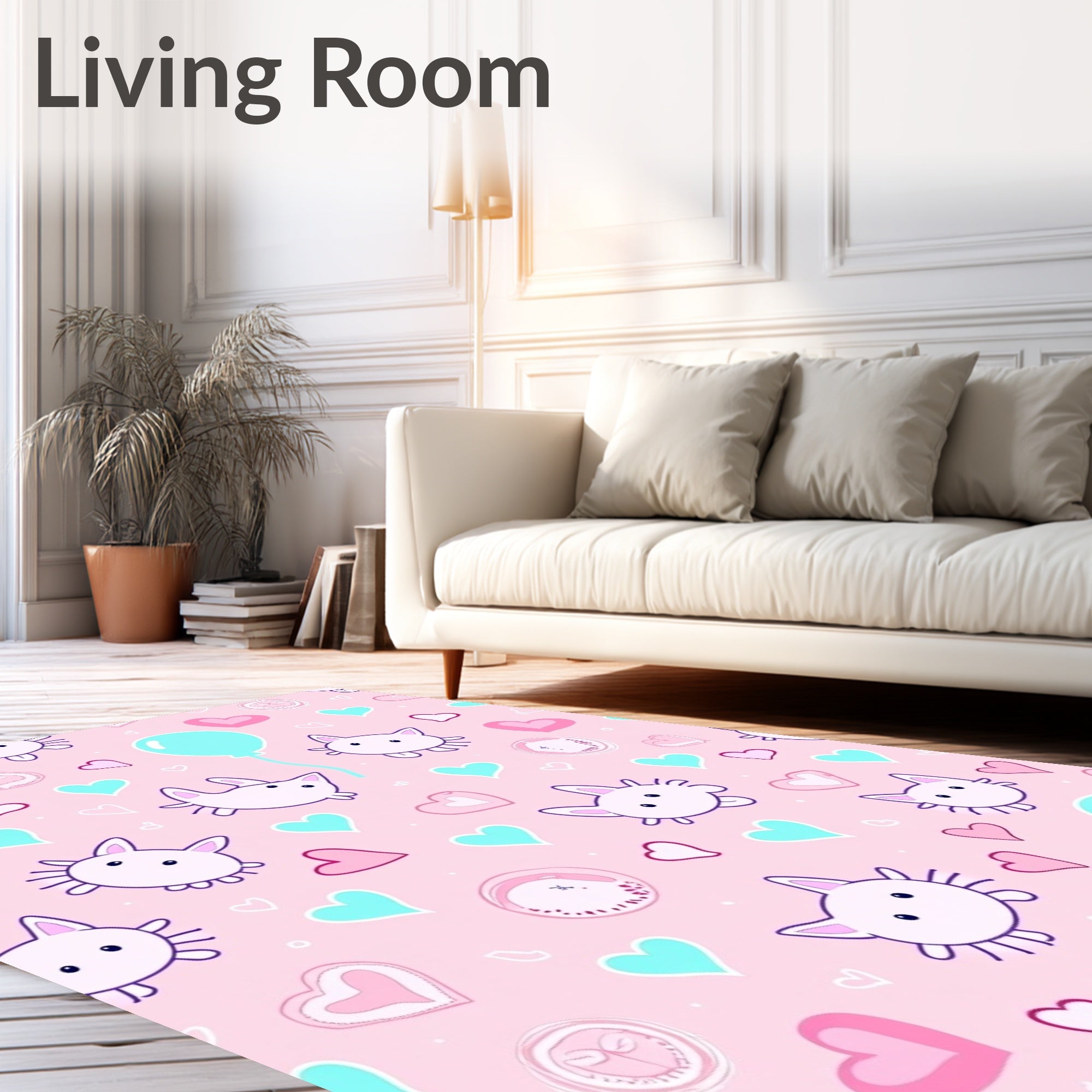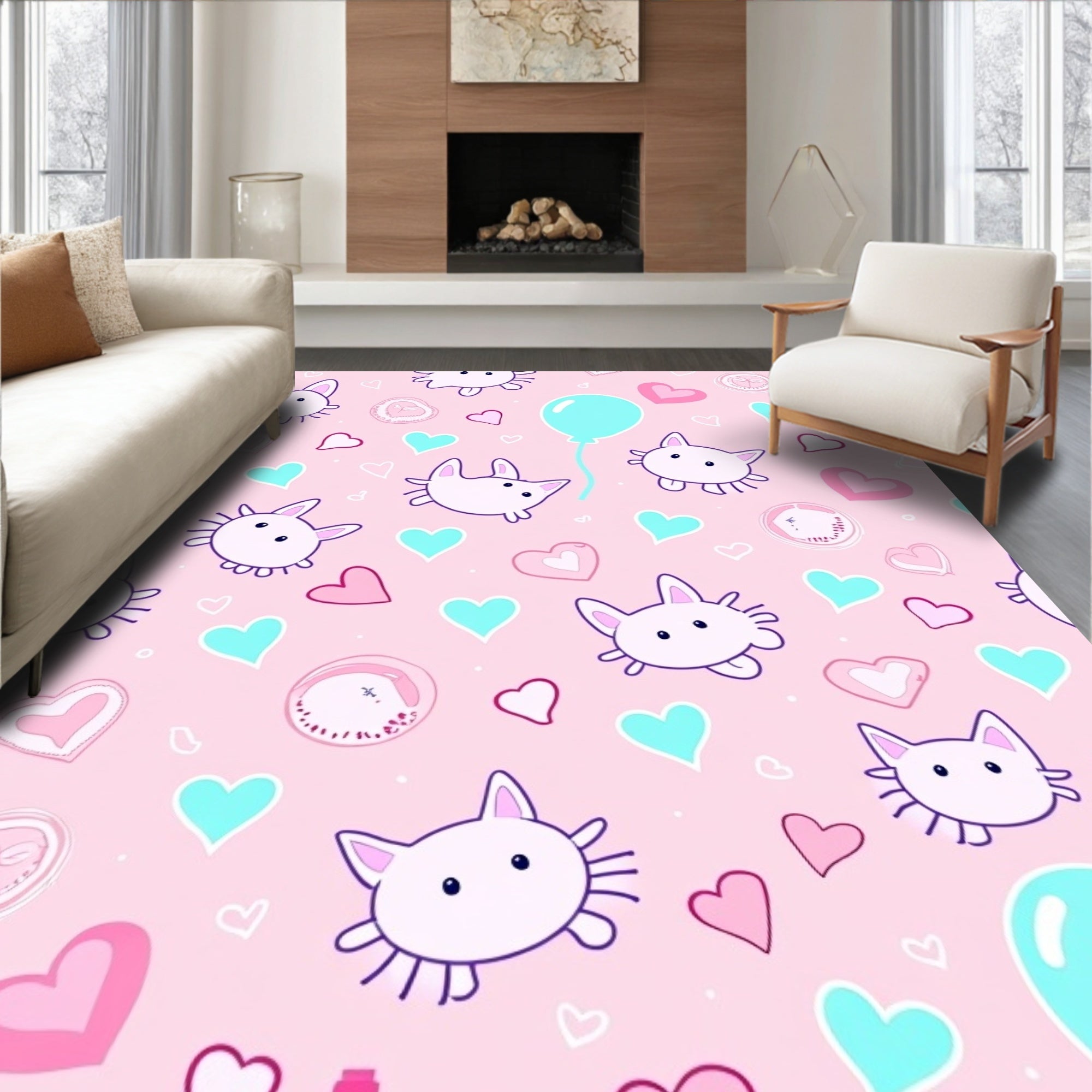 Flatwoven High Traffic Area Rug, Kawaii Kitten Collage Featuring Balloons and Doodles, Non Slip, Stain Resistant, Washable Area Rugs for Living Room, Bedroom (Pink) Overview:
