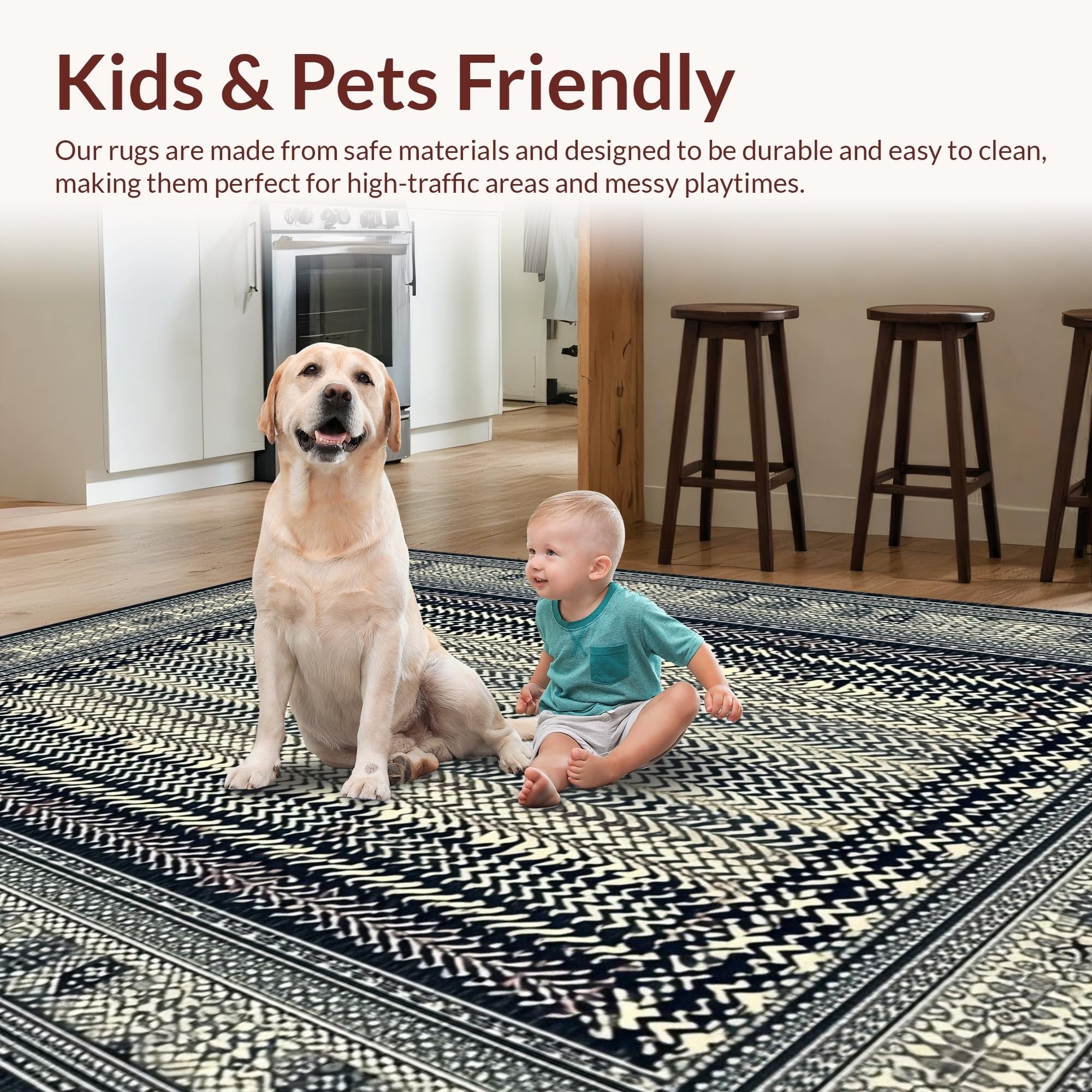 Ultra Soft Area Rug, Non Slip, Stain Resistant, Washable Area Rugs for Living Room, Bedroom, Lively Decorative Pom Pom Touch(Black) Overview: