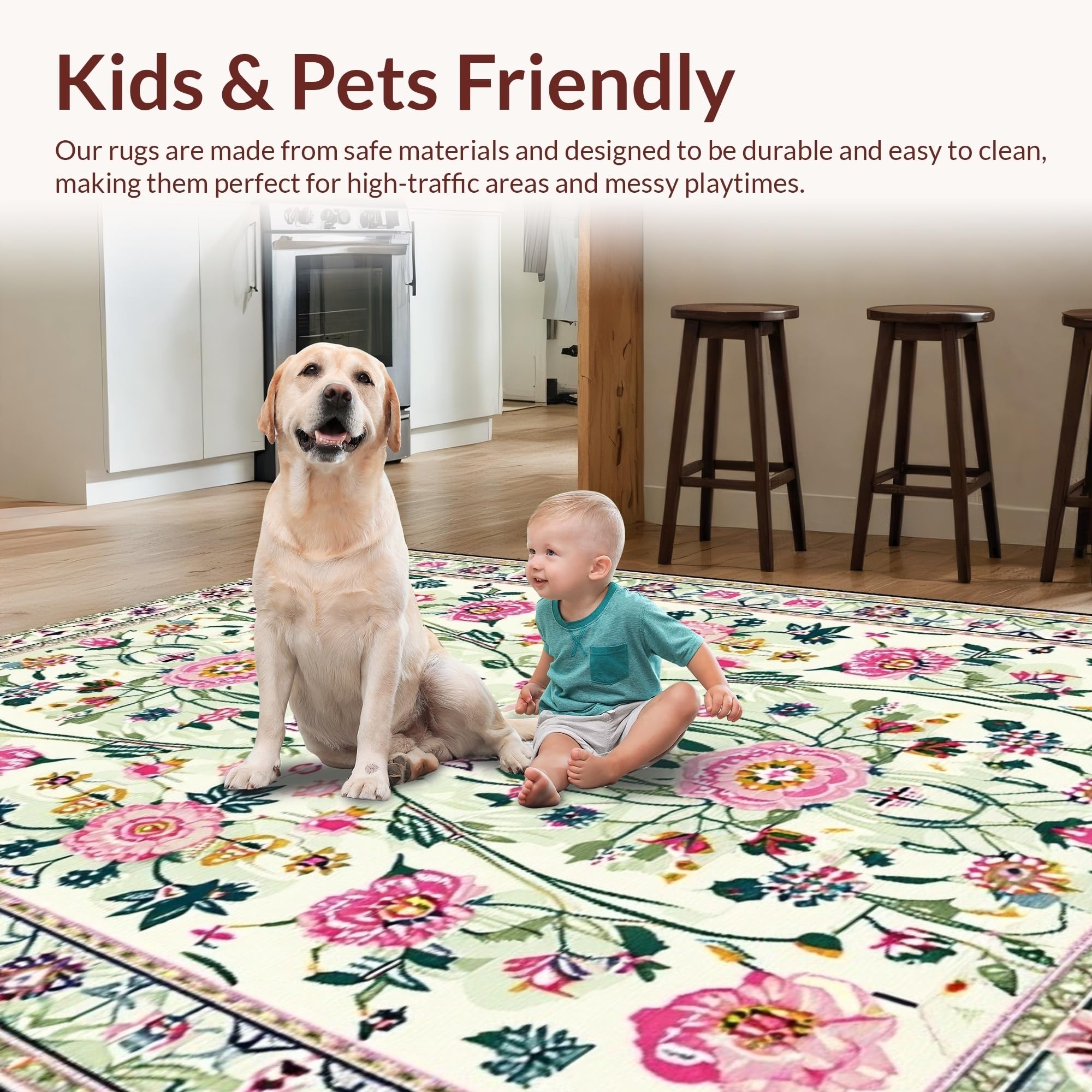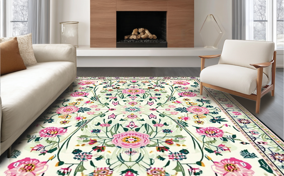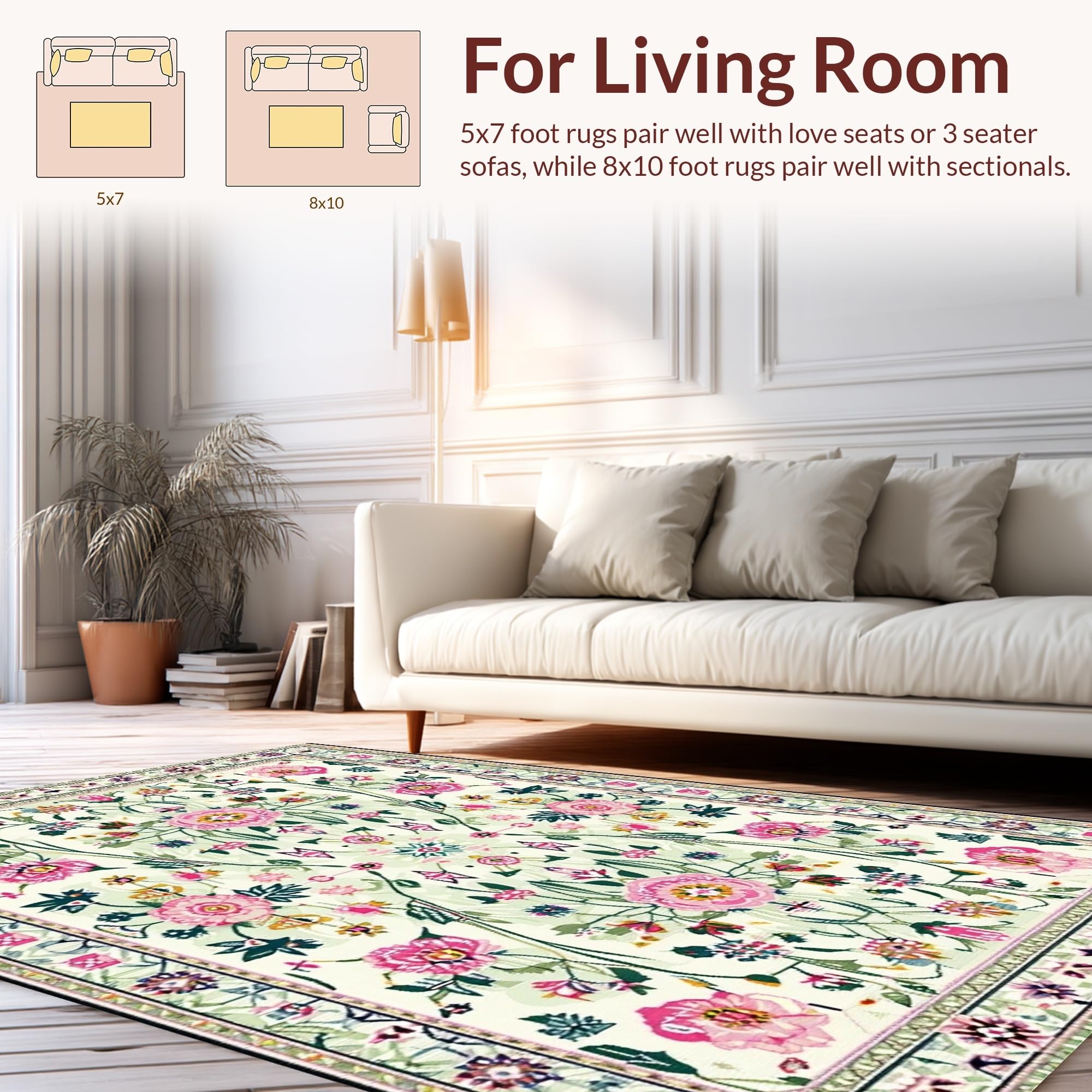 Ultra Soft Area Rug, Non Slip, Stain Resistant, Washable Area Rugs for Living Room, Bedroom, Lively Earth Tone Floral Accents(Ivory) Overview: