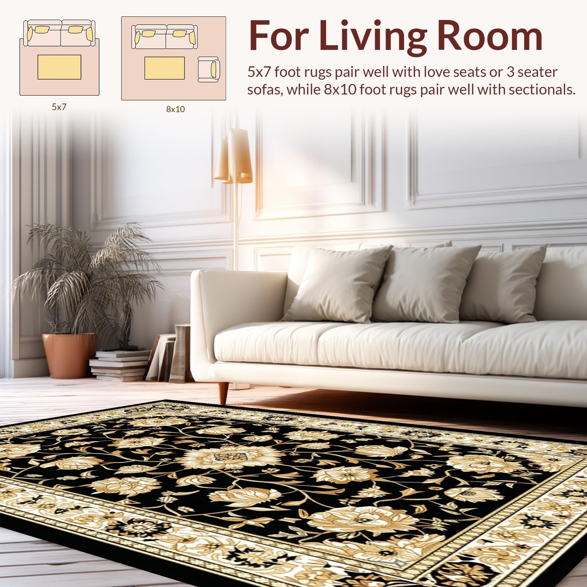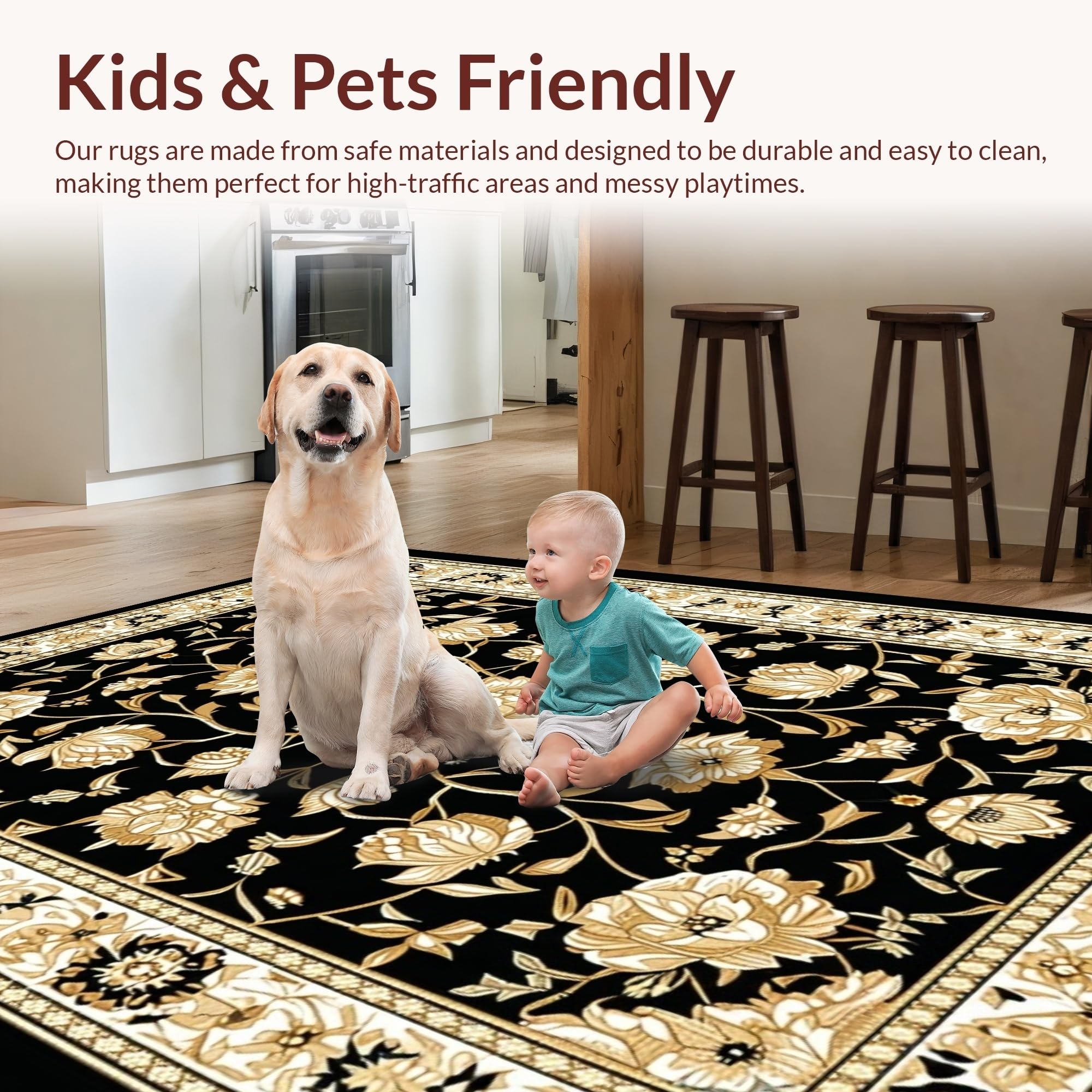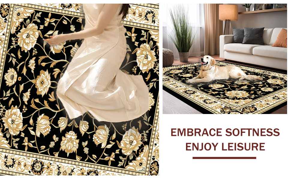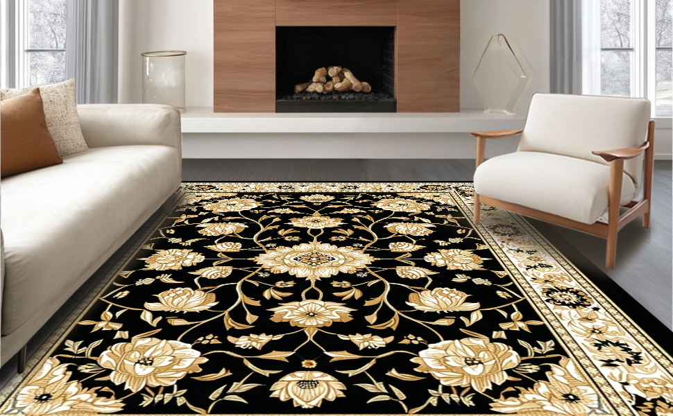 Ultra Soft Area Rug, Non Slip, Stain Resistant, Washable Area Rugs for Living Room, Bedroom, Luxe Gold Floral Aesthetic(Black) Overview: