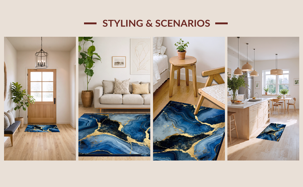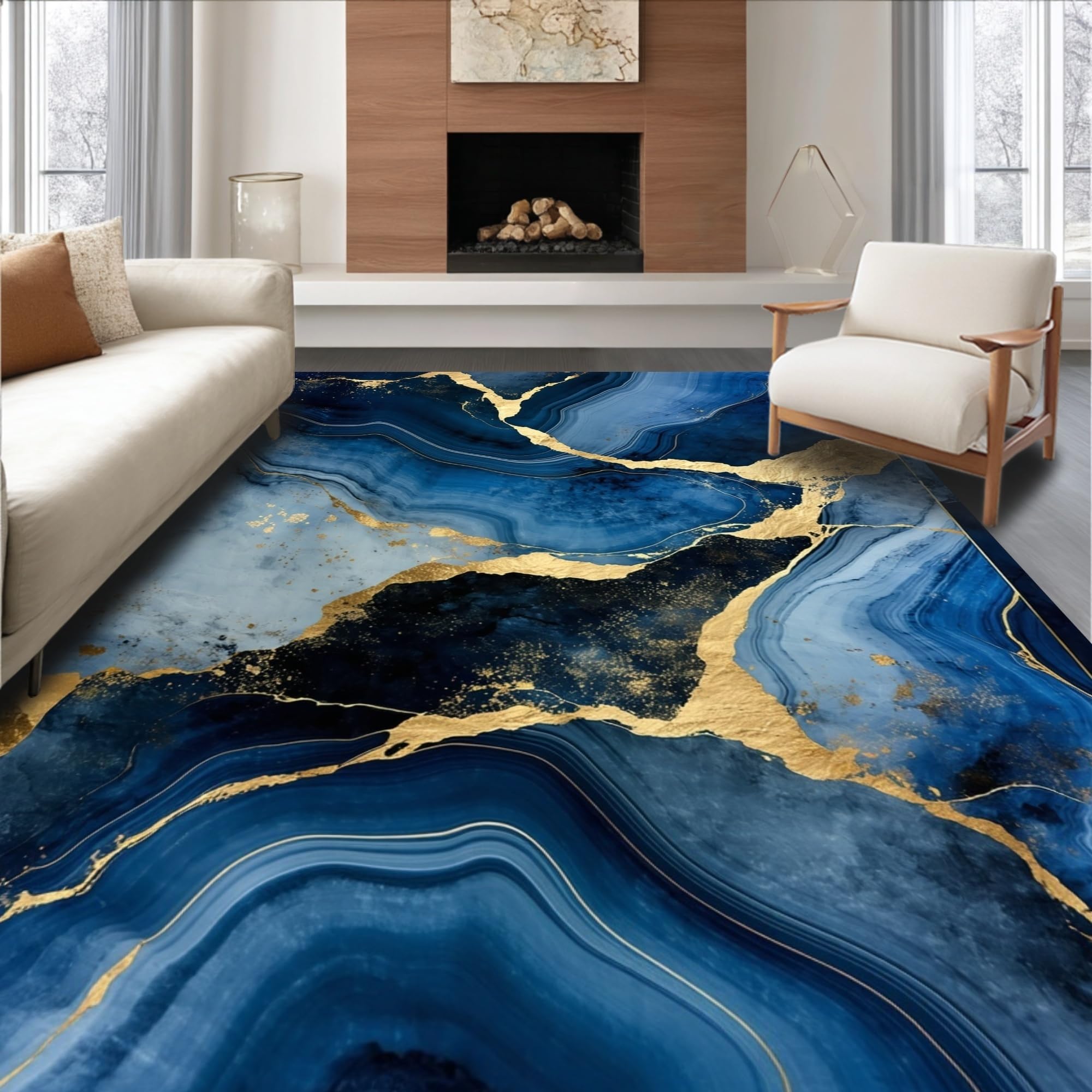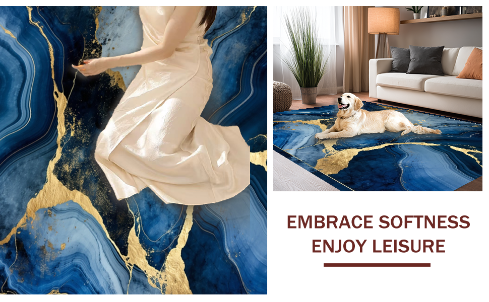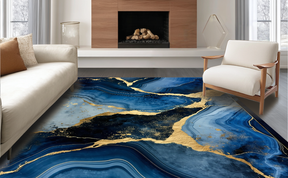 Ultra Soft Area Rug, Non Slip, Stain Resistant, Washable Area Rugs for Living Room, Bedroom, Luxurious Gold Abstract Waves(Blue) Overview: