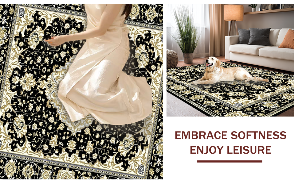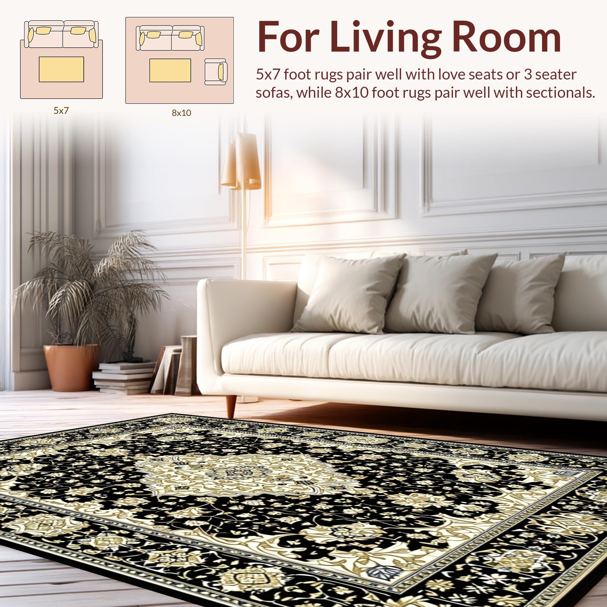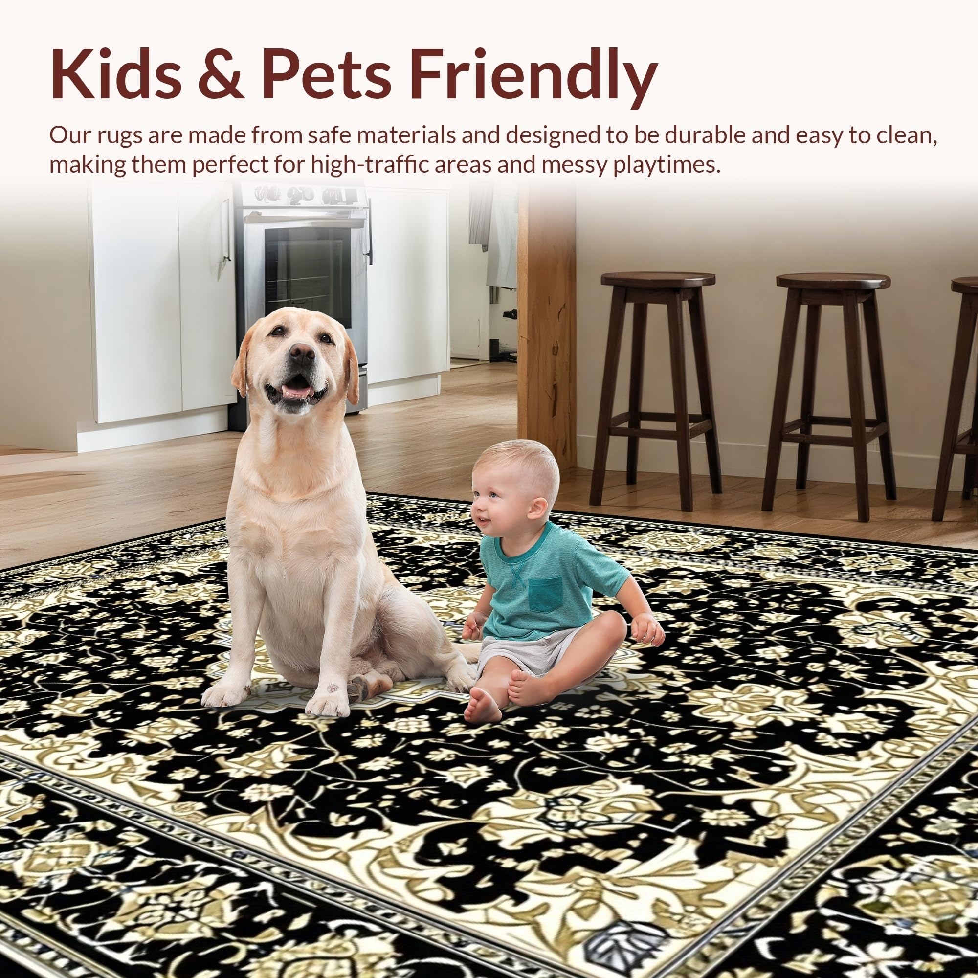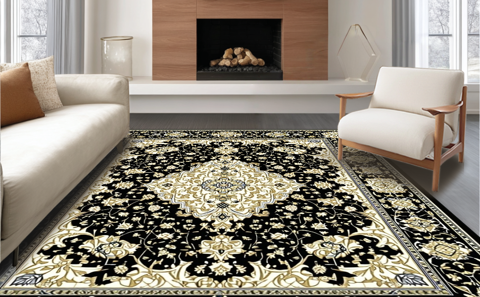 Ultra Soft Area Rug, Non Slip, Stain Resistant, Washable Area Rugs for Living Room, Bedroom, Luxurious Vintage Inspired Ornate Design(Black) Overview:
