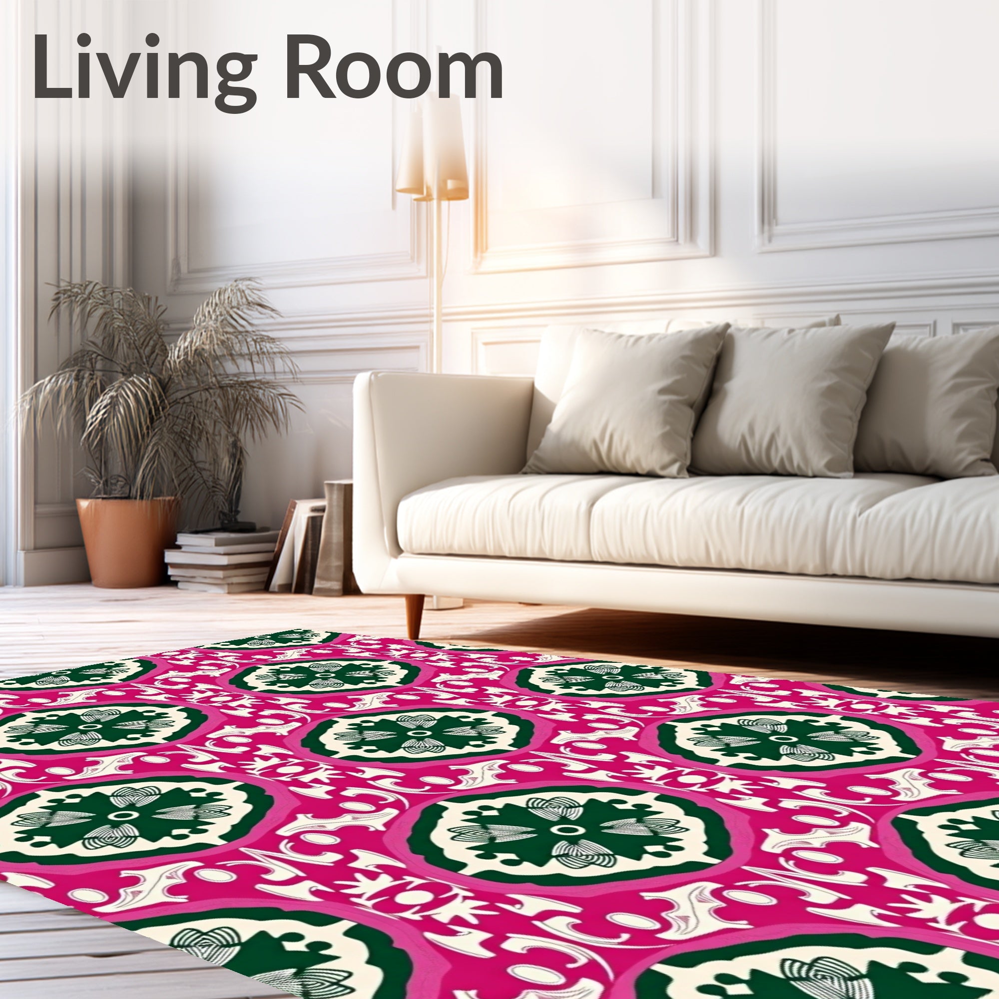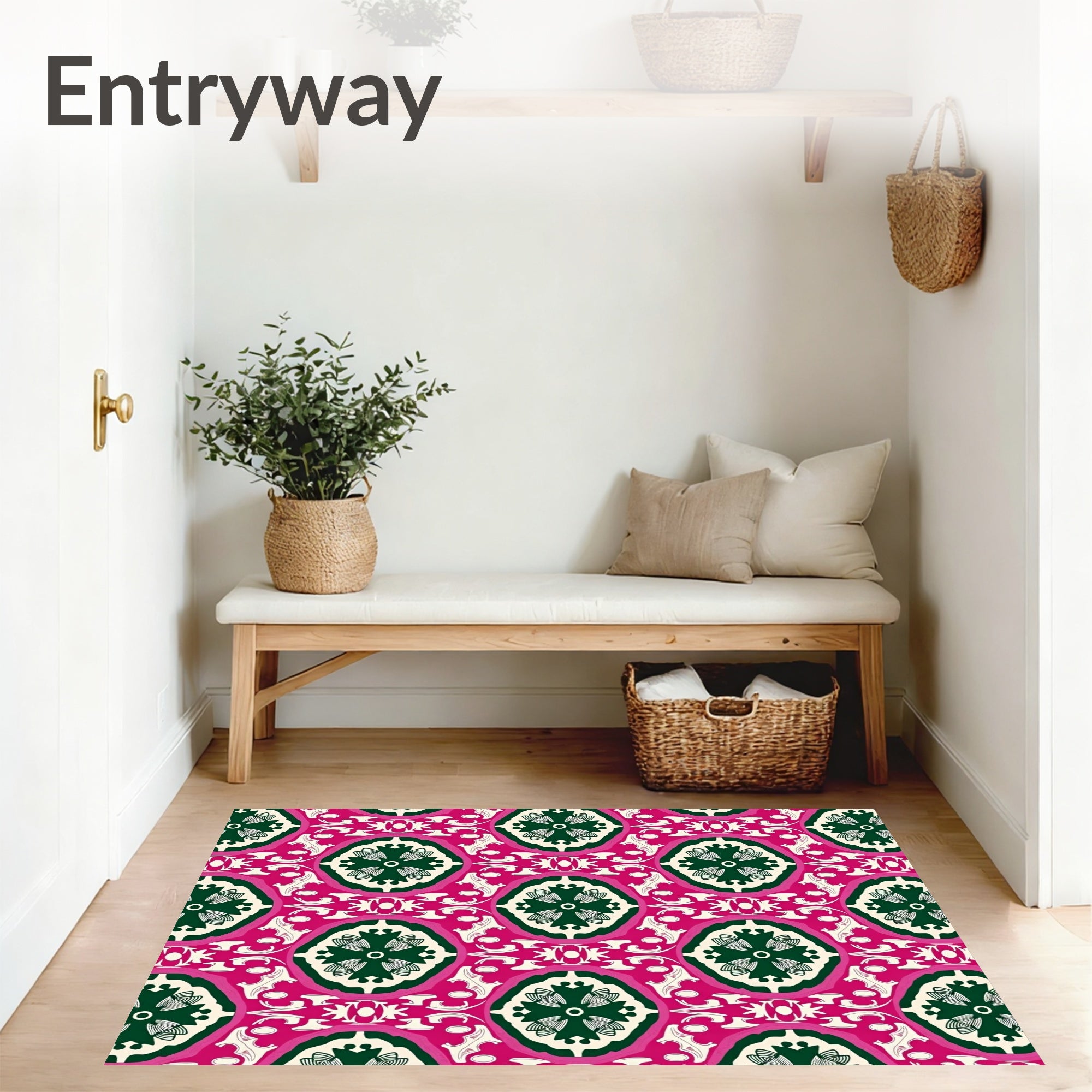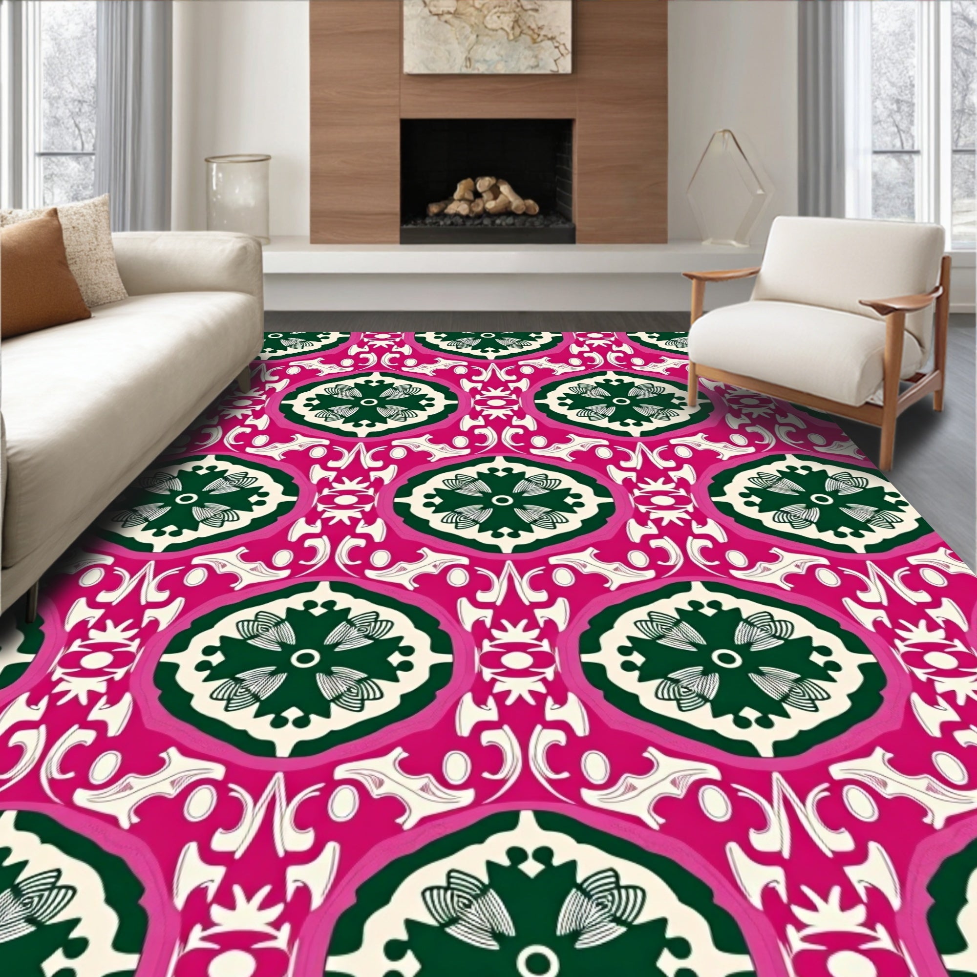 Flatwoven High Traffic Area Rug, Meadow Medallion Interlocking Motif with Vintage Botanical Flourish, Non Slip, Stain Resistant, Washable Area Rugs for Living Room, Bedroom (Pink) Overview: