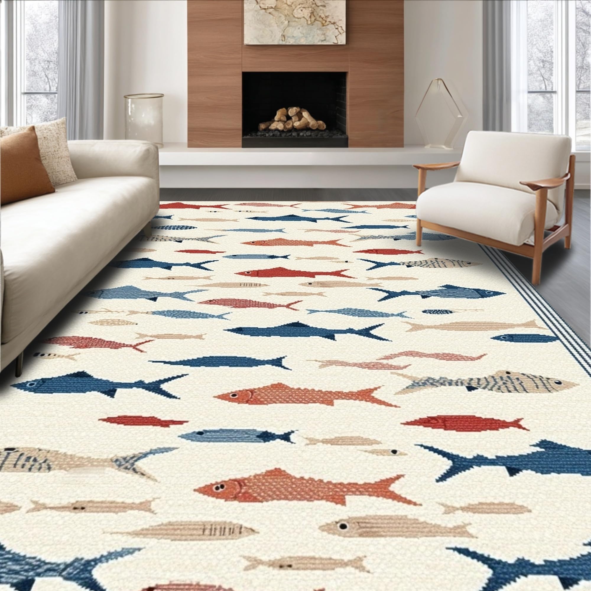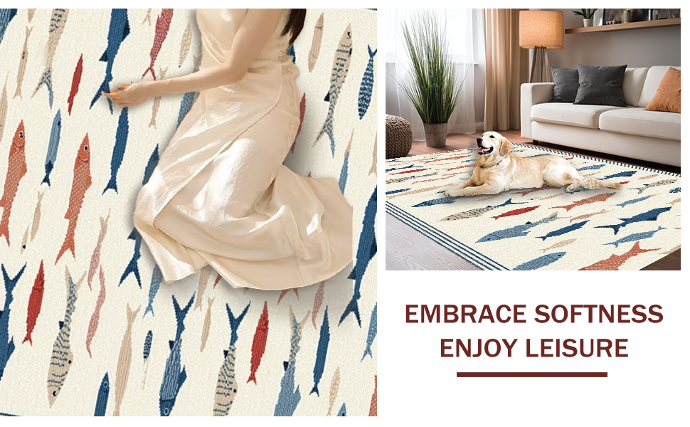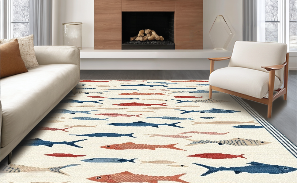 Ultra Soft Area Rug, Non Slip, Stain Resistant, Washable Area Rugs for Living Room, Bedroom, Minimalist Colorful Marine Design Element(Beige) Overview: