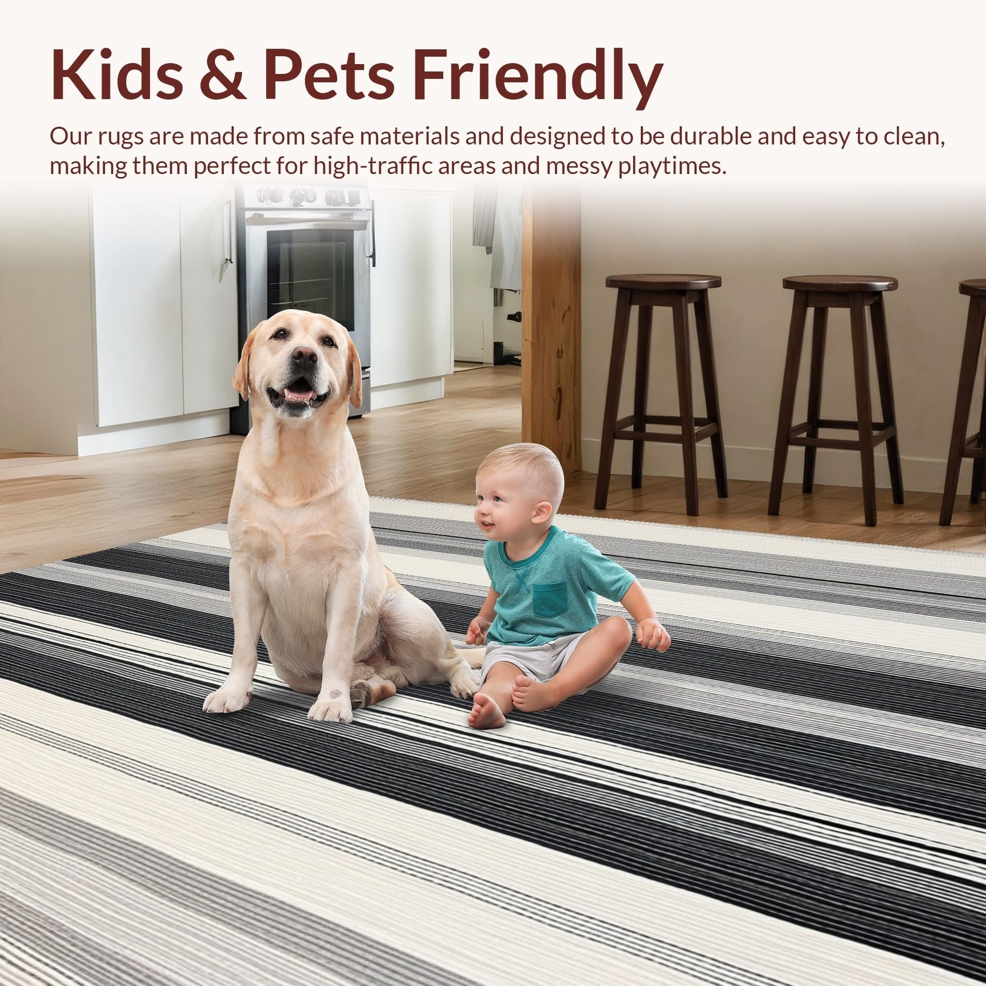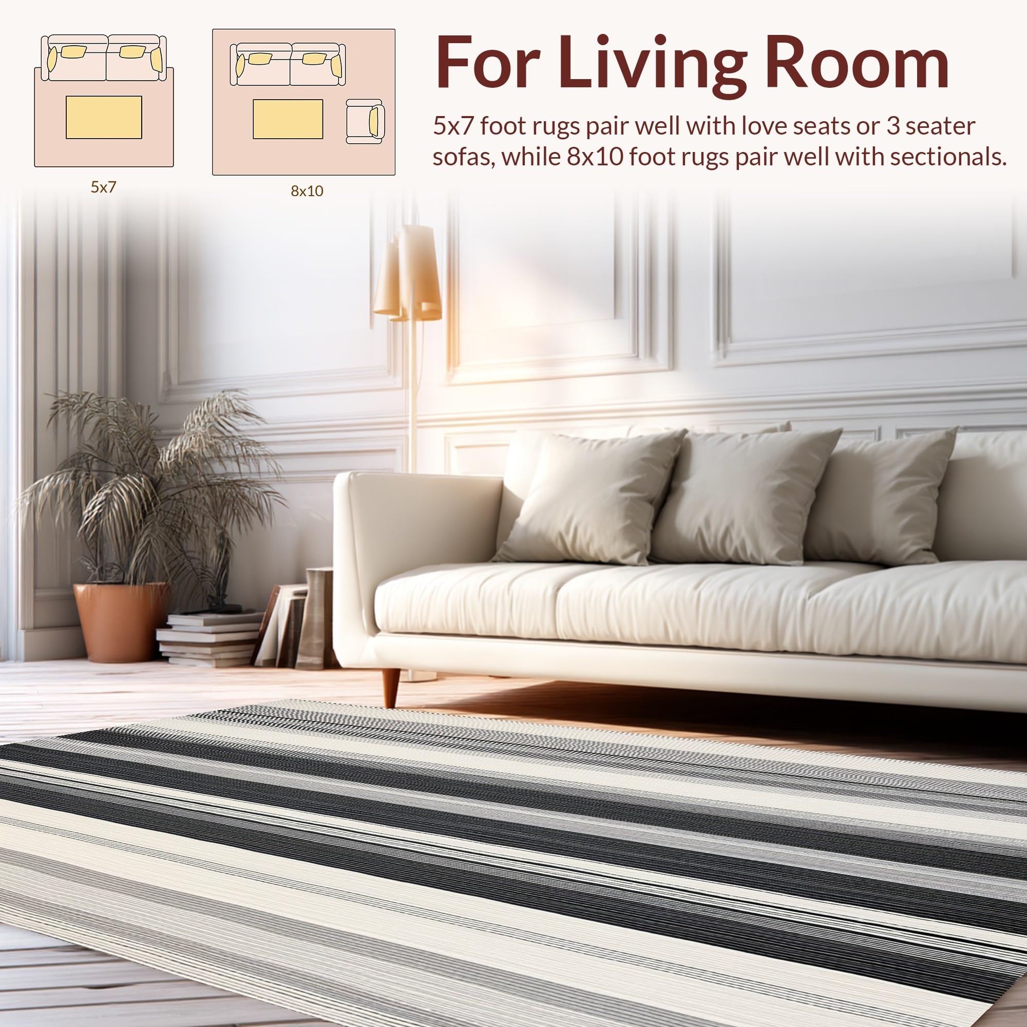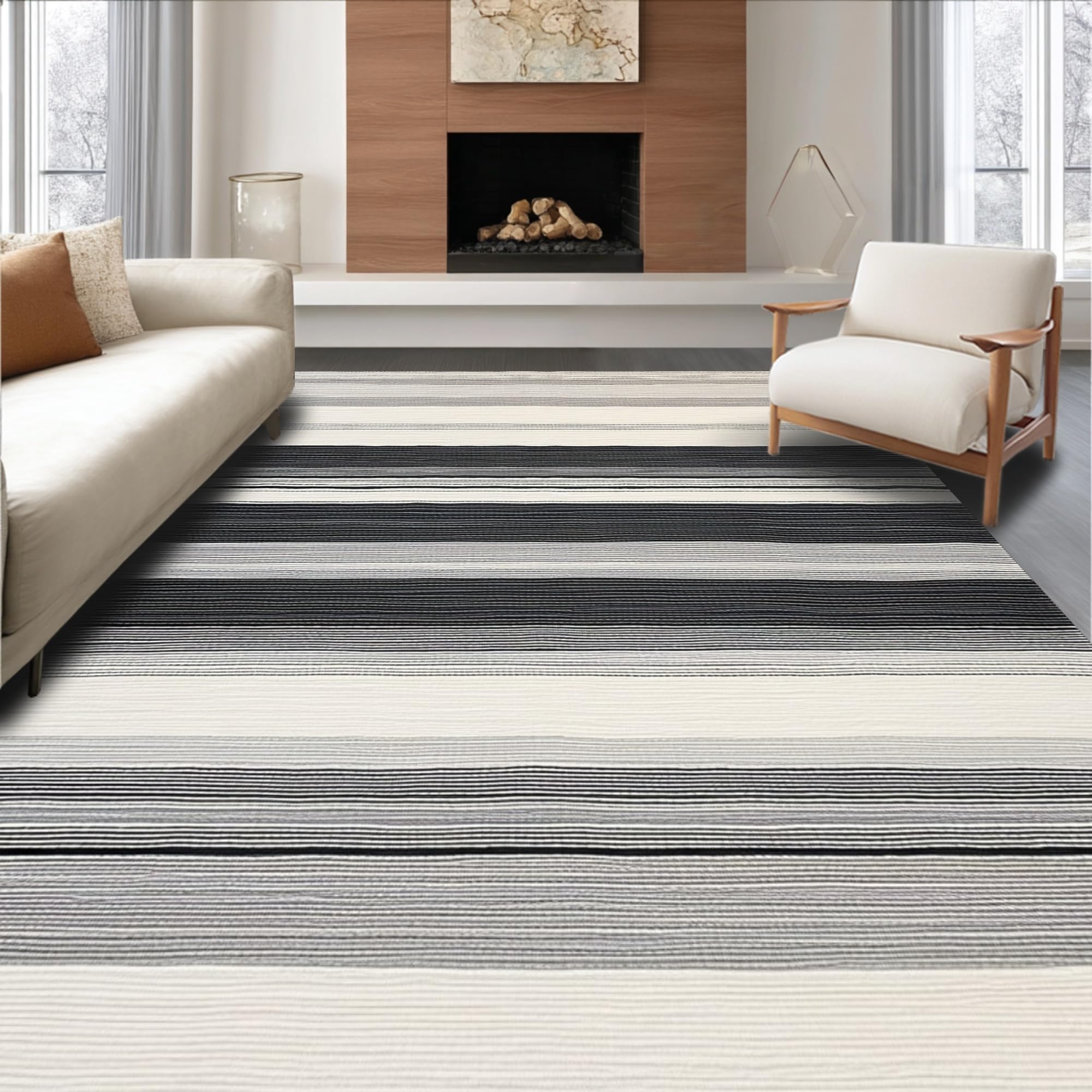 Ultra Soft Area Rug, Non Slip, Stain Resistant, Washable Area Rugs for Living Room, Bedroom, Minimalist Layered Stripe Pattern Rug with Crisp Black and White Color Blocks(Gray) Overview:
