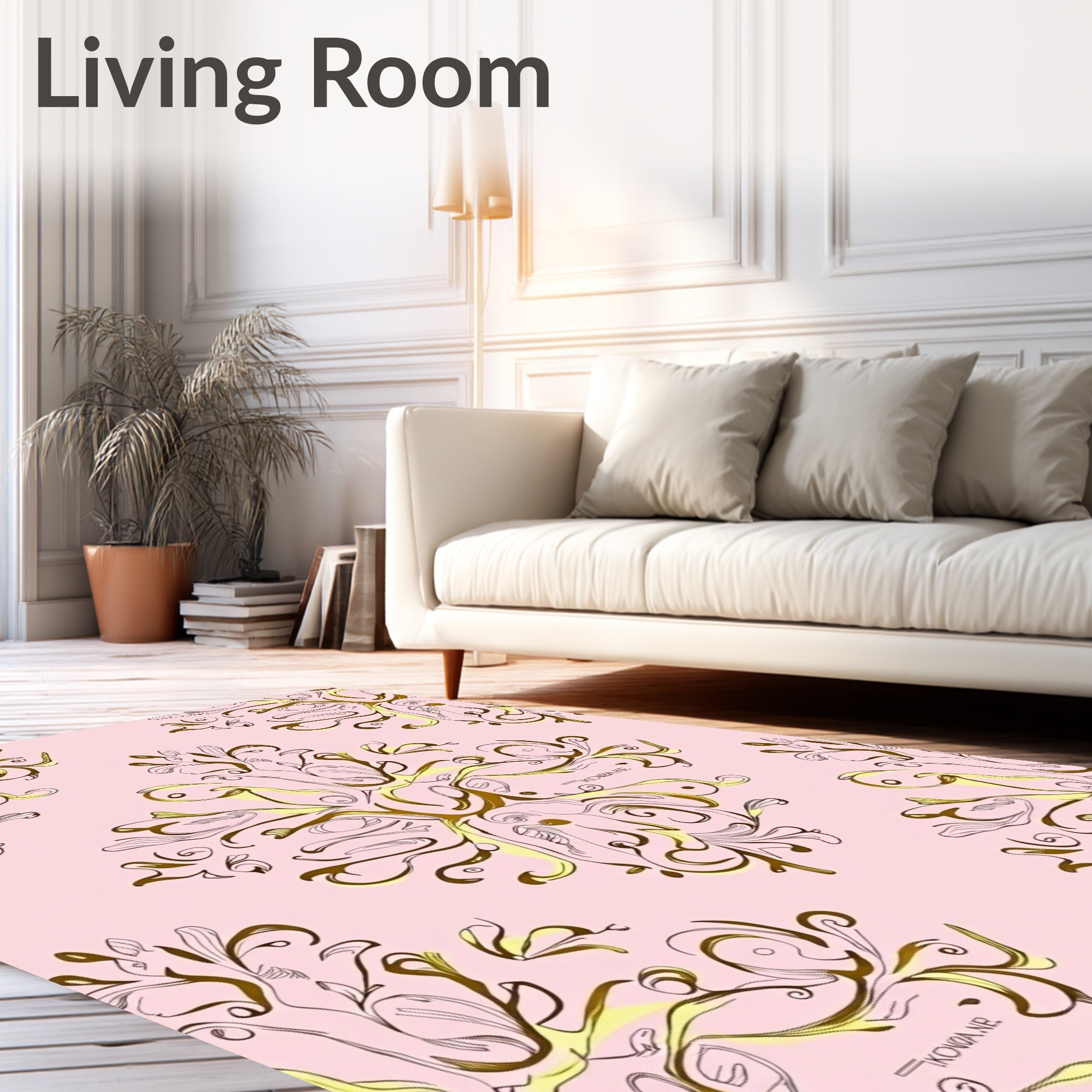 Flatwoven High Traffic Area Rug, Modern Floral Scroll with Gilded Baroque Highlights, Non Slip, Stain Resistant, Washable Area Rugs for Living Room, Bedroom (Pink) Overview: