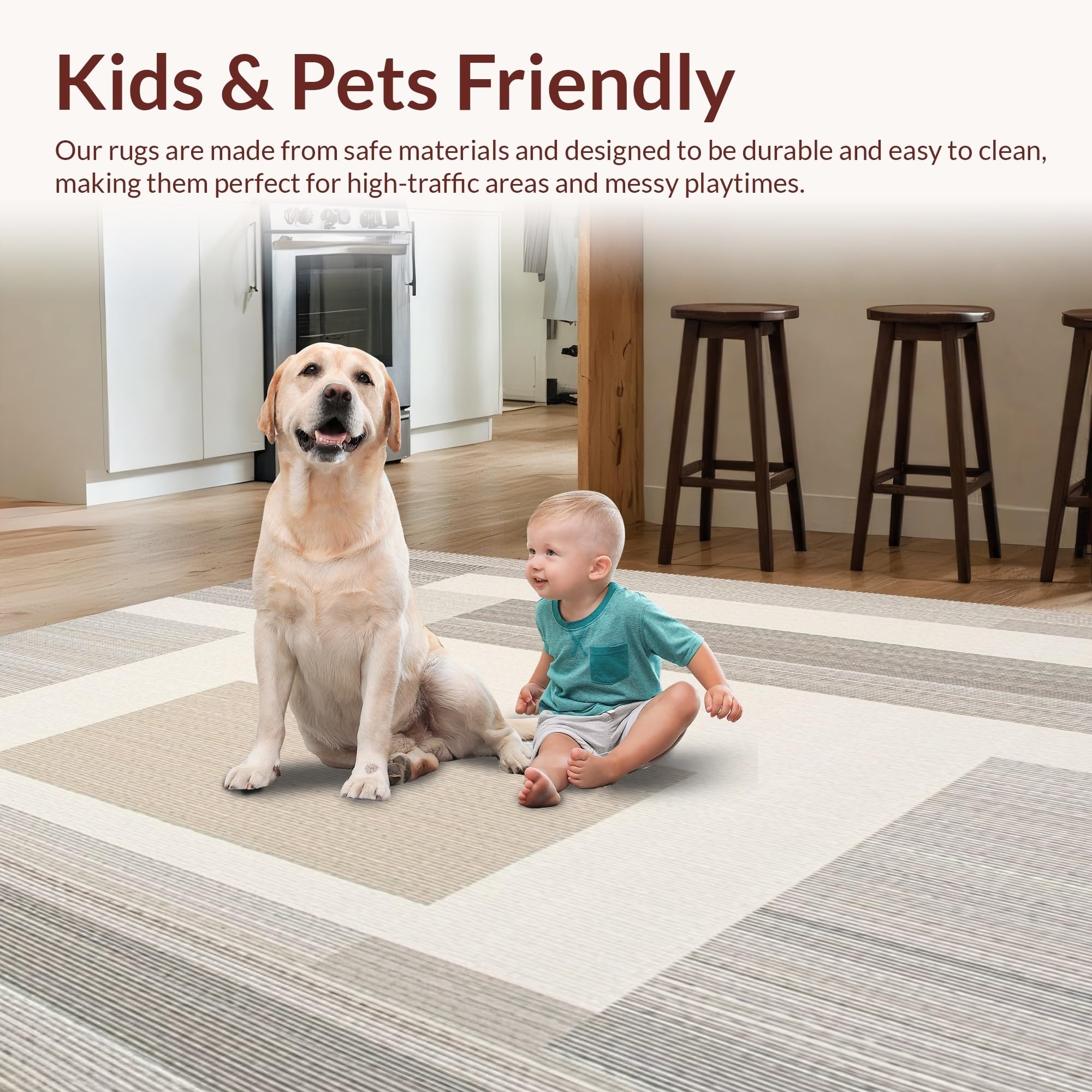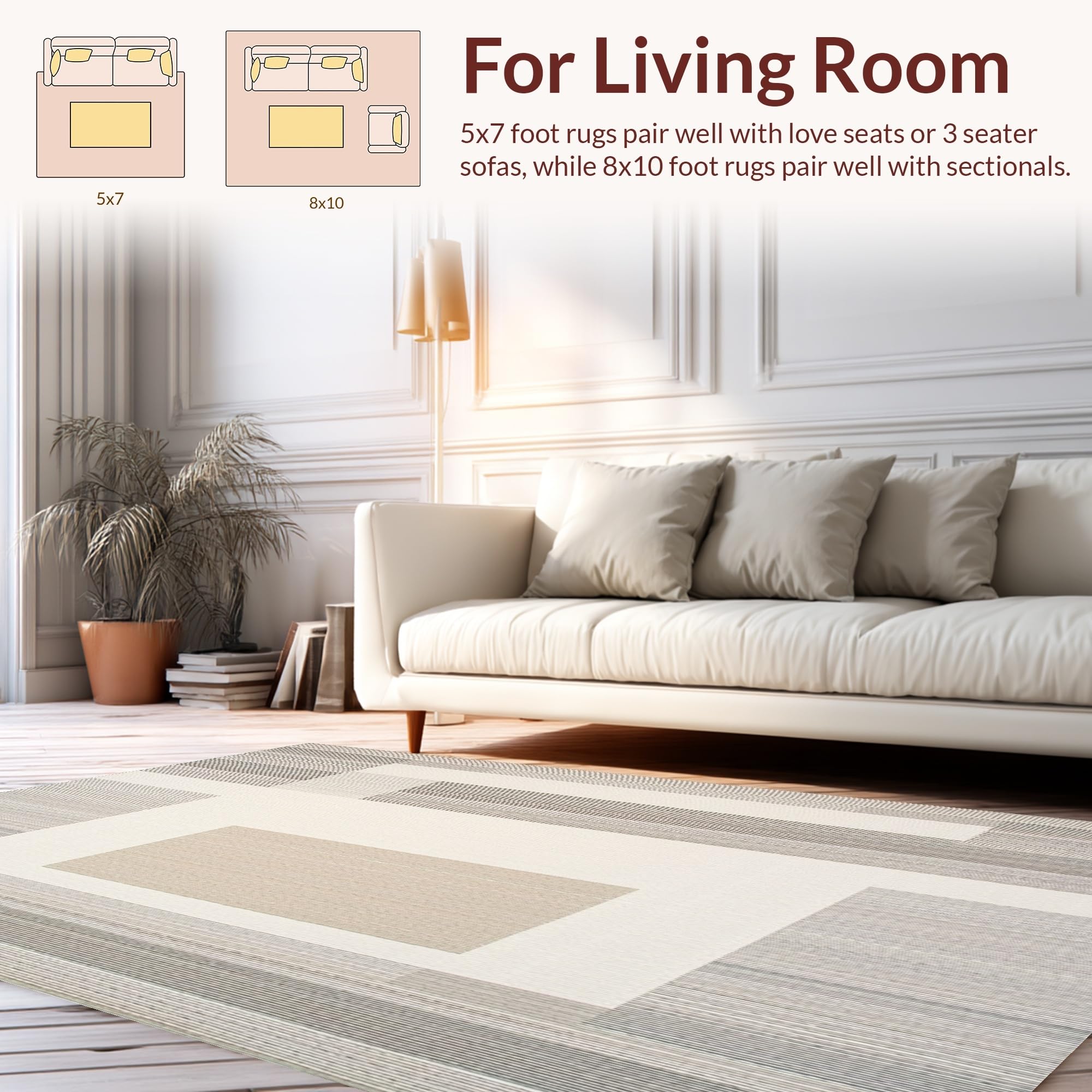 Ultra Soft Area Rug, Non Slip, Stain Resistant, Washable Area Rugs for Living Room, Bedroom, Modern Geometric Stripe Area Beige & Light Grey Contemporary Design(Gray) Overview: