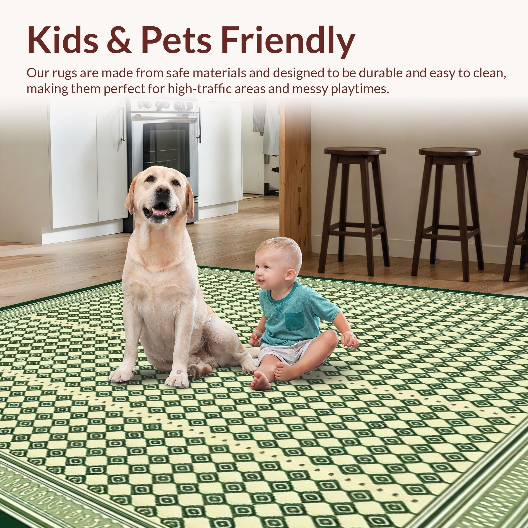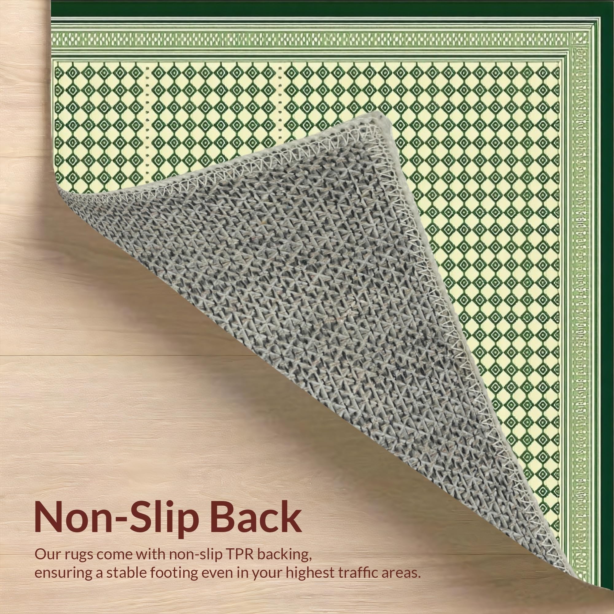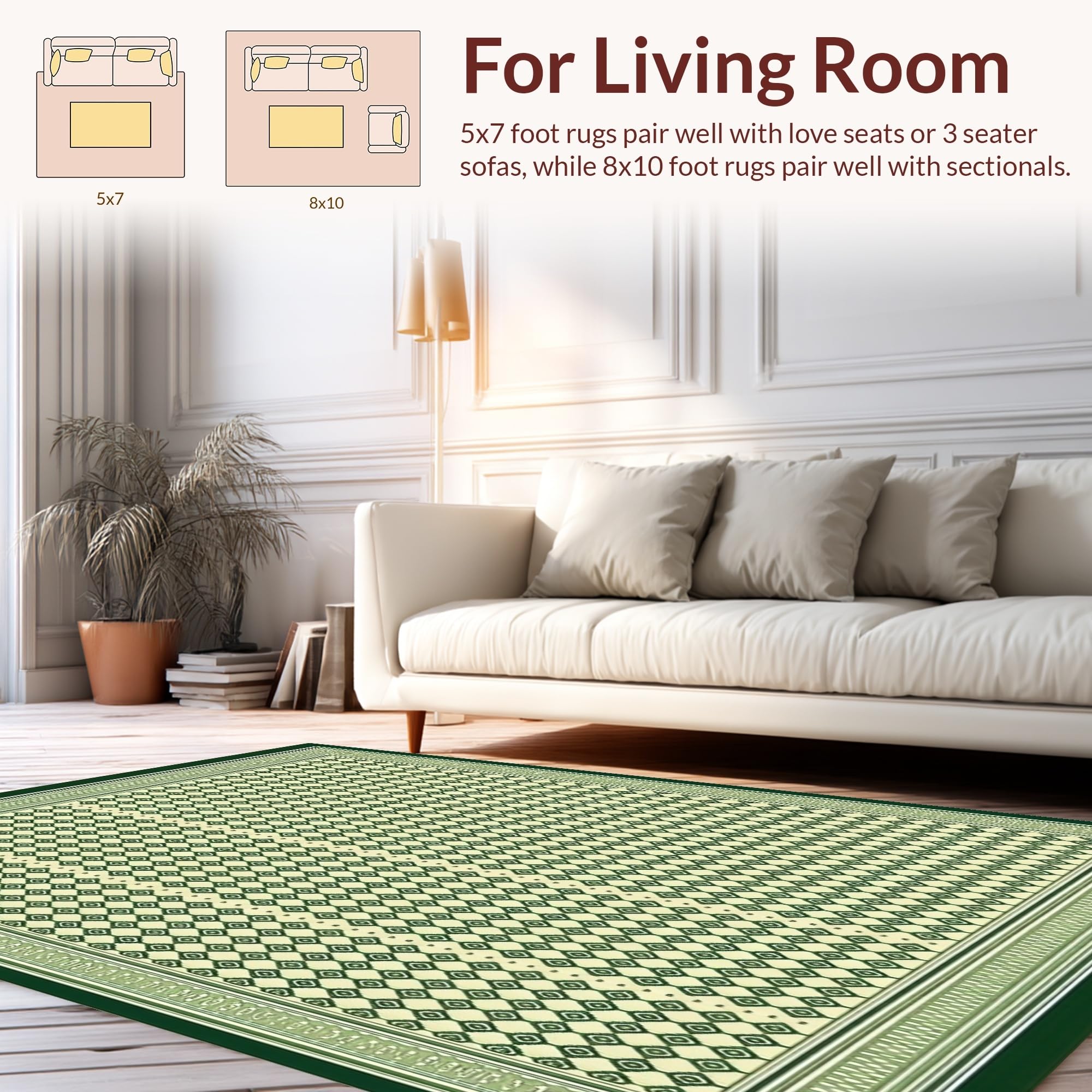 Ultra Soft Area Rug, Non Slip, Stain Resistant, Washable Area Rugs for Living Room, Bedroom, Modern Green Beige Lattice Area with Layered Diamond and Square Motifs(Green) Overview: