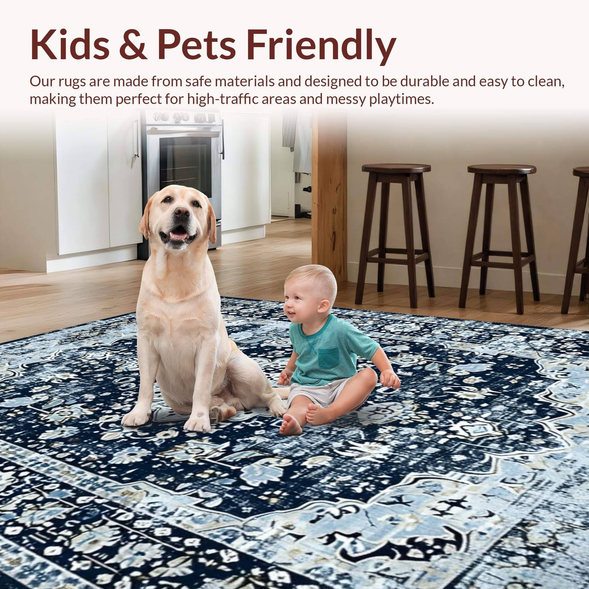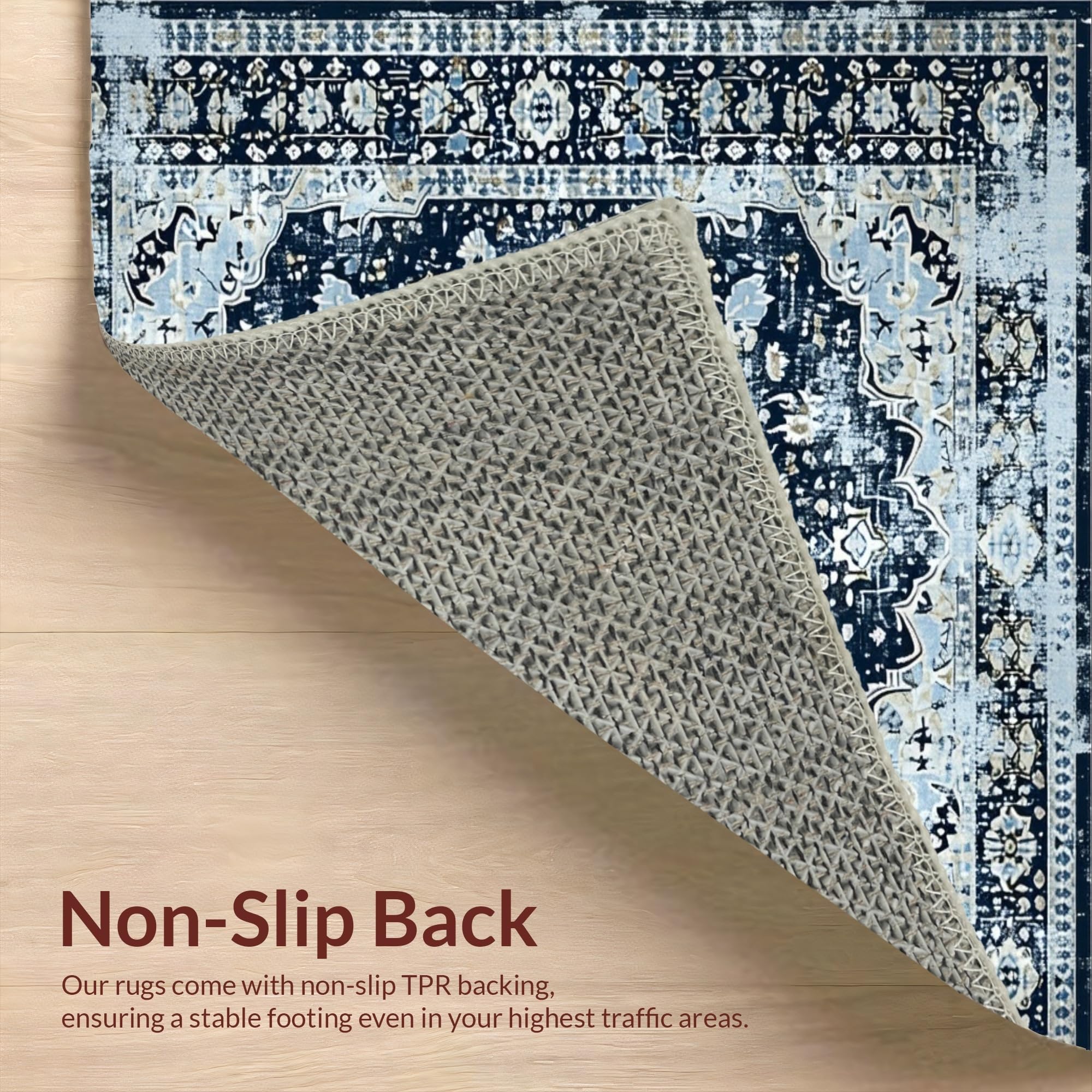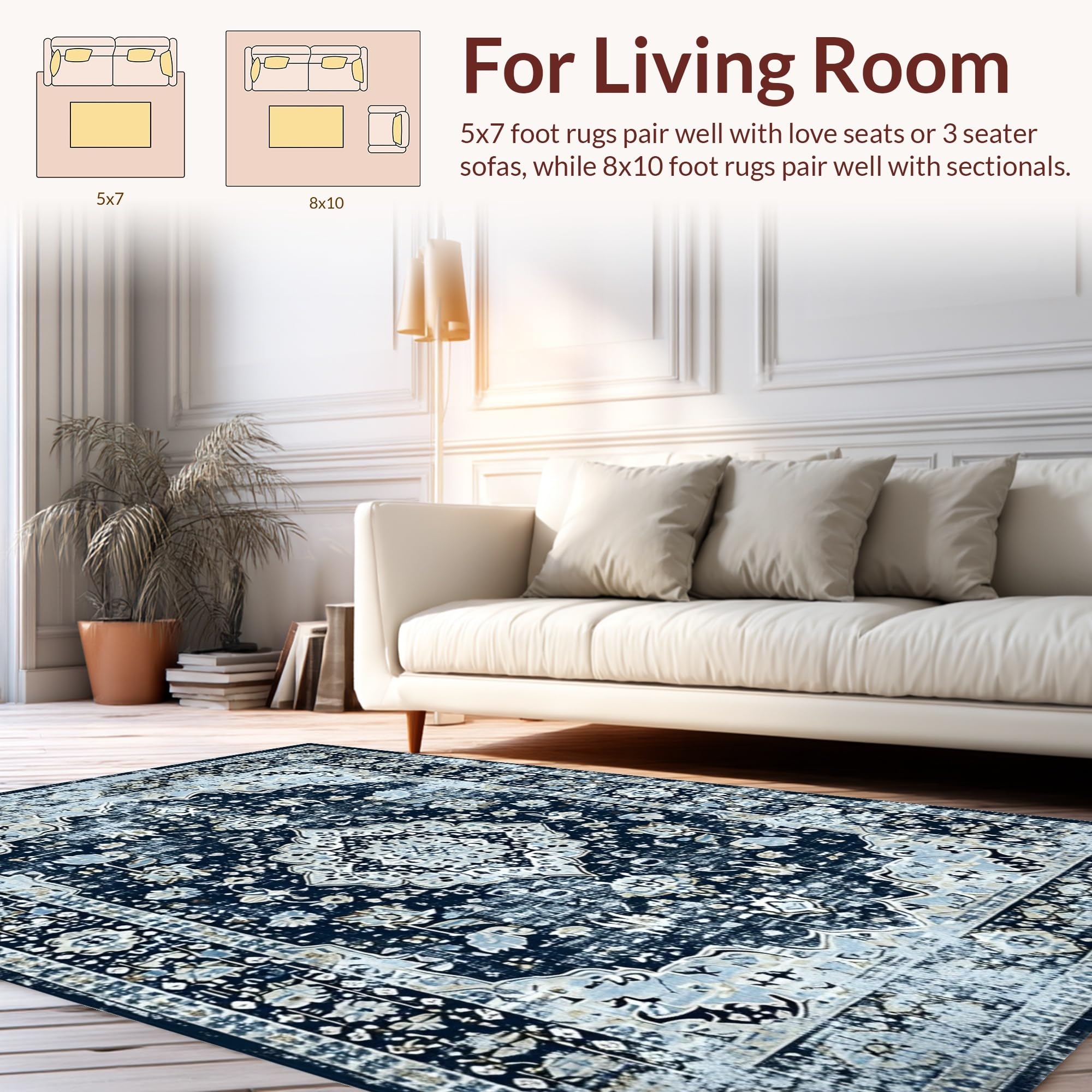 Ultra Soft Area Rug, Non Slip, Stain Resistant, Washable Area Rugs for Living Room, Bedroom, Navy Toned Vintage Floral Motif(Blue) Overview: