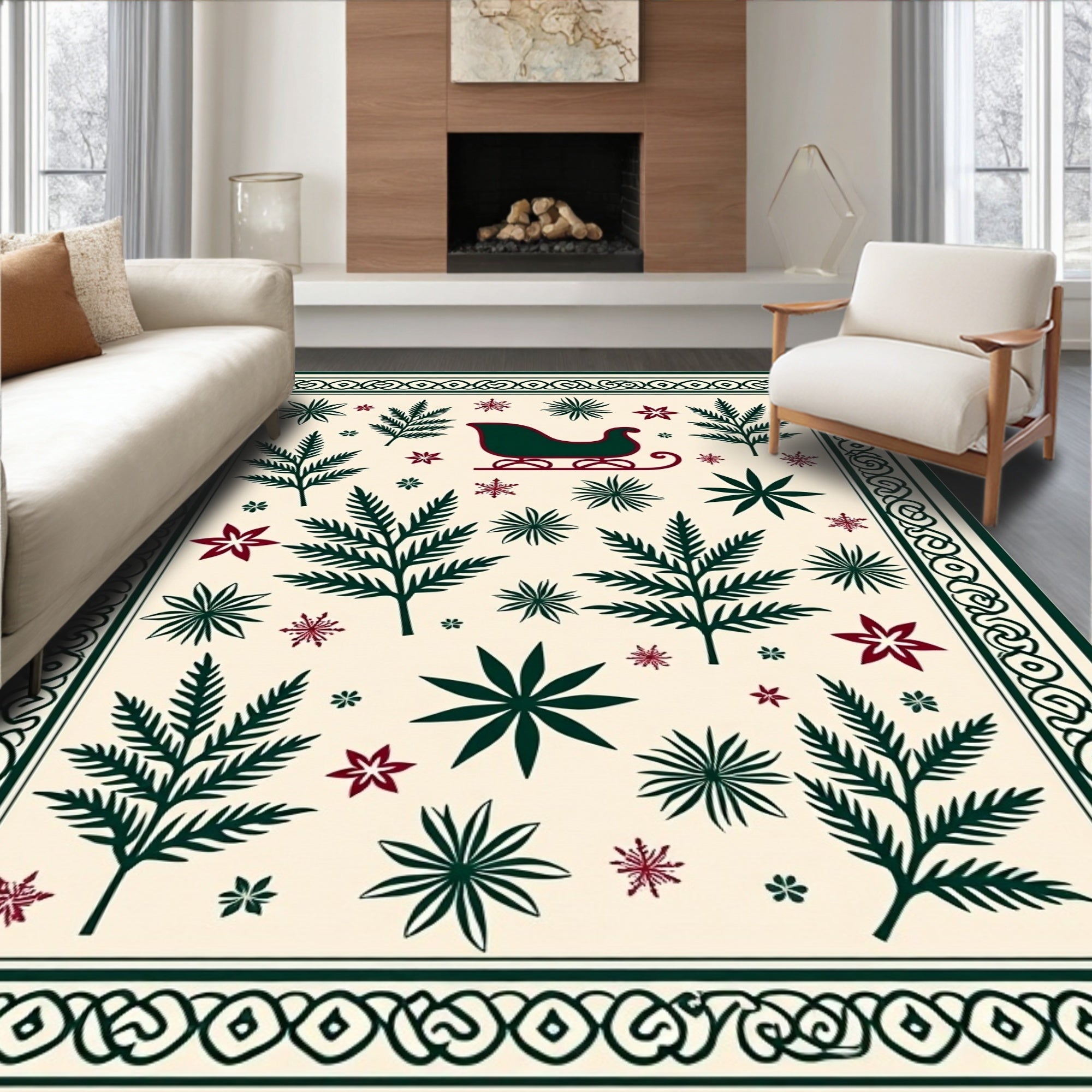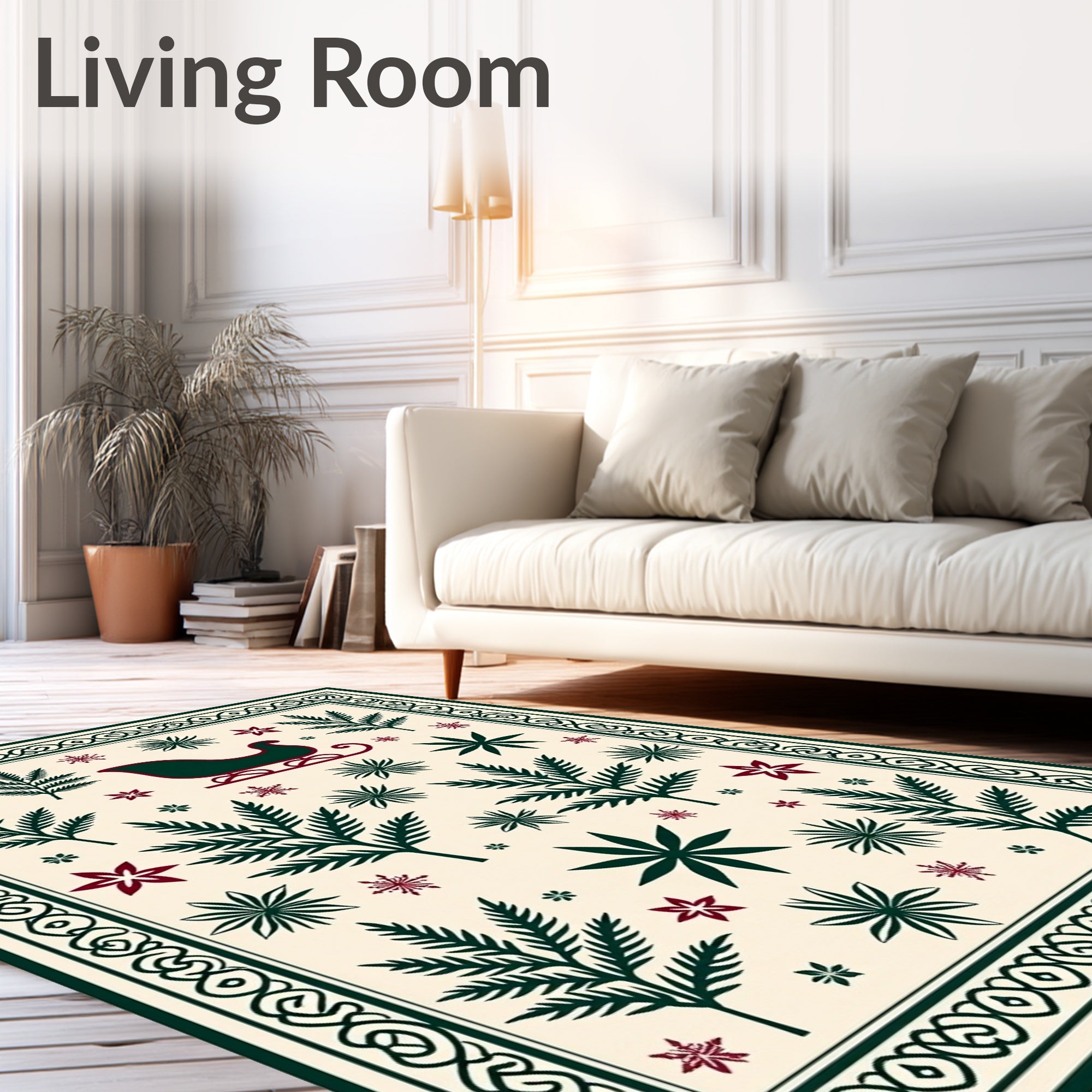 Ultra Soft Area Rug, Non Slip, Stain Resistant, Washable Area Rugs for Living Room, Bedroom, Nordic Fir Branch Sleigh Journey Celebration Design(Ivory) Overview: