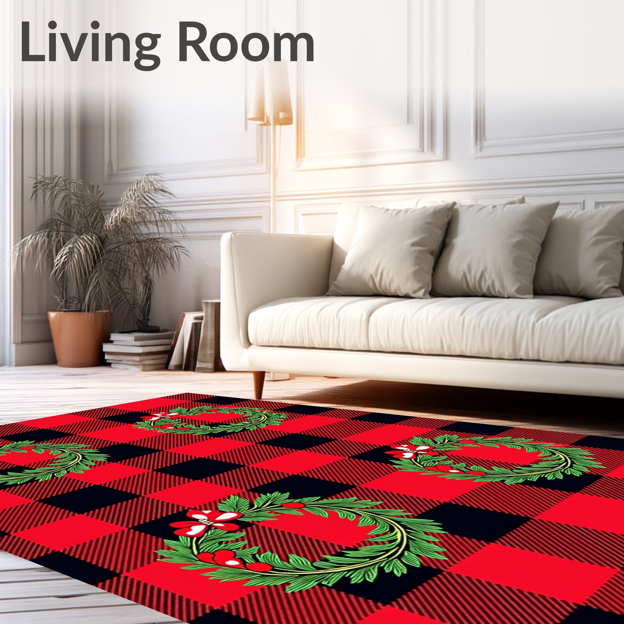 Ultra Soft Area Rug, Non Slip, Stain Resistant, Washable Area Rugs for Living Room, Bedroom, Nordic Inspired Buffalo Check with Festive Wreath Embellishments(Red) Overview: